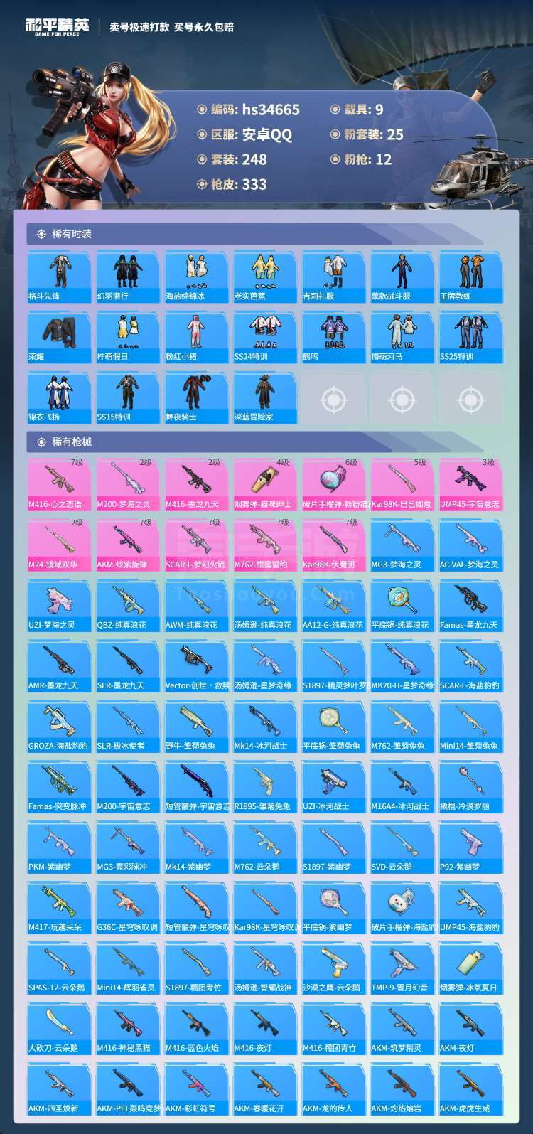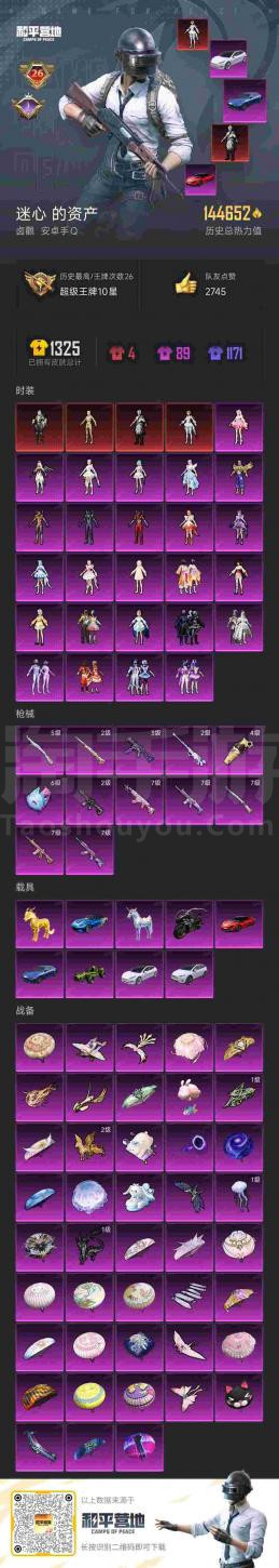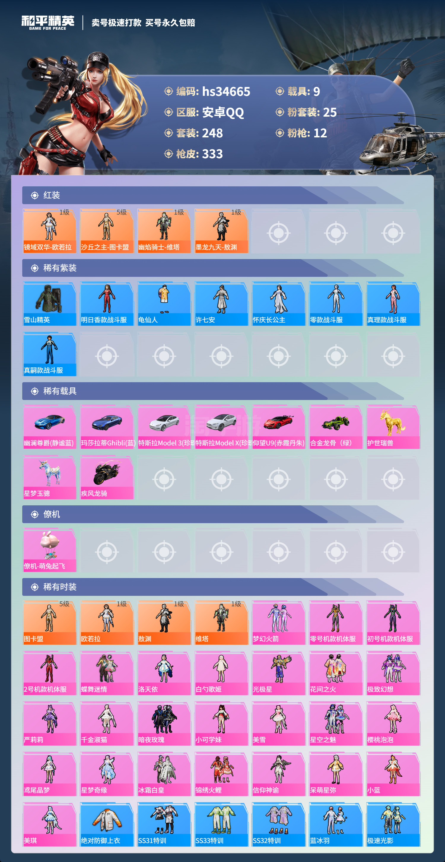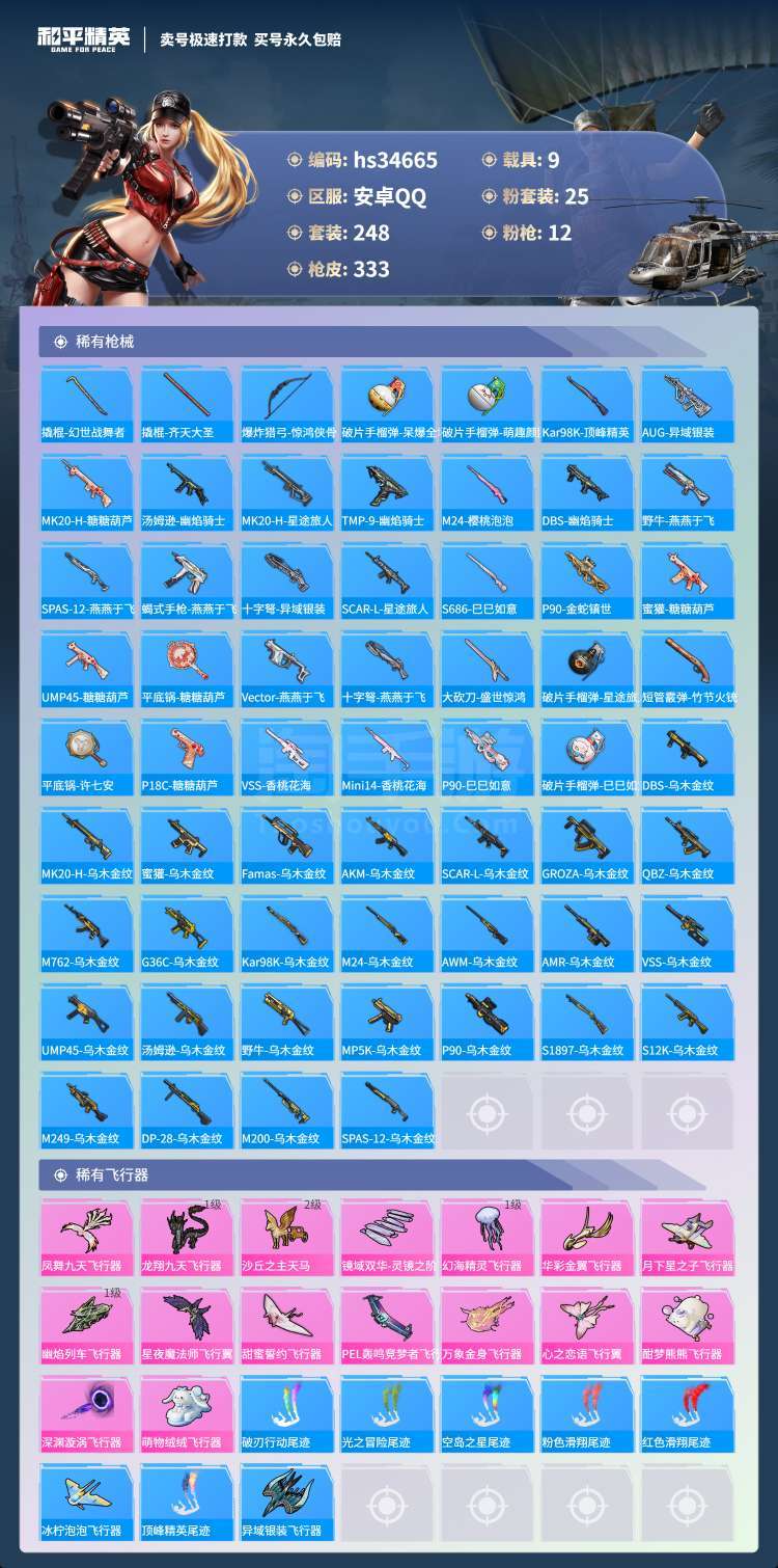 hs34665 安卓手Q-26王牌印记-25粉装-12特效枪-9载具-144832热力值-248套装