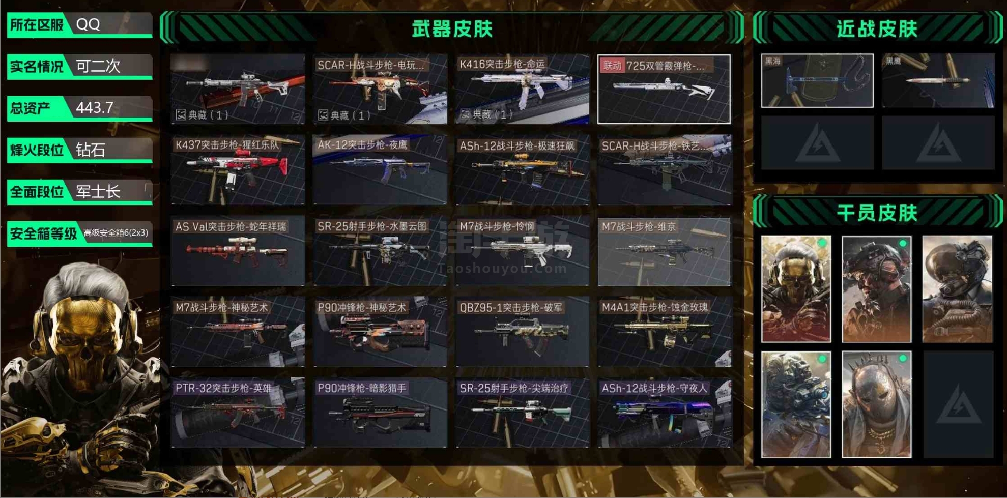 QQ登陆-【总资产 m:443.7 哈夫币 地带段位:钻石 典藏外观: 步枪:68个 冲