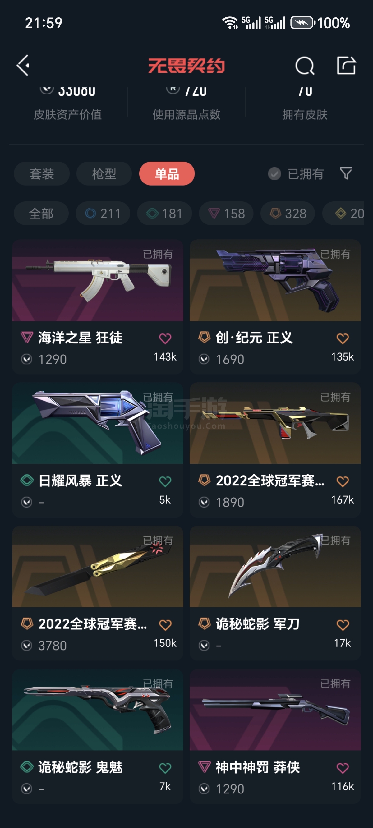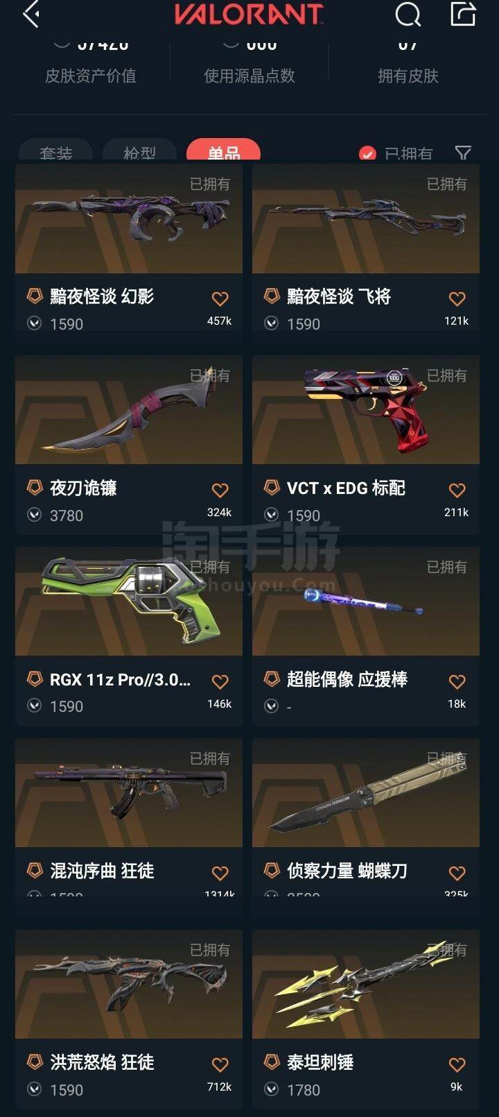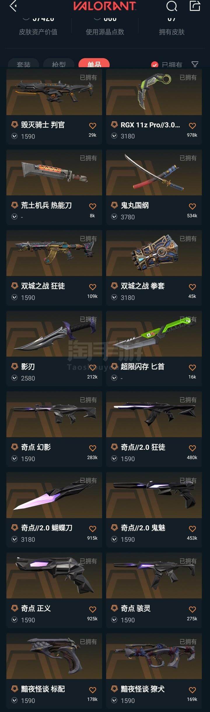段位: 未定级 近战武器皮肤: 泰坦刺锤,蝴蝶刀-侦察力量,超能偶像 应援棒,爪刀-RGX 11z Pro 3.0,夜刃诡镰,匕首-超限闪存,蝴蝶刀-奇点//2.0,影刃,鬼丸国纲 步枪皮肤: 幻影-奇点,狂徒-盖亚的复仇,狂徒-冰点凝冻,幻影-781-A协议,狂徒-洪荒怒焰,狂徒-混沌序曲,獠犬-黯夜怪谈,幻影-黯夜怪谈,狂徒-奇点//2.0,狂徒-掠影,戍卫-掠影 佩枪皮肤: 正义-奇点,标