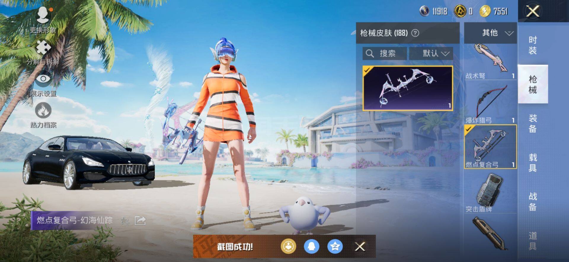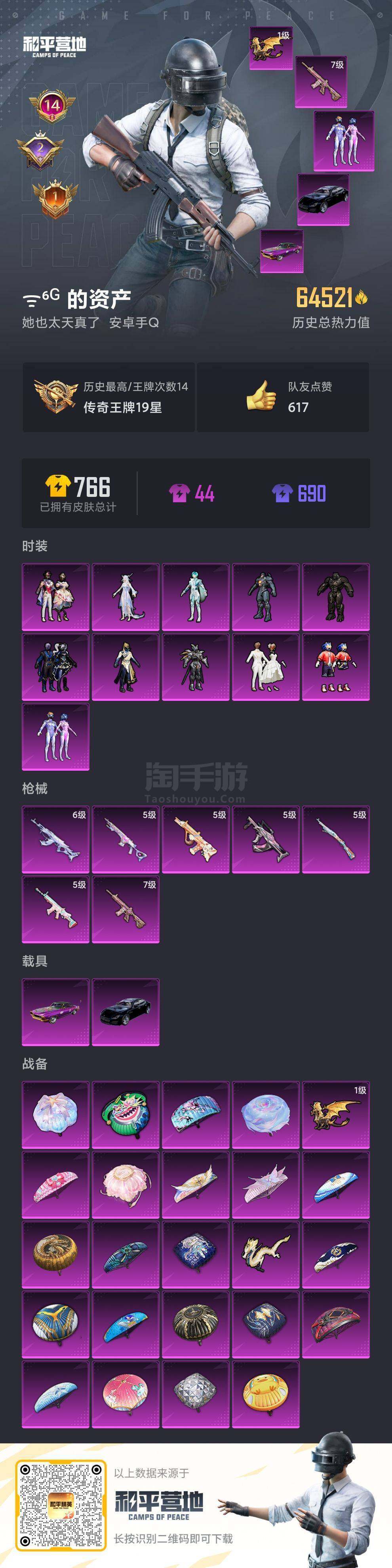 【11粉装7特效枪 2载具 玛莎拉蒂 虚妄之影 梦幻火箭 挚爱序曲】:安卓 手Q-11粉装-7特效枪-2载具-64521热力值-14印记-141套装-188枪皮