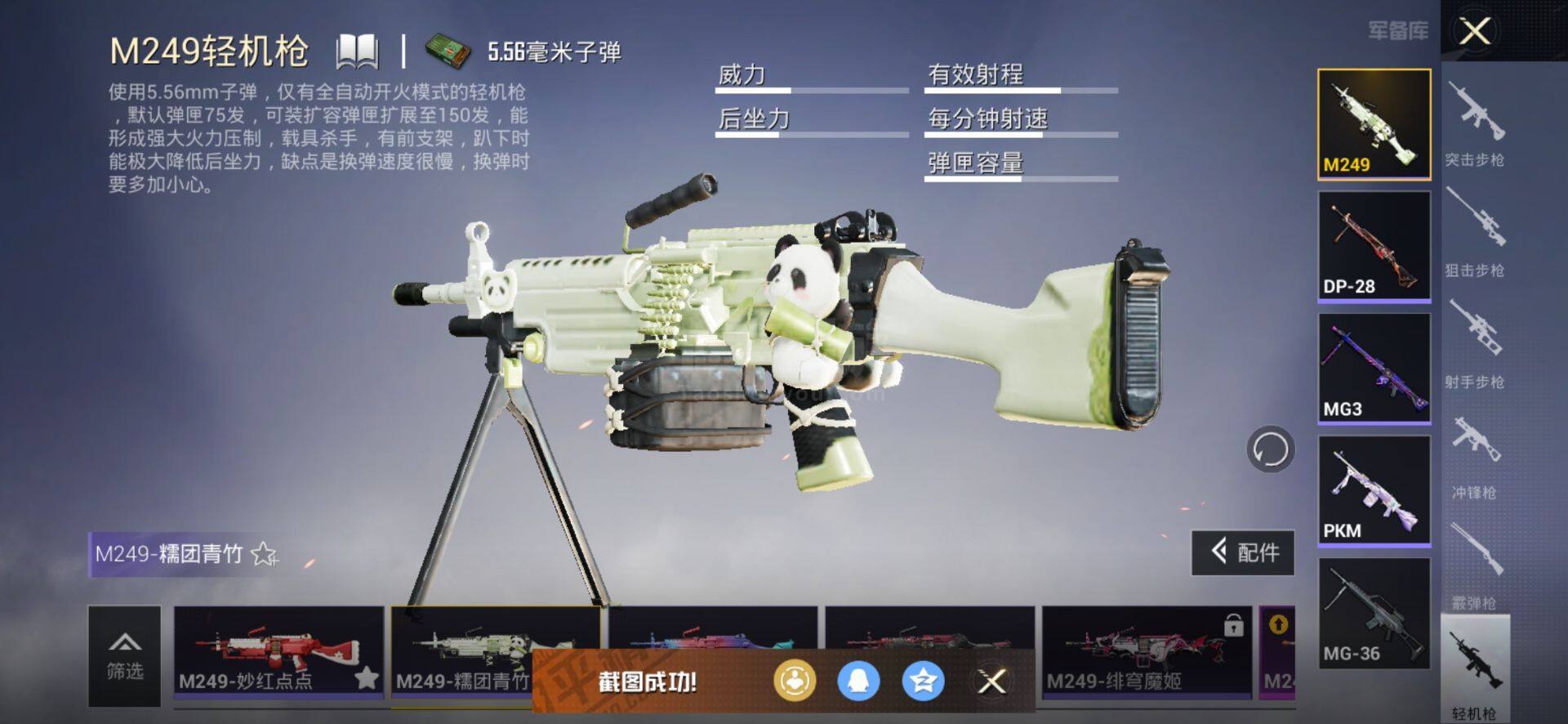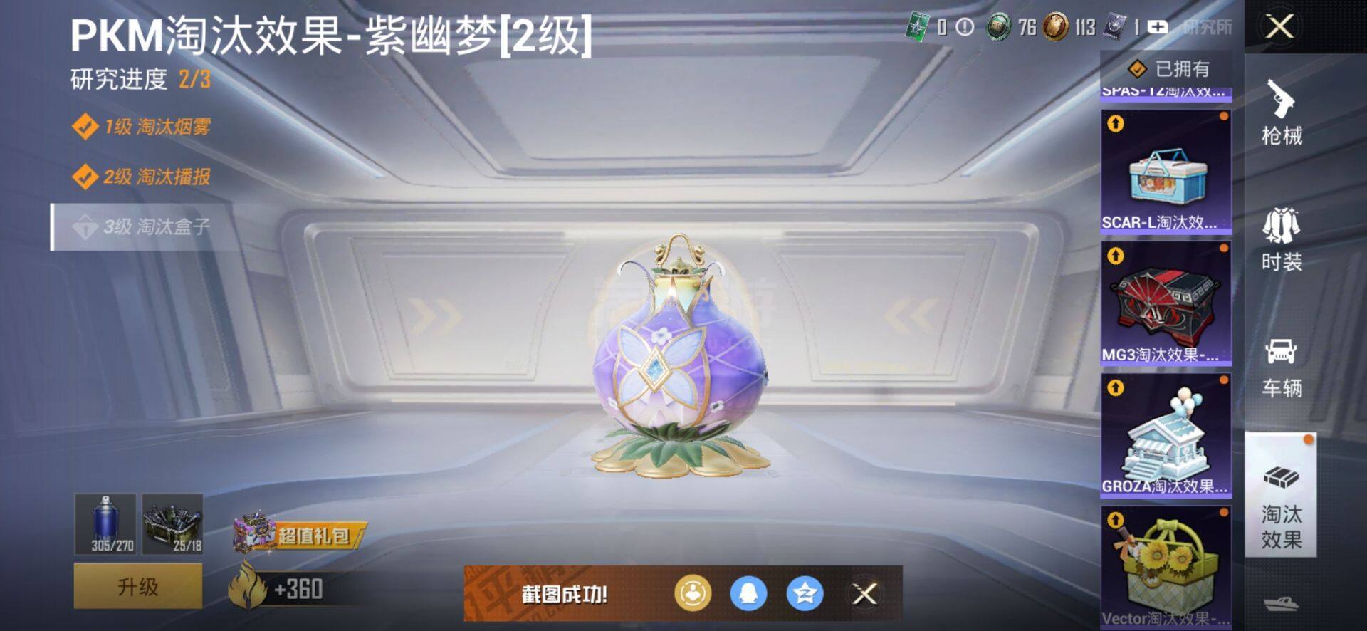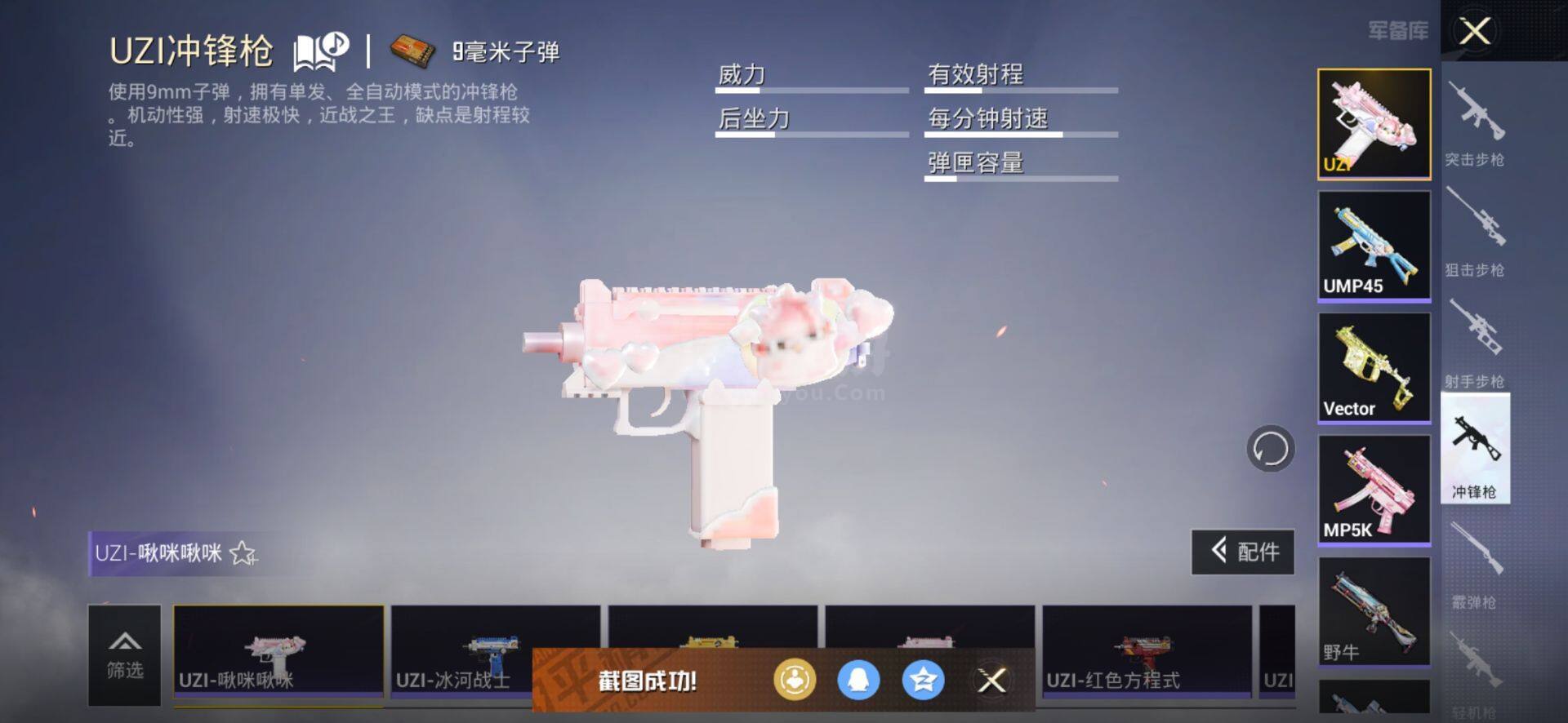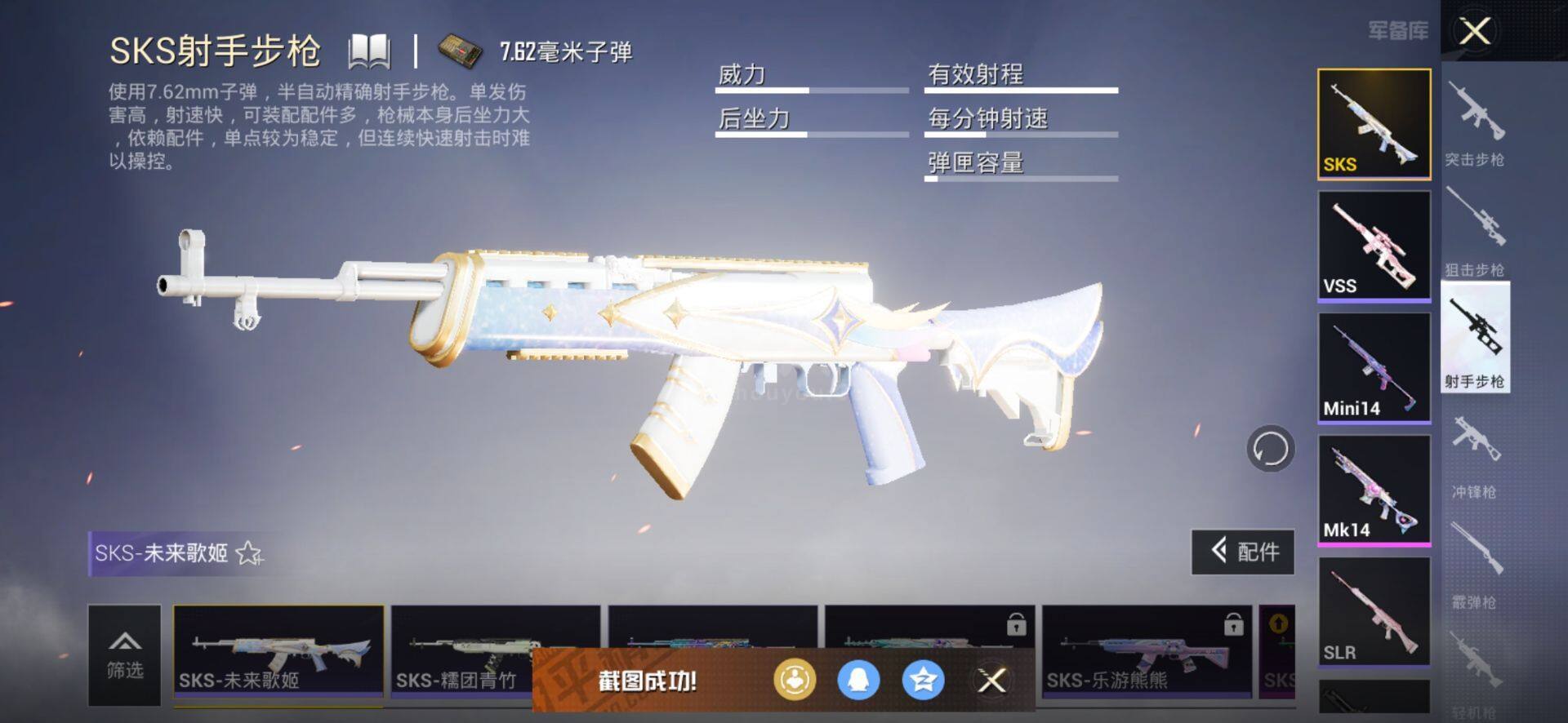 【特效枪等级】:AKM-幻海仙踪(六级),SCAR-L-锦绣绵绵(五级),M416-心之恋语(七级),GROZA-镜光银凌(五级),AUG-暖羊咩咩(五级),