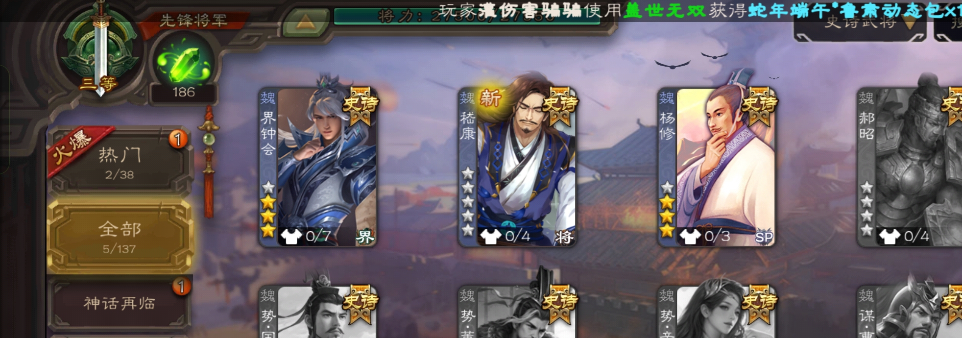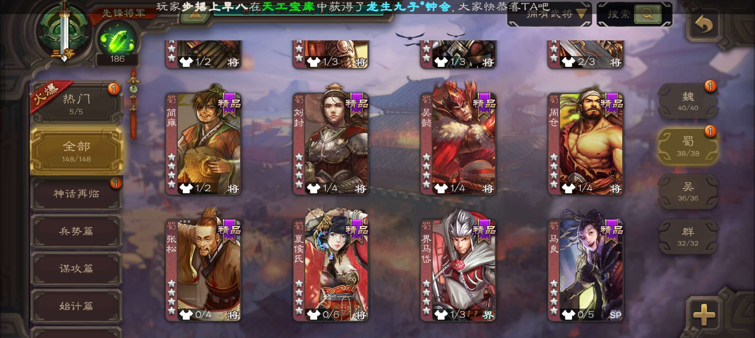 5史诗双神先锋,5万豆4.2万羽毛,天工玄母丘倹,界钟会谯周嵇康杨修左慈,神周瑜神吕蒙谋韩当148将