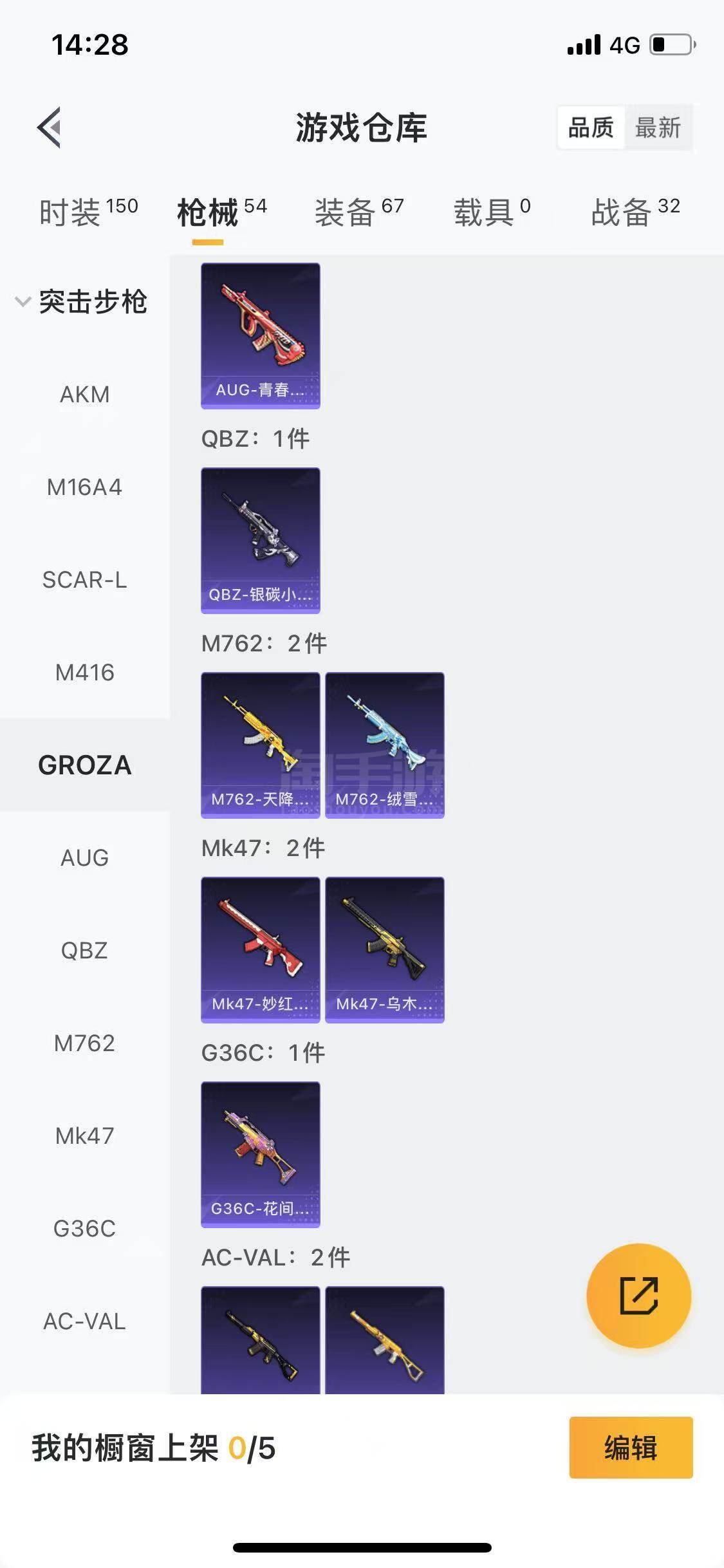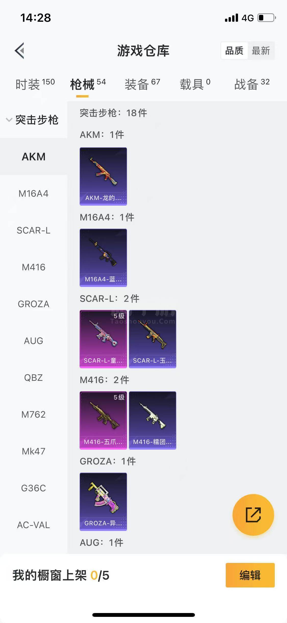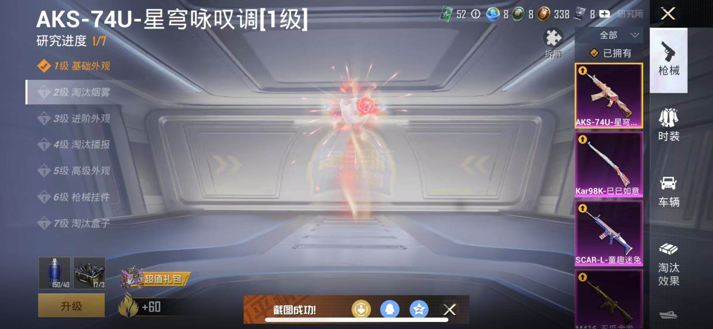 【特效枪等级】:SCAR-L-童趣迷兔(五级),M416-五爪金龙(五级),AKS-74U-星穹咏叹调(一级),Kar98K-巳巳如意(四级)