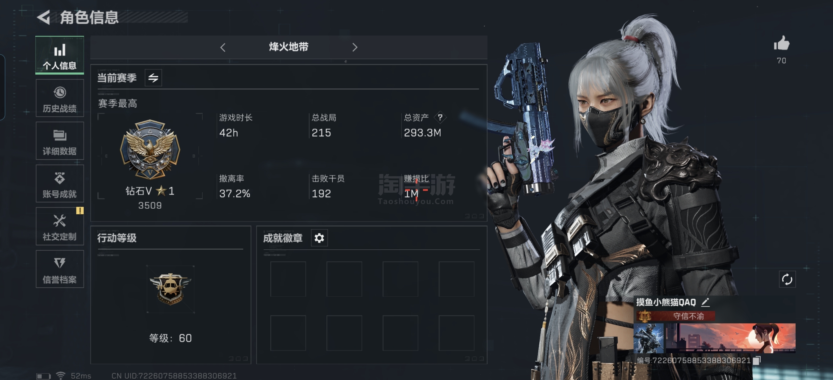三角洲行动【安卓QQ】293M资产103M纯币,红狼麦晓雯红皮,黑海北极星刀皮,s3冰龙挂饰,十多把金色枪皮