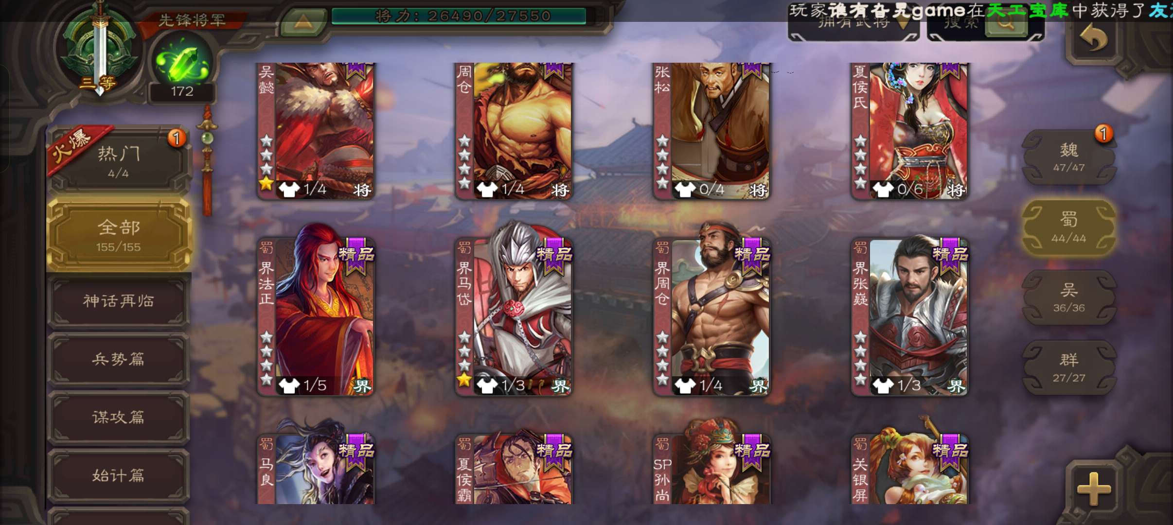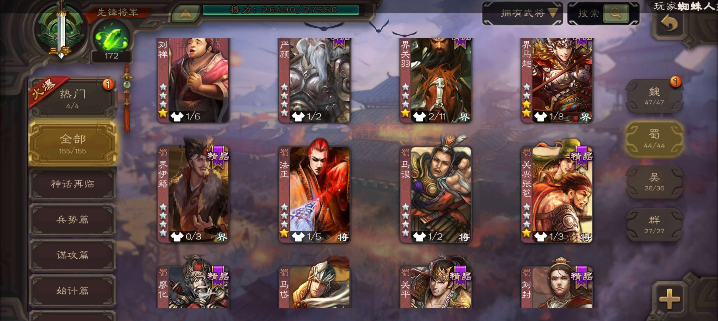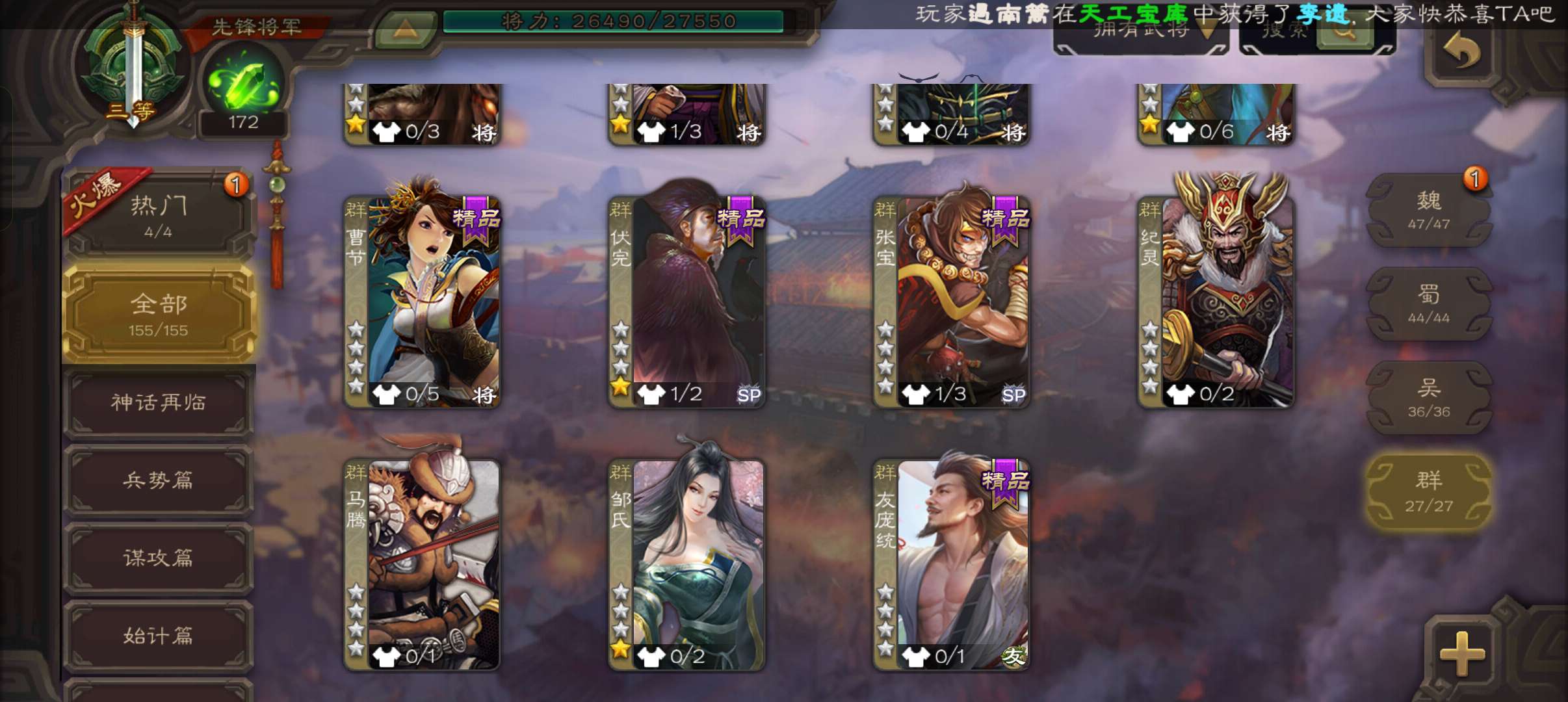 5史诗先锋,6万羽毛5万豆,界钟会沙摩柯谯周嵇康杨修,神吕蒙张春华崔琰界关羽孙茹凌操155将