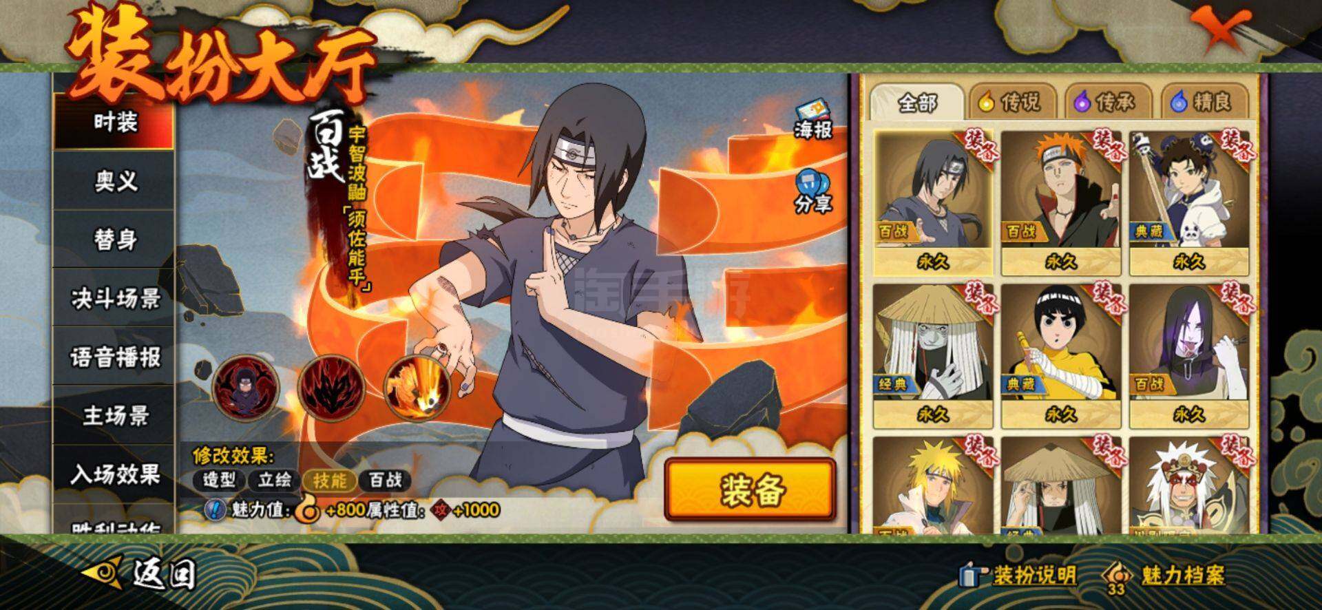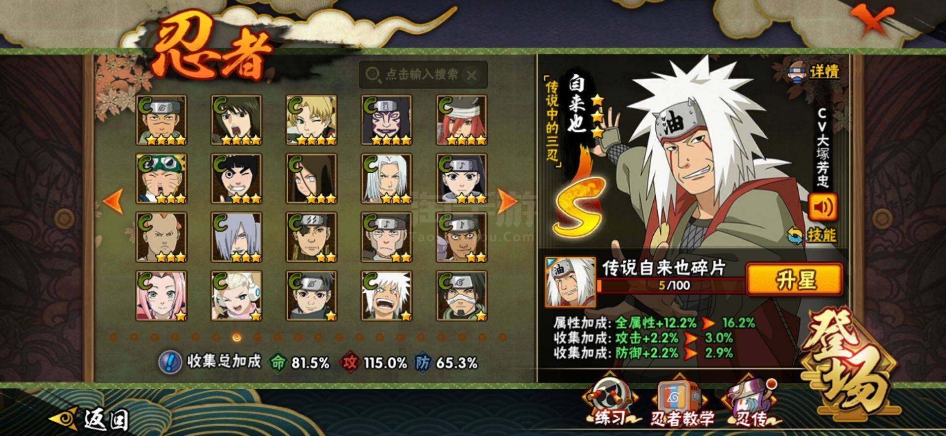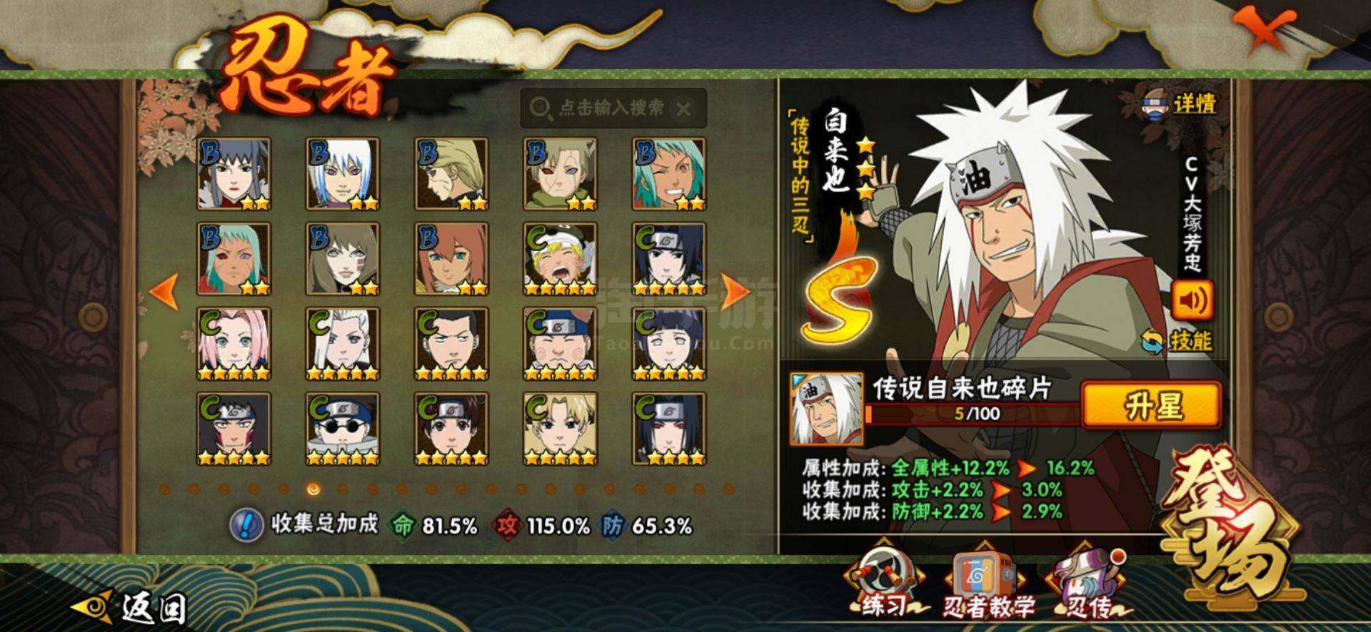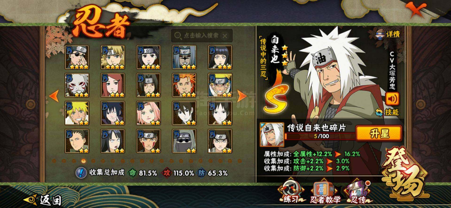 【S级忍者】:猿飞日斩「秽土转生」(3星),千手柱间「秽土转生」(3星),宇智波鼬「秽土转生」(3星),宇智波斑「秽土转生·解」(3星),宇智波带土「忍界大战」(3星),宇智波鼬「须佐能乎」(3星),自来也「舞之豪杰」(3星),大蛇丸(3星),自来也「传说中的三忍」(3星),纲手(3星),猿飞日斩(3星),波风水门(3星),药师兜「仙人模式」(3