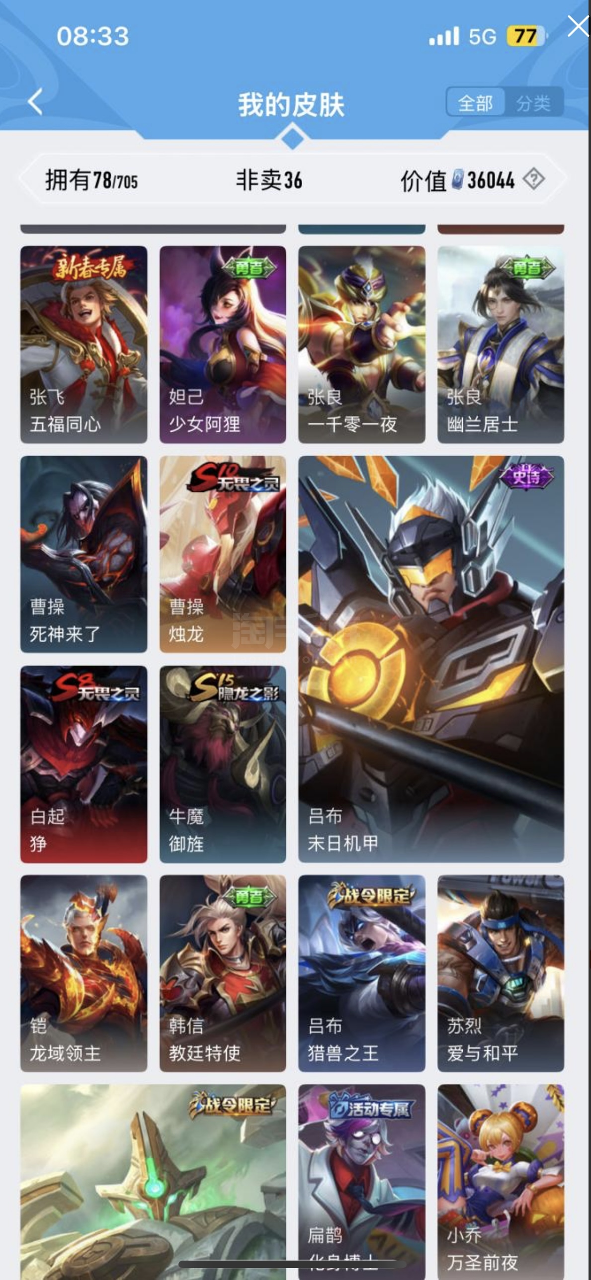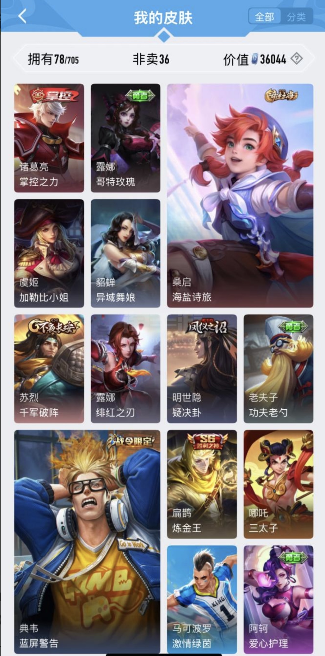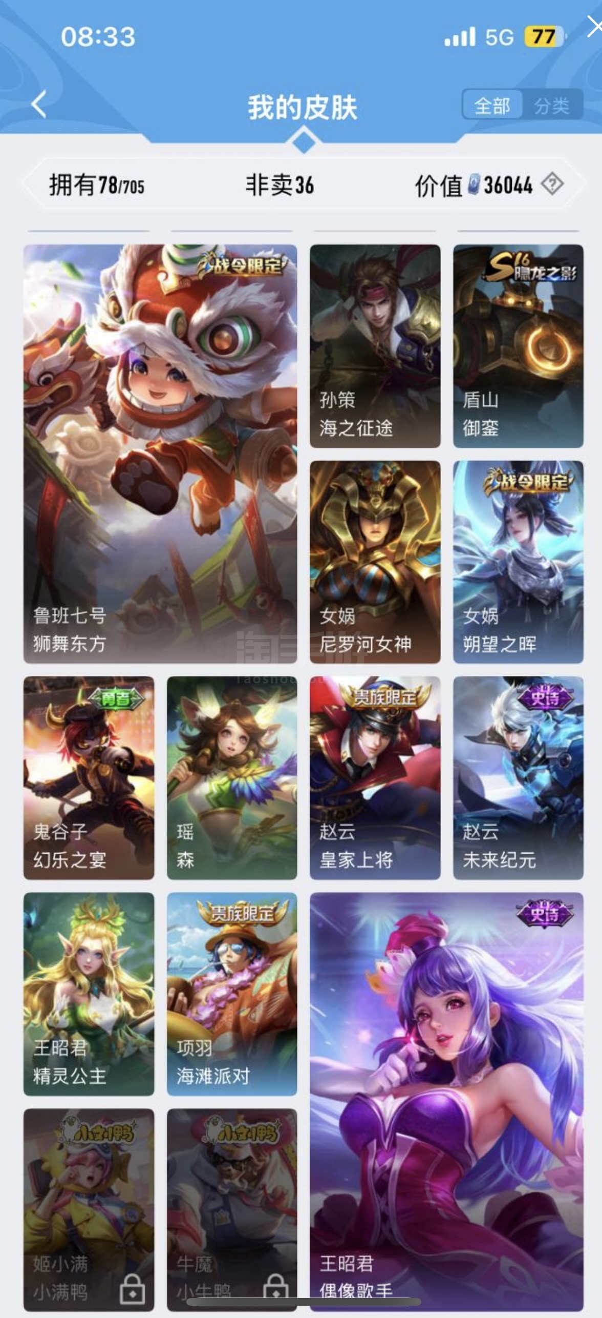 有一个至尊宝和一个虞姬的荣耀典藏,还有一大堆其他的皮肤