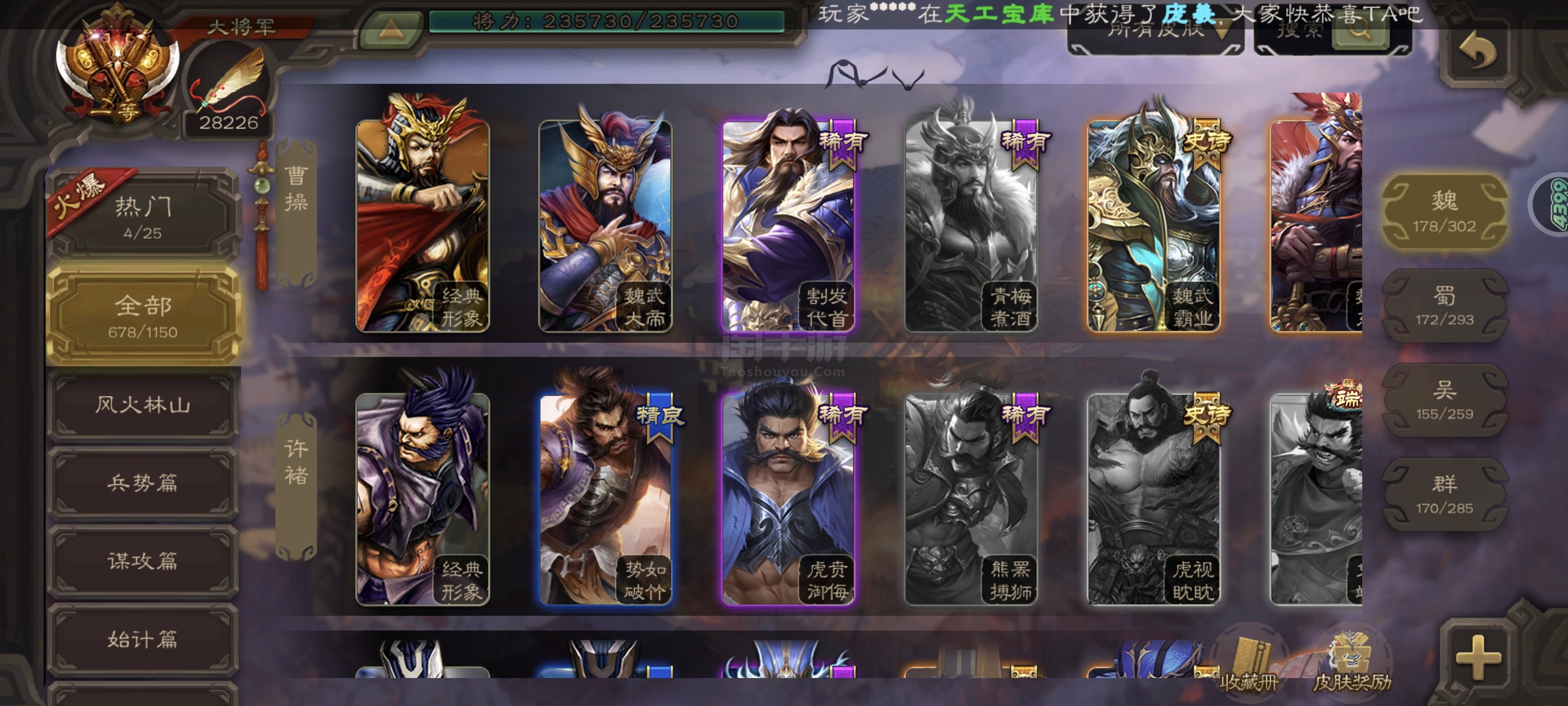 一等大将军,全神将。485个武将权一权三,136个动皮。