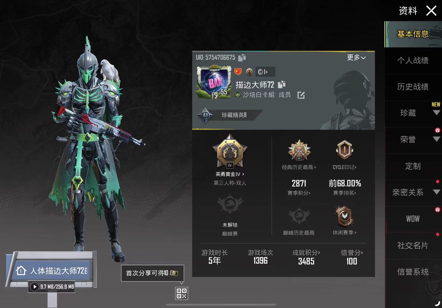 安卓QQ 这个QQ还绑定了一个和平精英的号,里面有火箭少女,两个王牌印记,还有一些其它的皮肤。