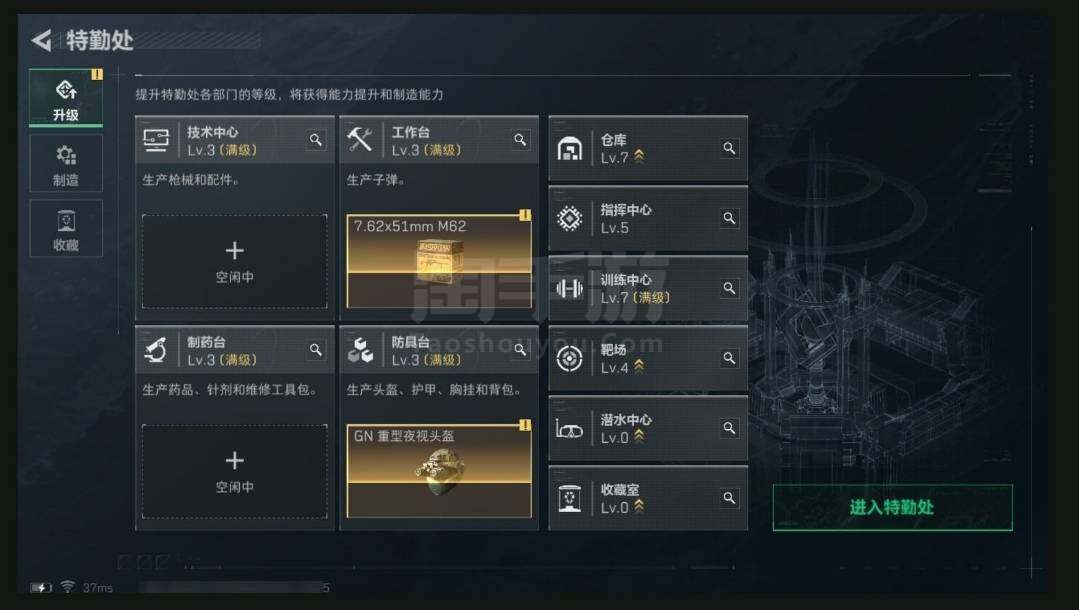 【特勤处】制药台Lv.3/工作台Lv.3/仓库Lv.7/防具台Lv.3/训练中心Lv.7/靶场Lv.4/技术中心Lv.3/指挥中心Lv.5