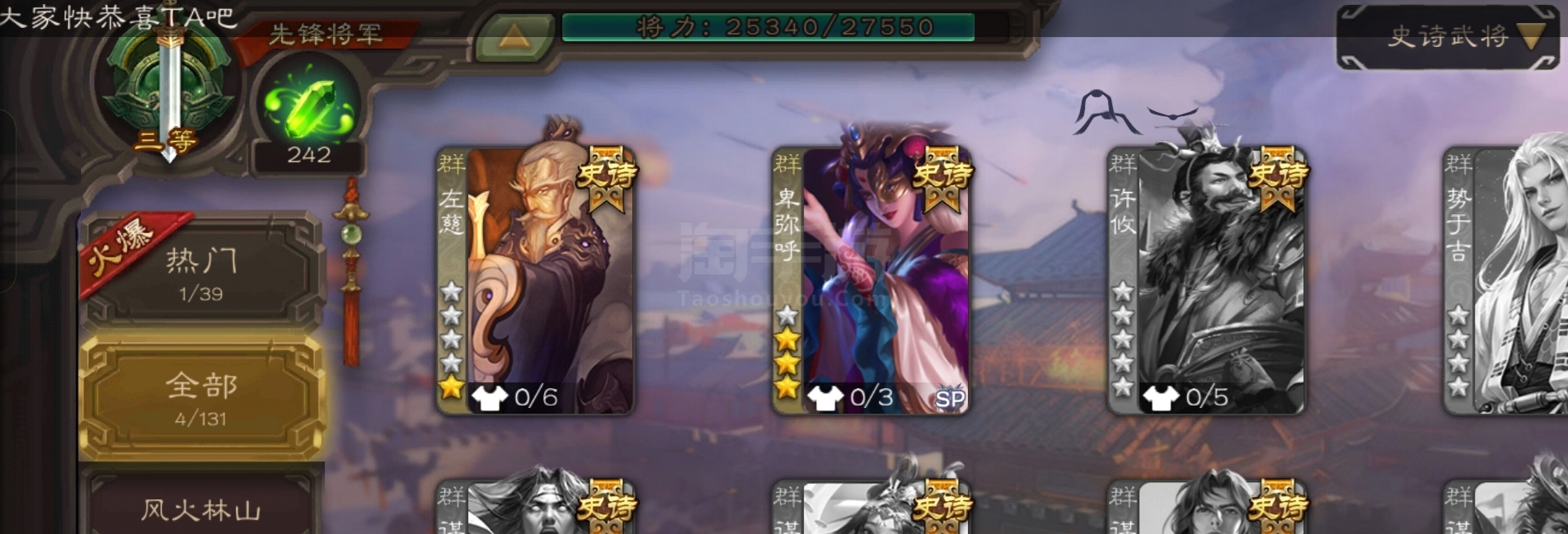 天工势娄圭,沙摩柯花鬘卑弥呼左慈4史诗先锋,神吕蒙动态孙尚香霍峻谋卢植羊钴148将
