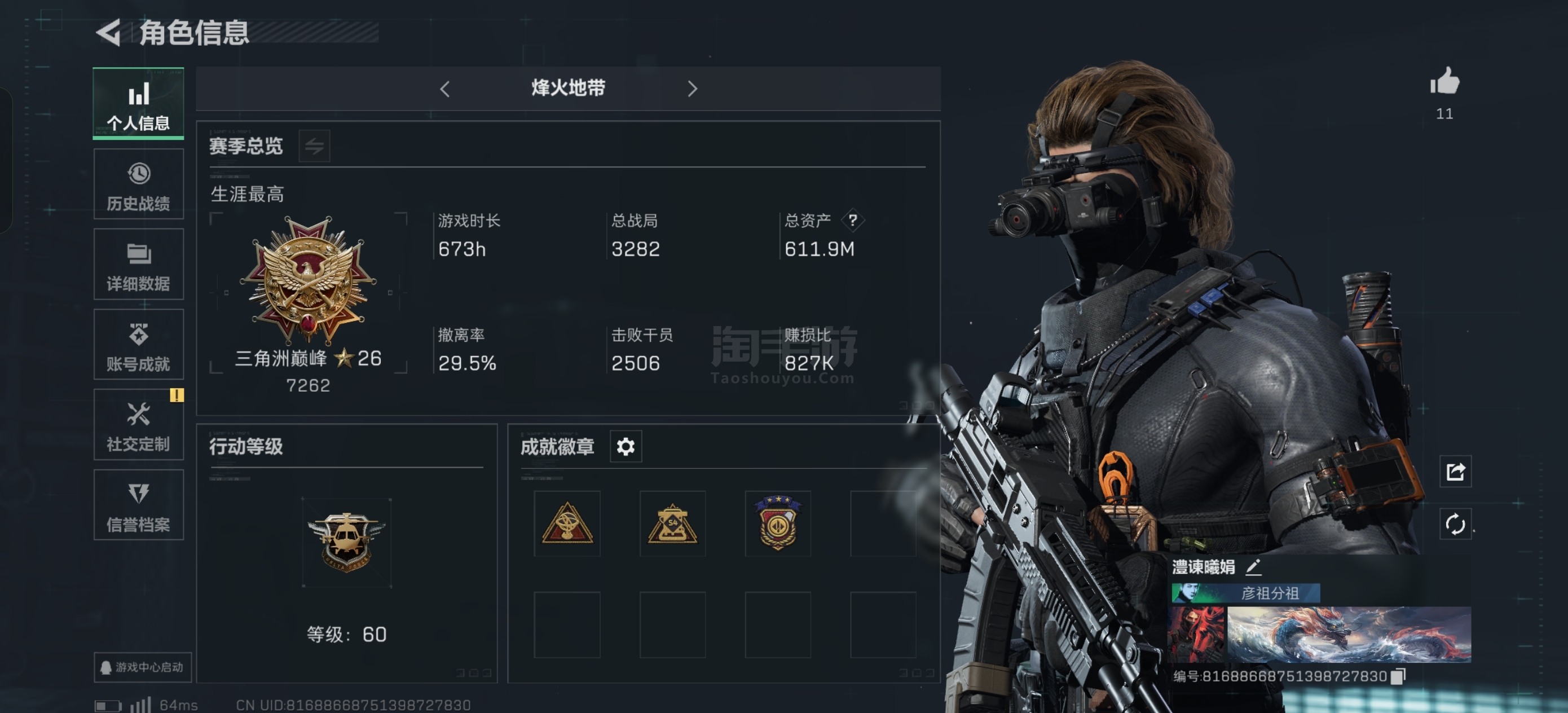 满级特勤处,满级号,123发a大子弹,1万发金蛋,大部分红都有,三颗心非绑定173个皮肤.5000三 哈弗币:284m 总资产:611m