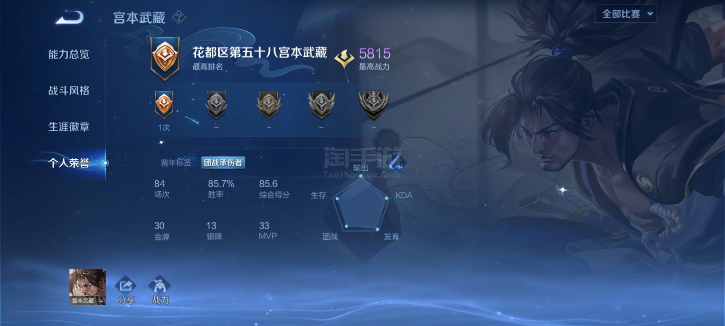 超高胜率宫本号,不可二次实名,金银牌多,目前宫本武藏在榜区标,可冲省标小国标,带妹装逼神号