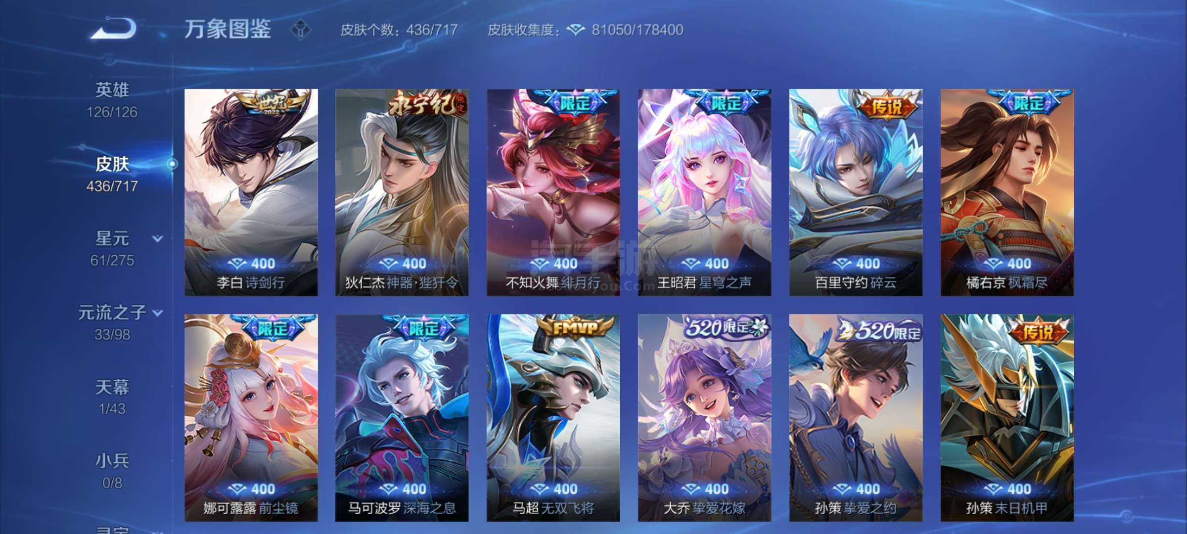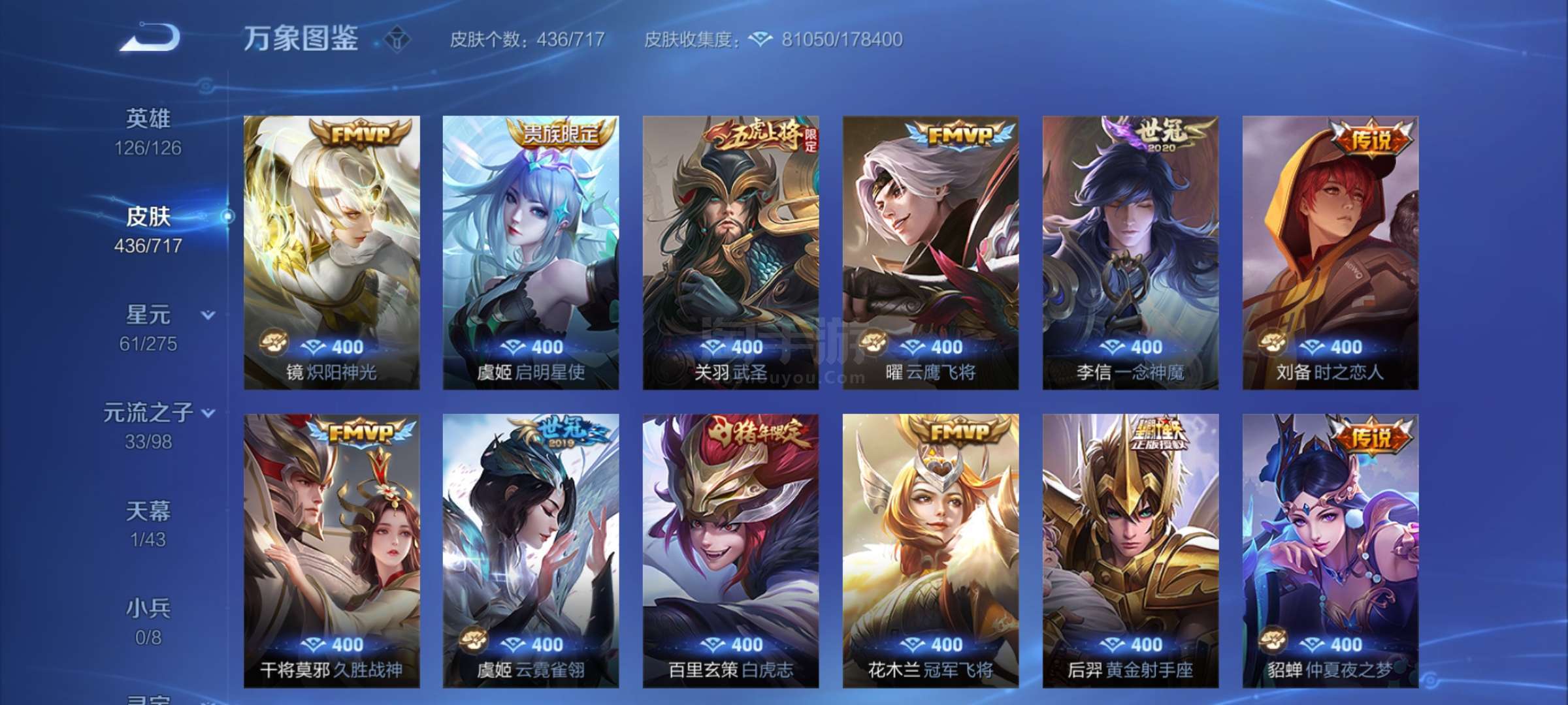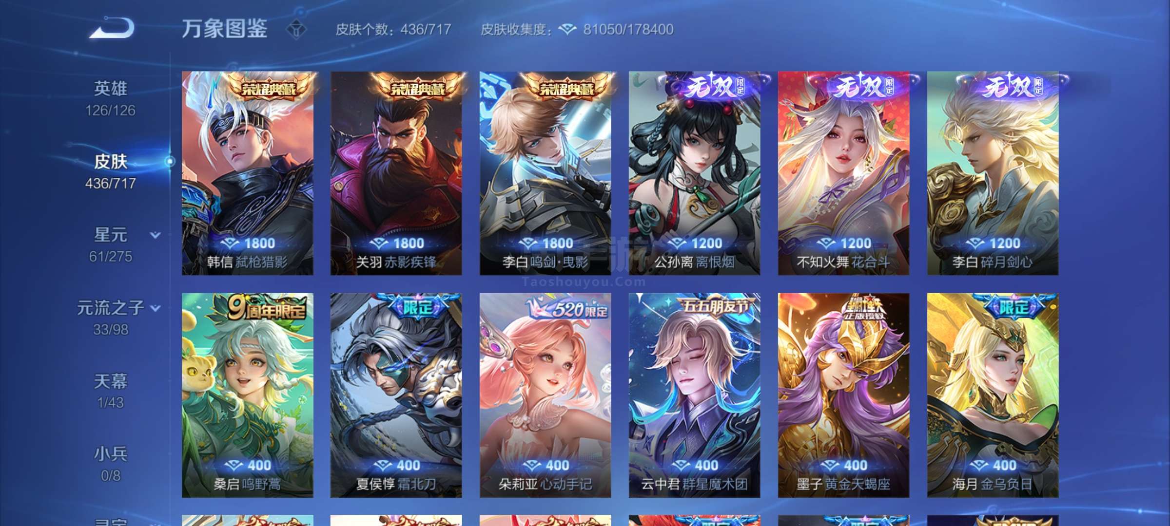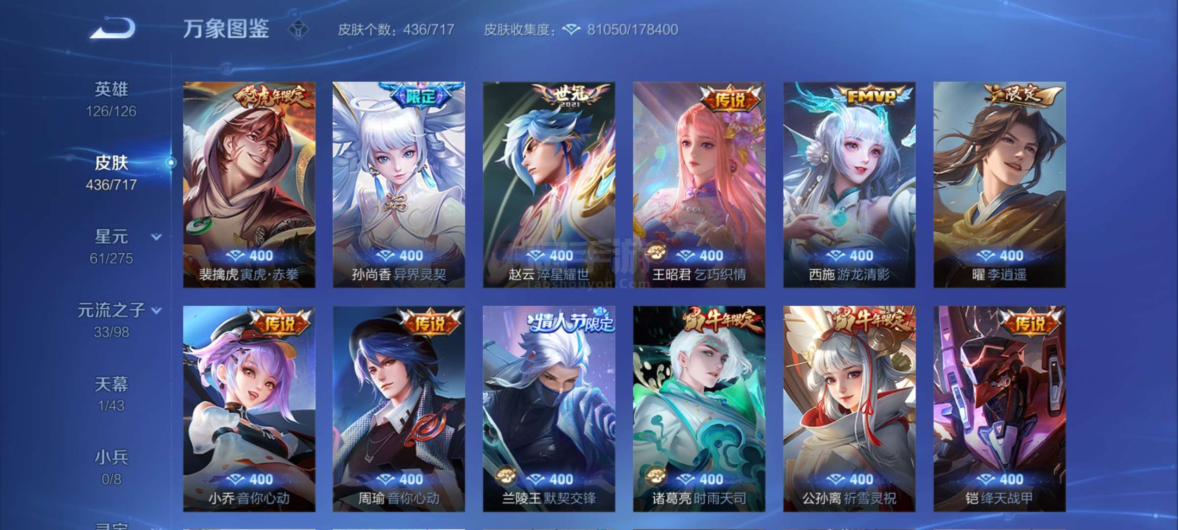 极品V10 3典藏3无双 61传说 146史诗 433皮肤 五虎全套鸡年全套牛年全套21年情套22年