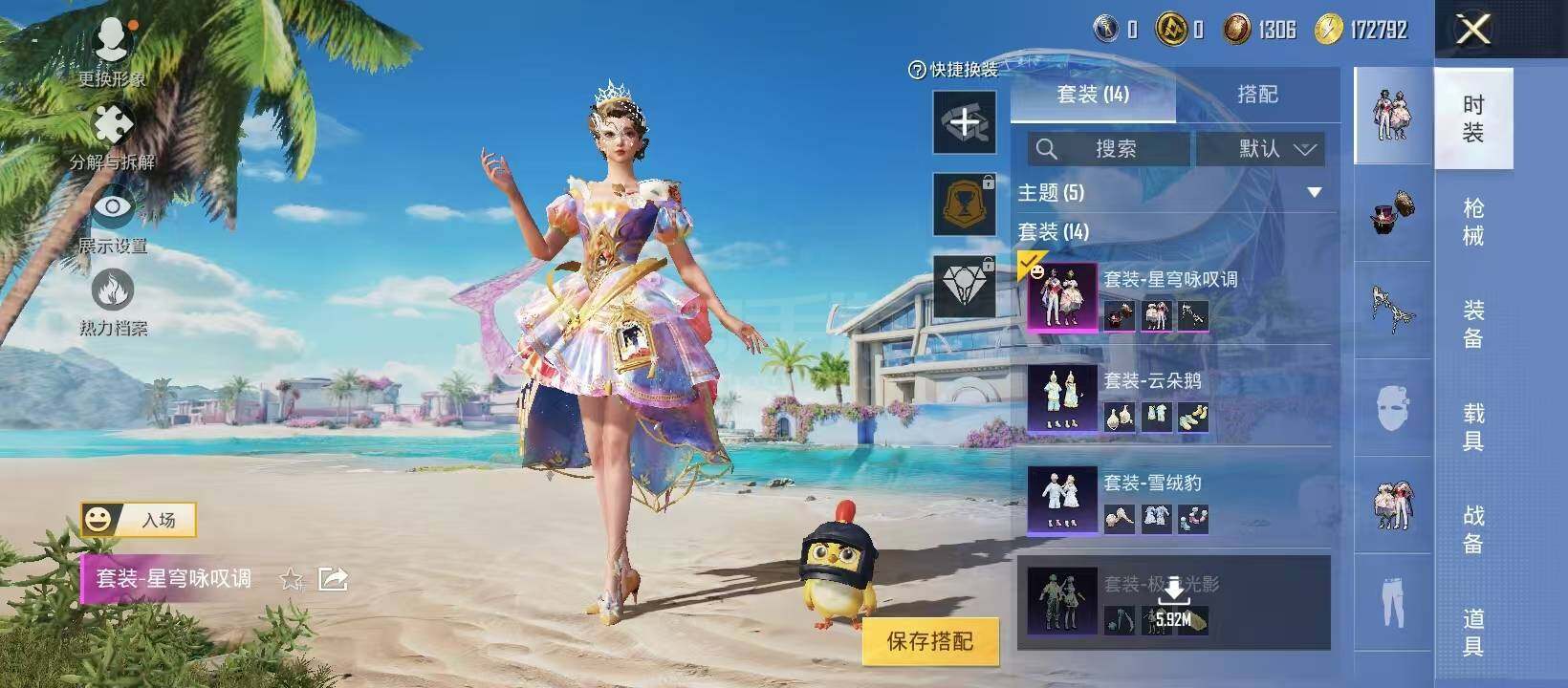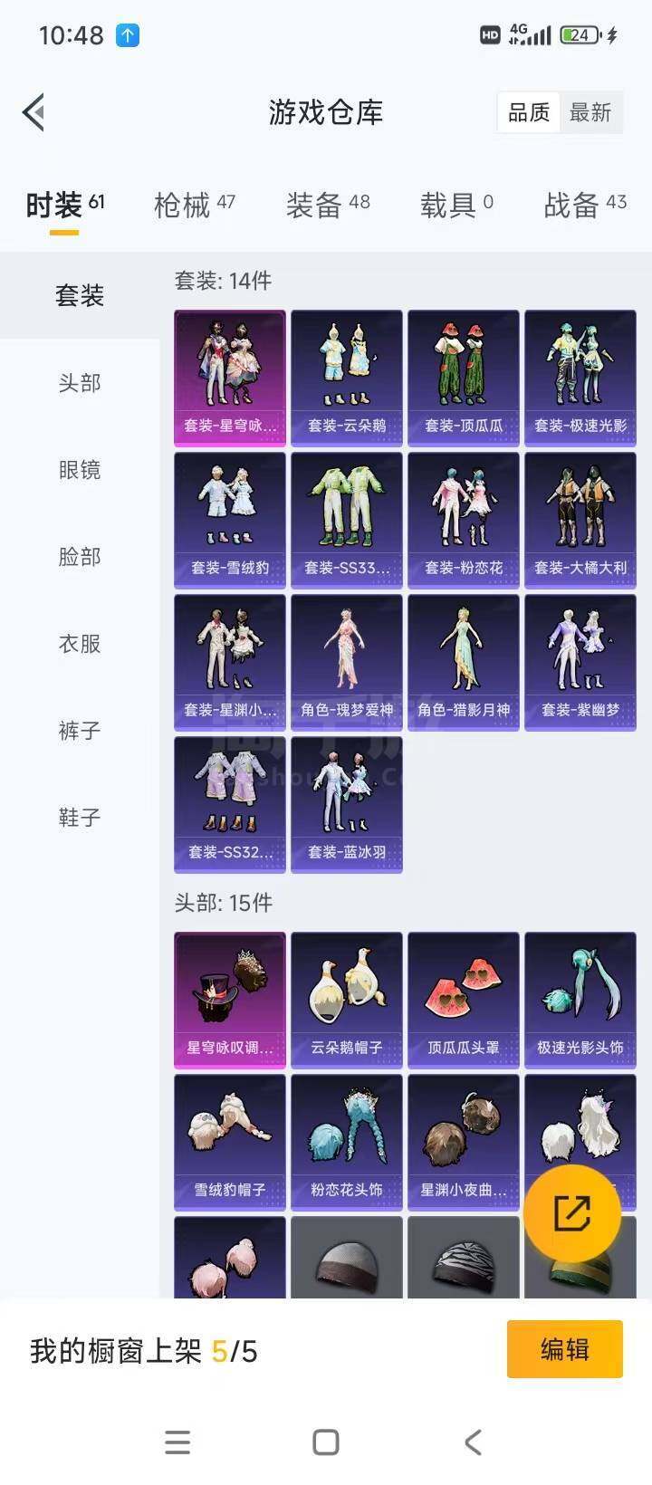 【稀有套装】:套装-粉恋花,套装-紫幽梦,套装-蓝冰羽,角色-猎影月神,角色-瑰梦爱神,套装-星渊小夜曲,套装-极速光影,套装-云朵鹅,套装-雪绒豹