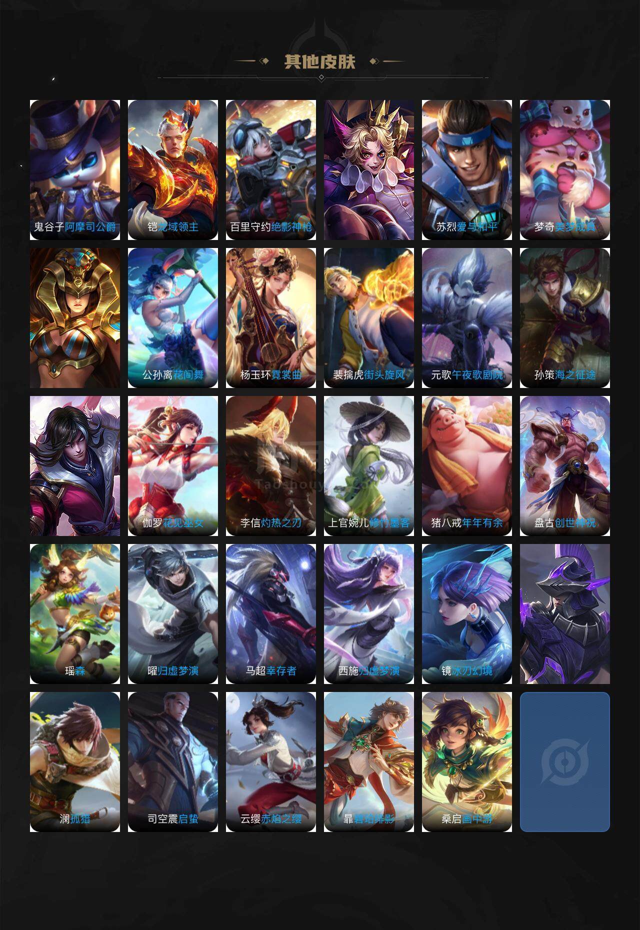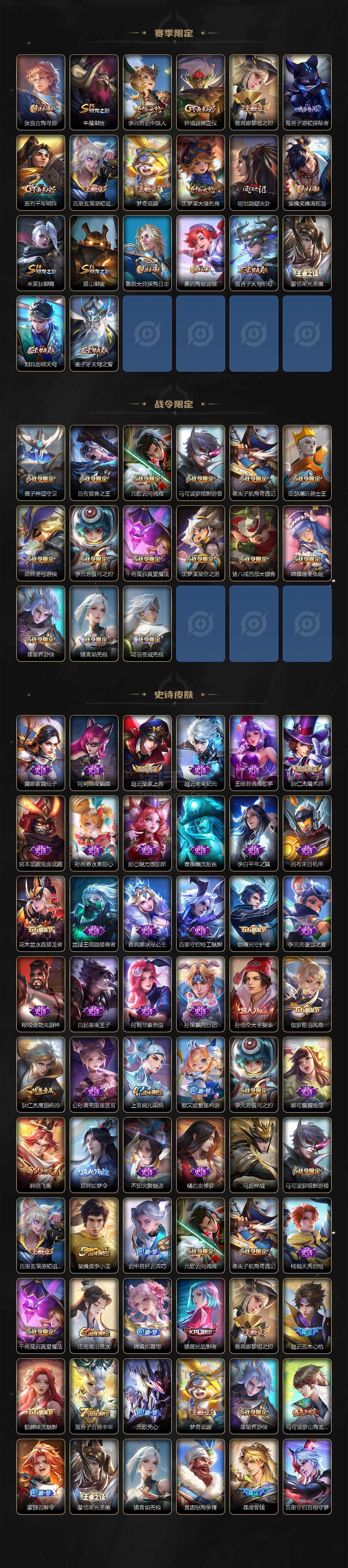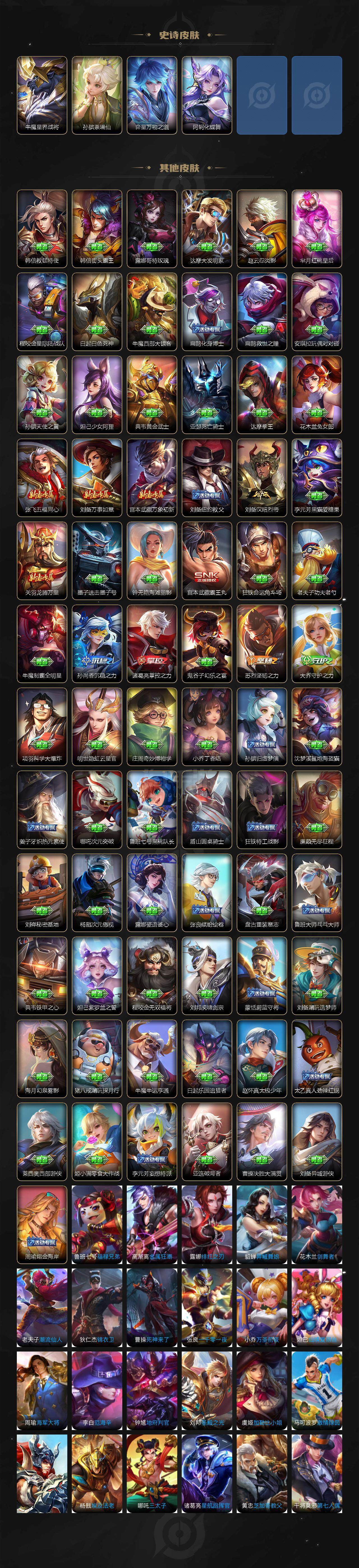 【传说皮肤】:狄仁杰超时空战士,孙尚香末日机甲,后羿黄金射手座,梦奇胖达荣荣,达摩黄金狮子座,李信一念神魔,吕布怒海麟威,桑启鸣野蒿,裴擒虎祥瑞亨通,澜愿照九州拓