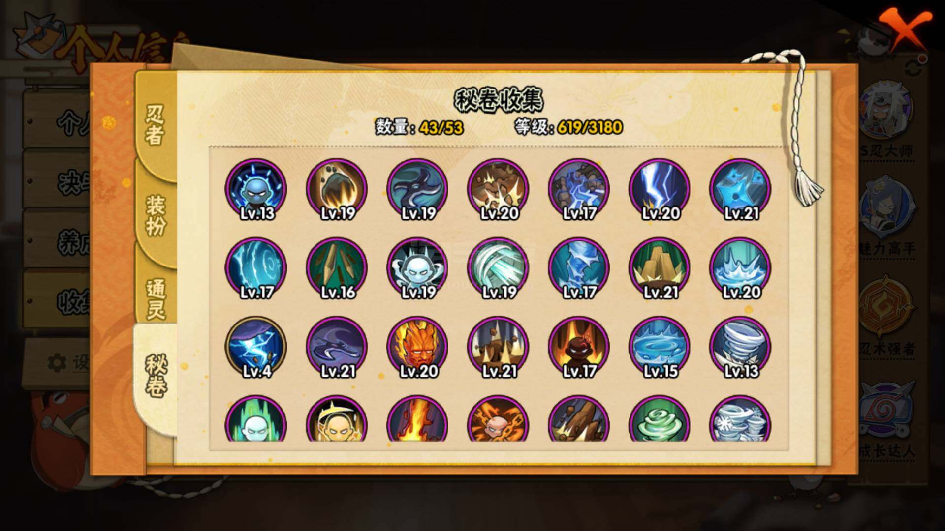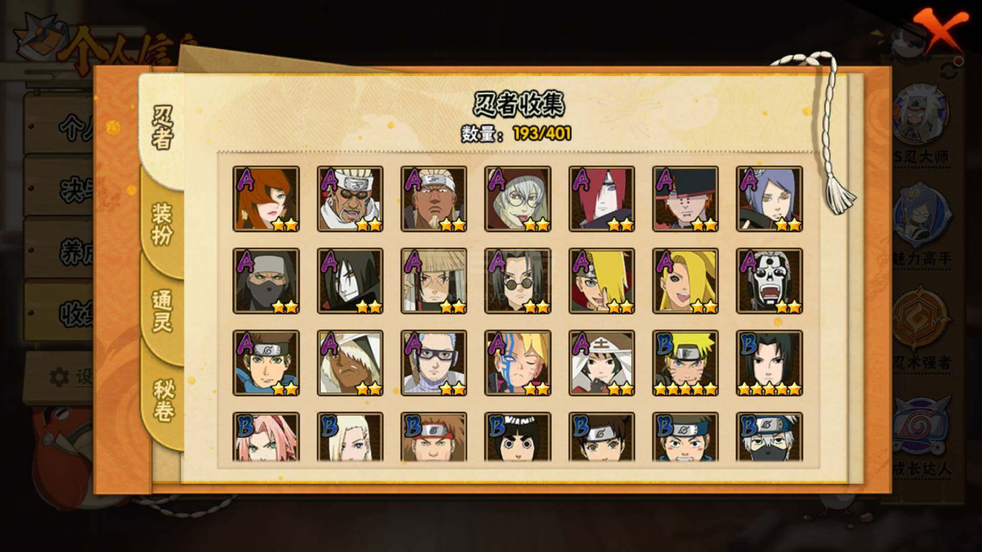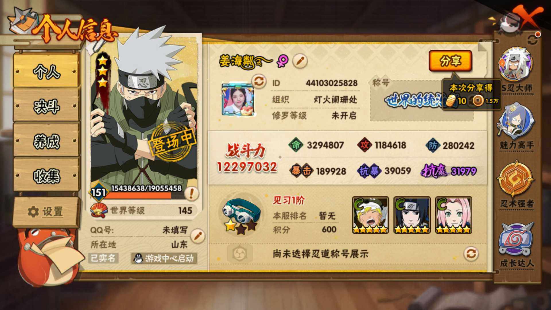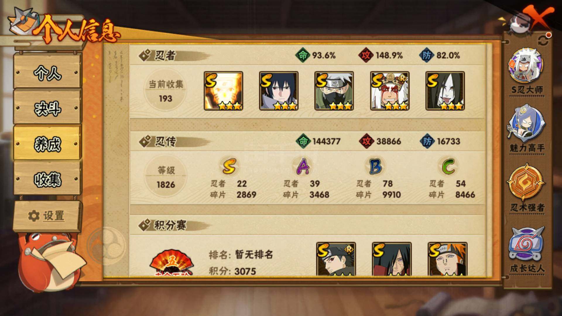 安卓QQ v11 22S 39A 1229w战力 自来也碎片70 忍战樱碎片82 日斩碎