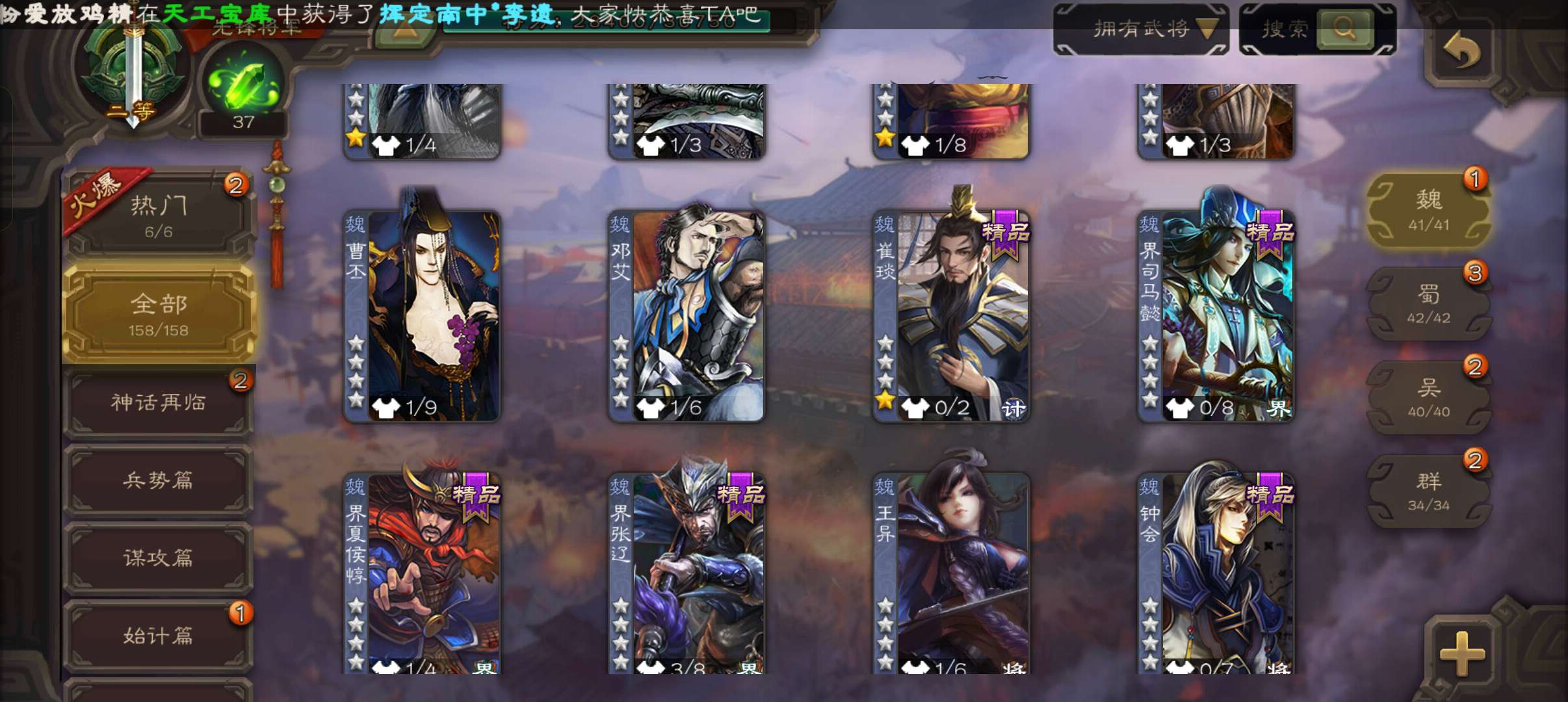 8万3羽毛,界李儒星黄忠神吕布公孙康谋赵云谯周左慈7史诗二等先锋,天工吴柯神吕蒙势陈到界孙权158将