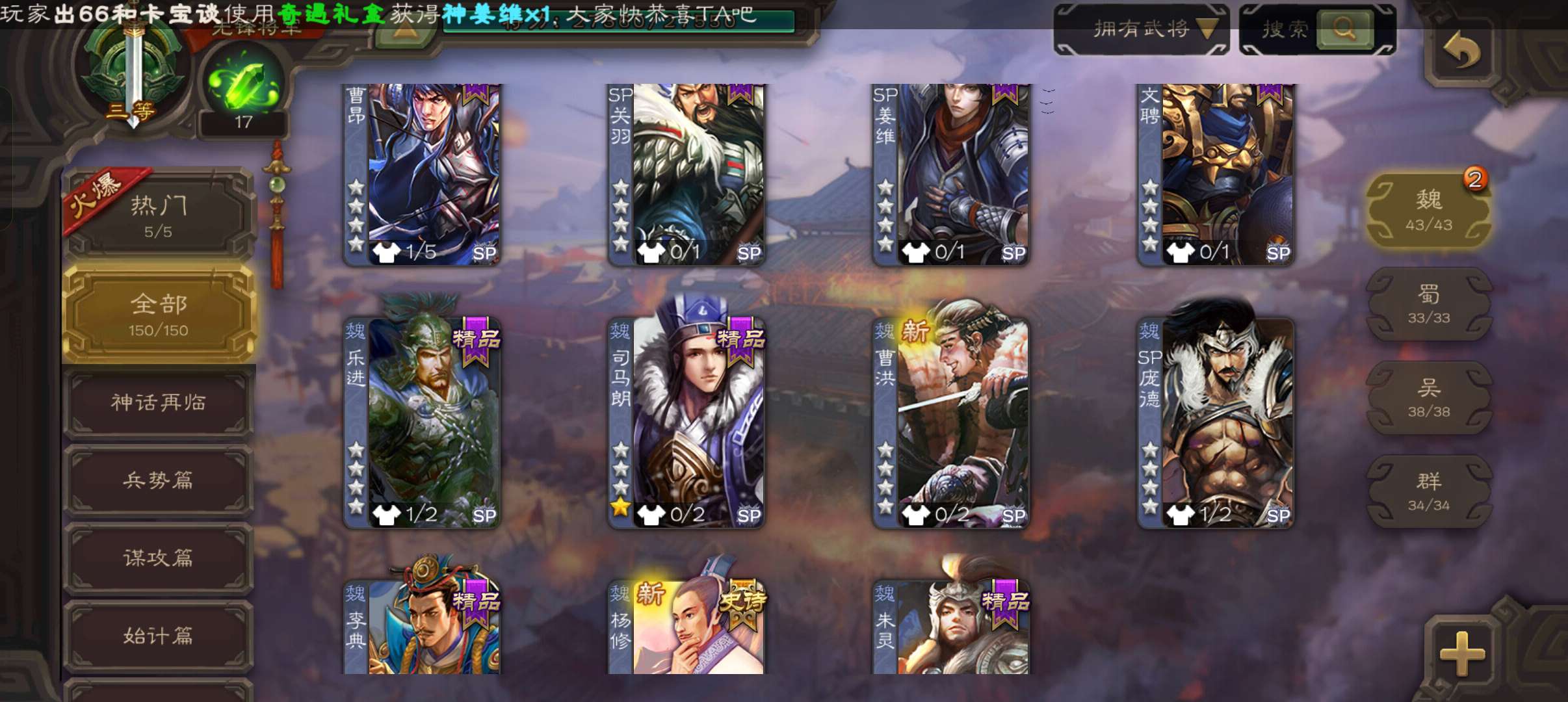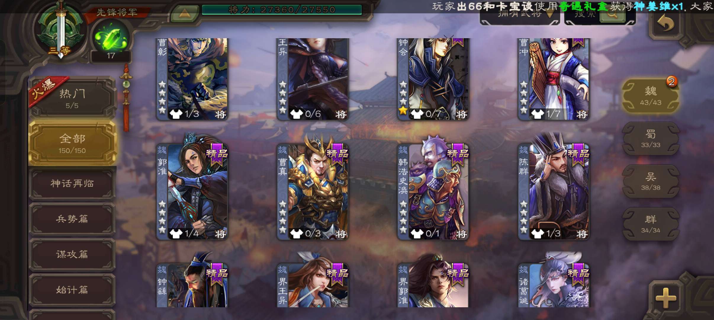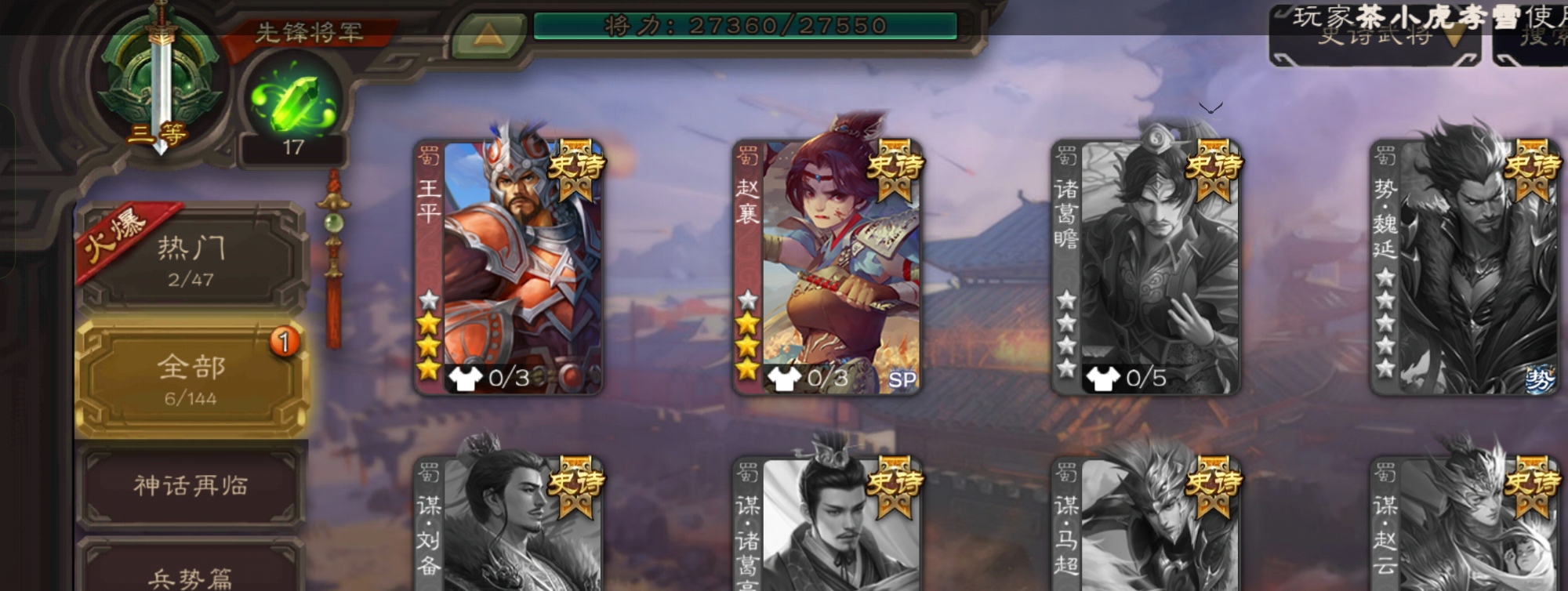 6史诗先锋,8.7万羽毛4万豆,神赵云王平赵襄杨修贺齐左慈,神吕蒙崔琰谋高顺150将
