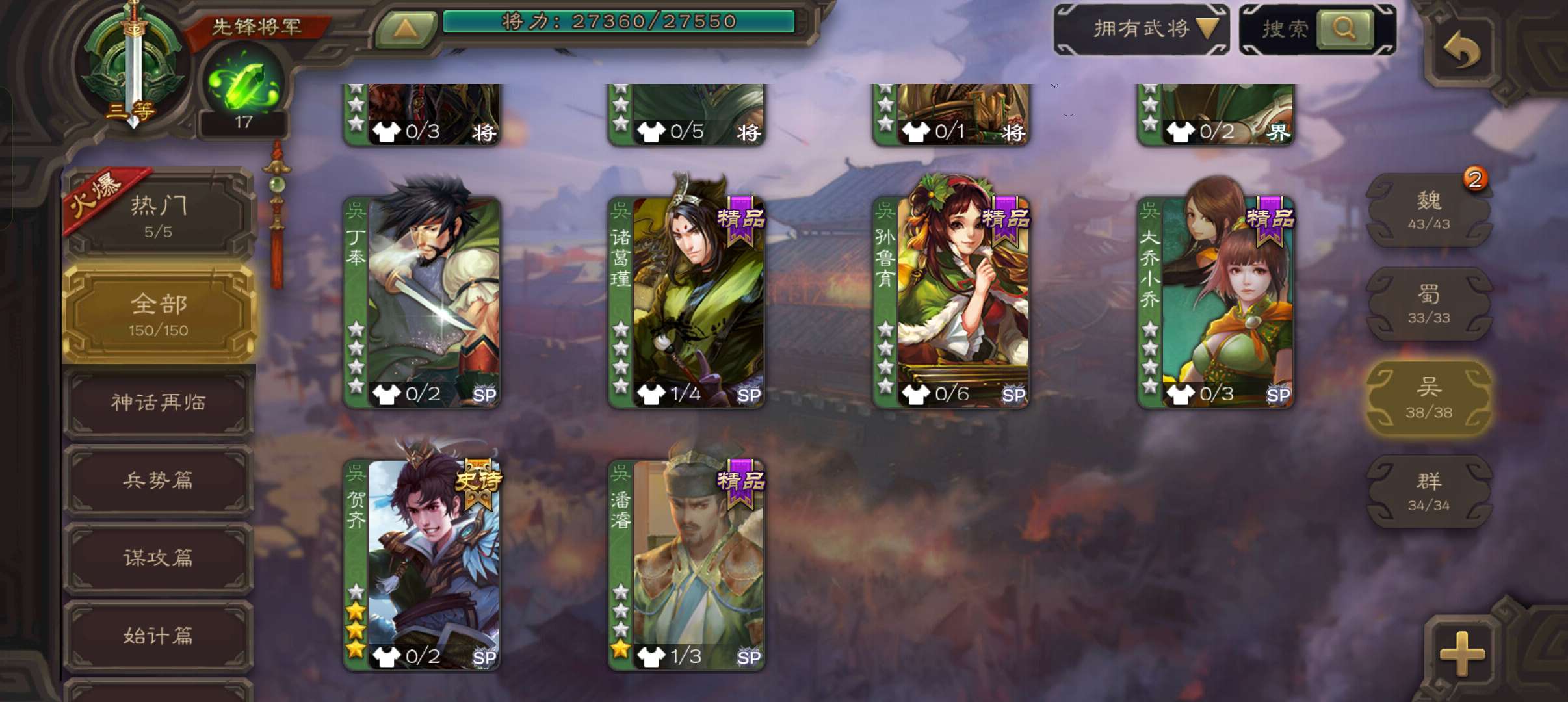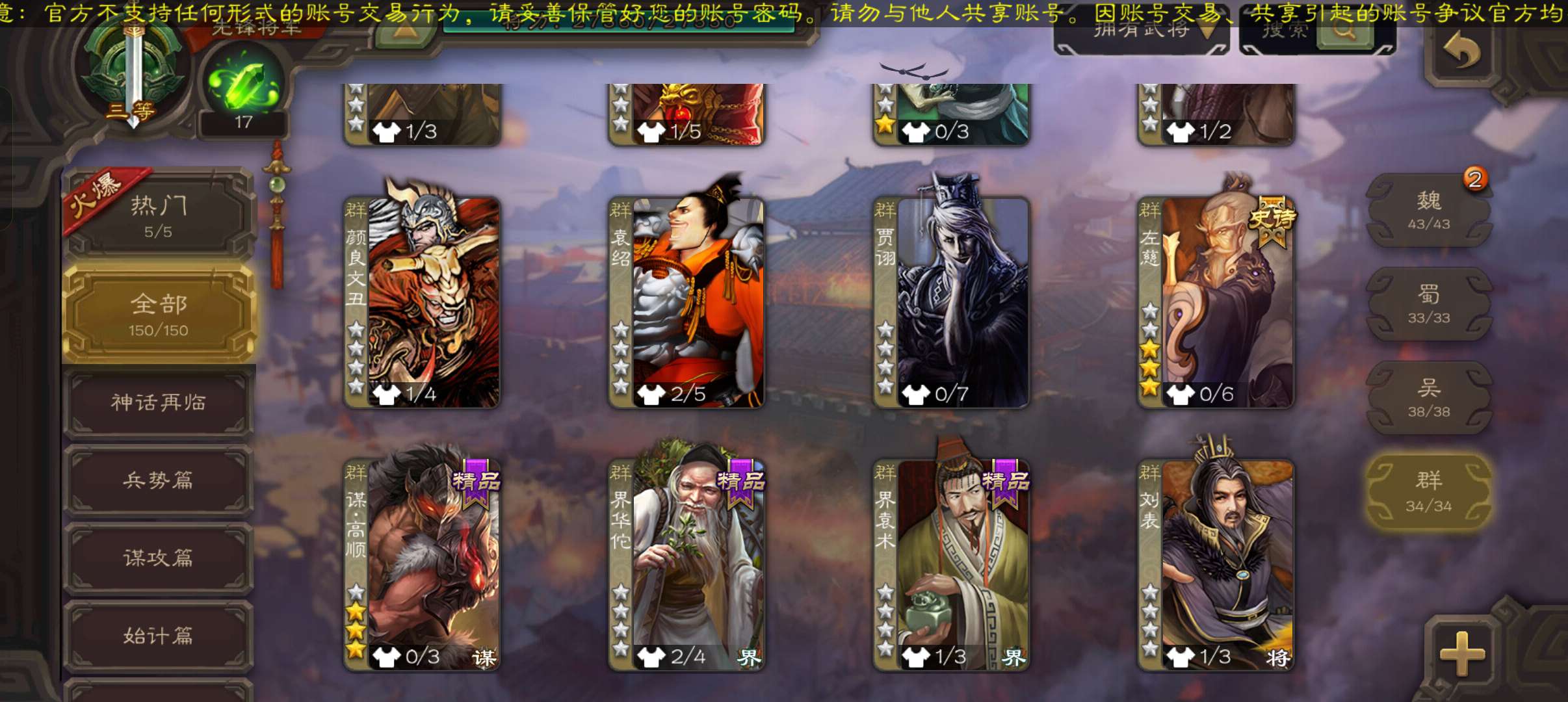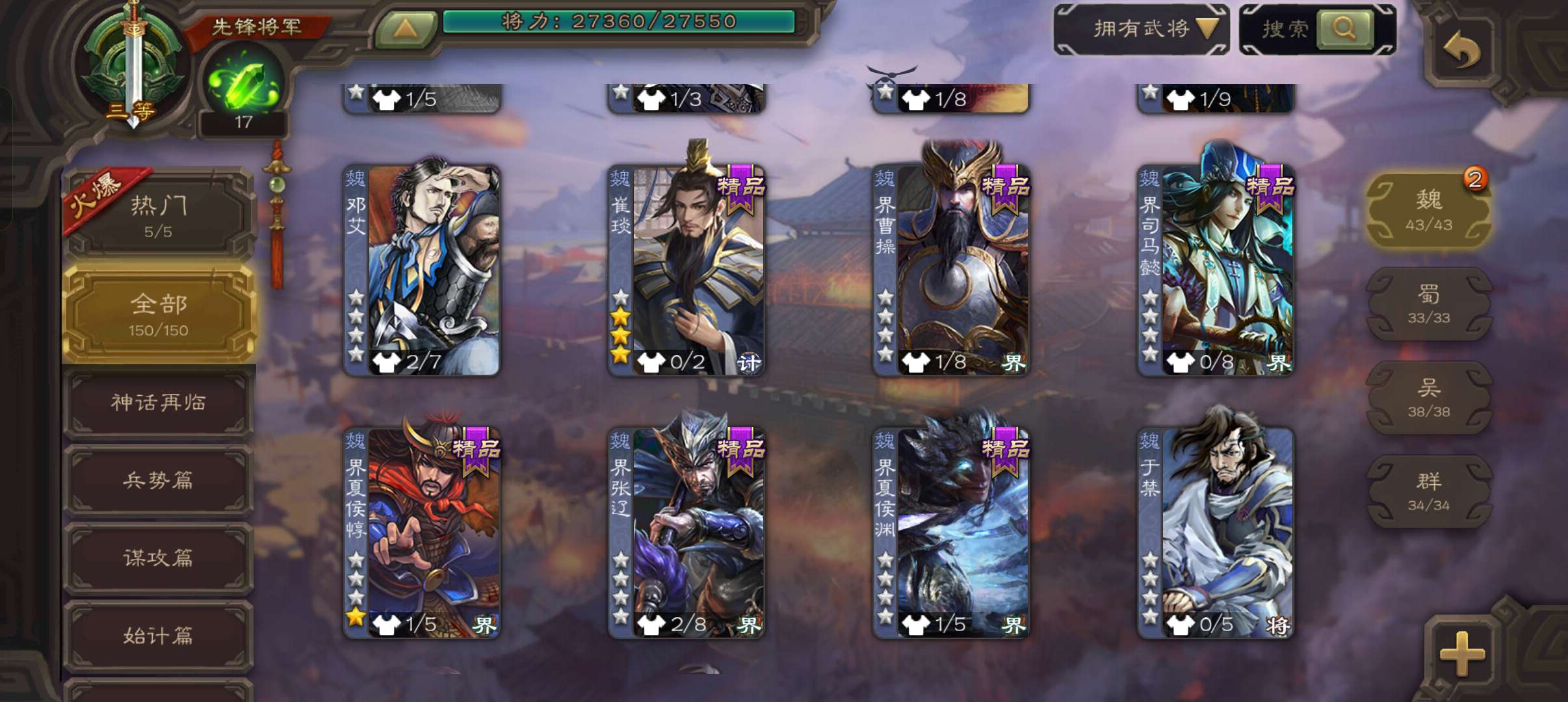 6史诗先锋,8.7万羽毛4万豆,神赵云王平赵襄杨修贺齐左慈,神吕蒙崔琰谋高顺150将
