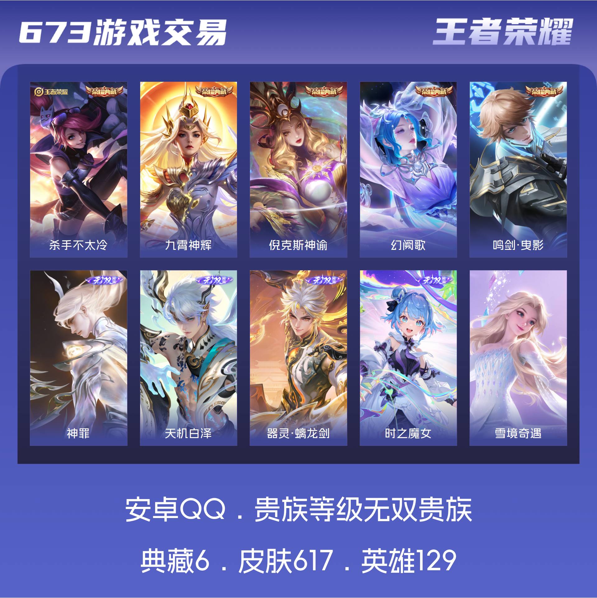 【商品标题】:安卓Q-V10-永恒钻石V段位-125英雄-512皮肤-16典藏