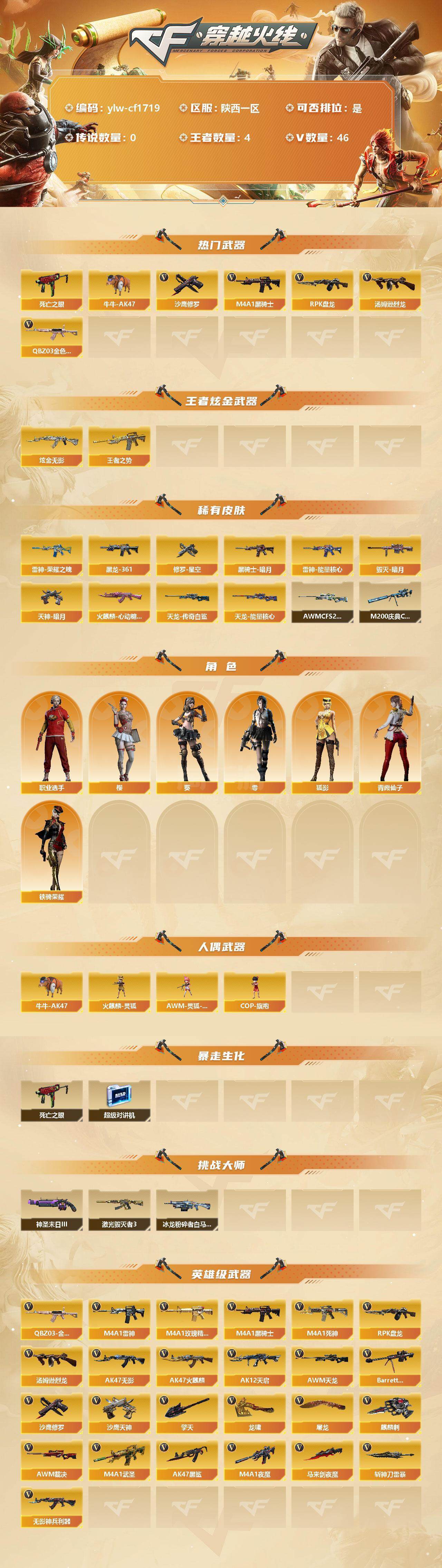 【稀有皮肤】:雷神-能量核心*2,雷神-荣耀之魄,火麒麟-心动糖果,黑骑士-暗月,M4A1-黑龙-361,毁灭-暗月,天龙-能量核心,AWM-天龙-传奇白鲨,M200-庆典-CFS