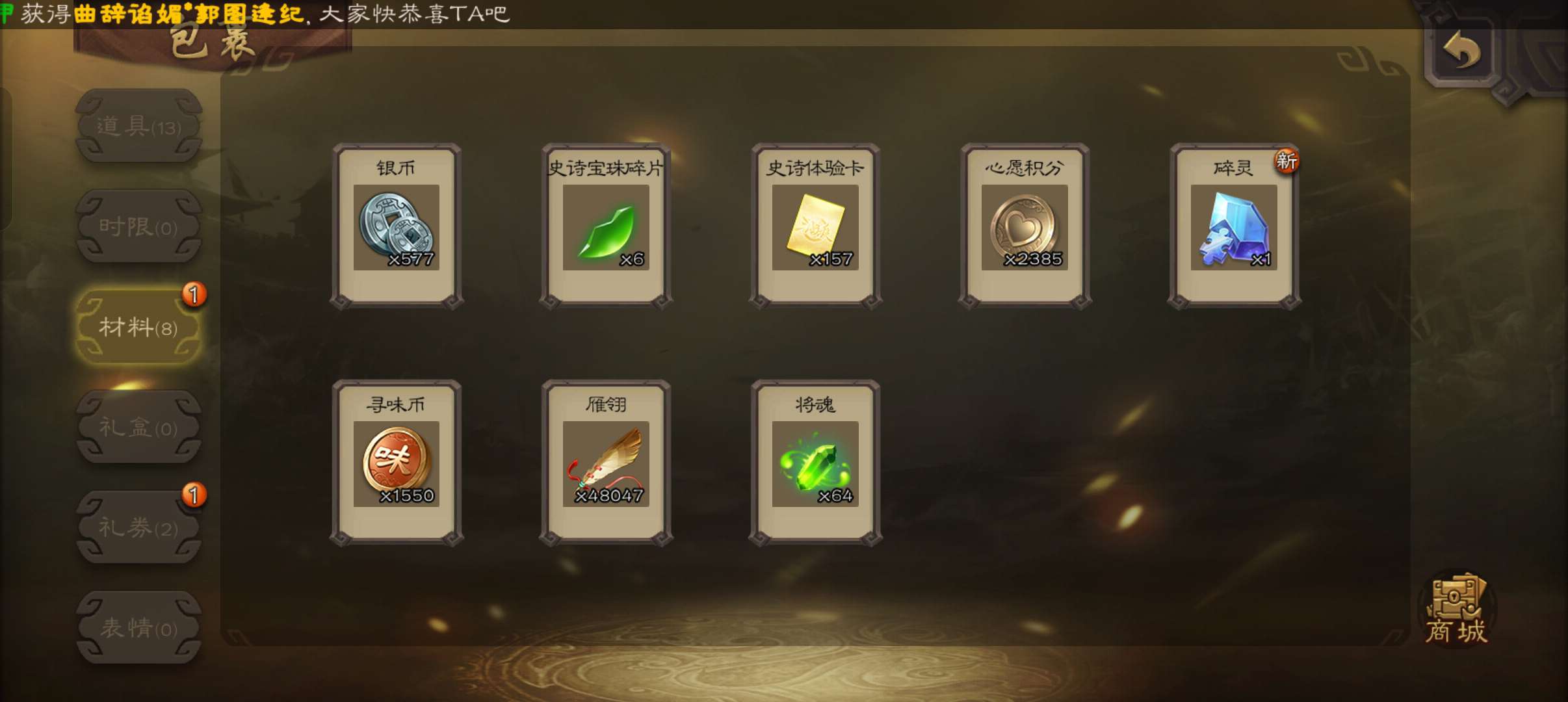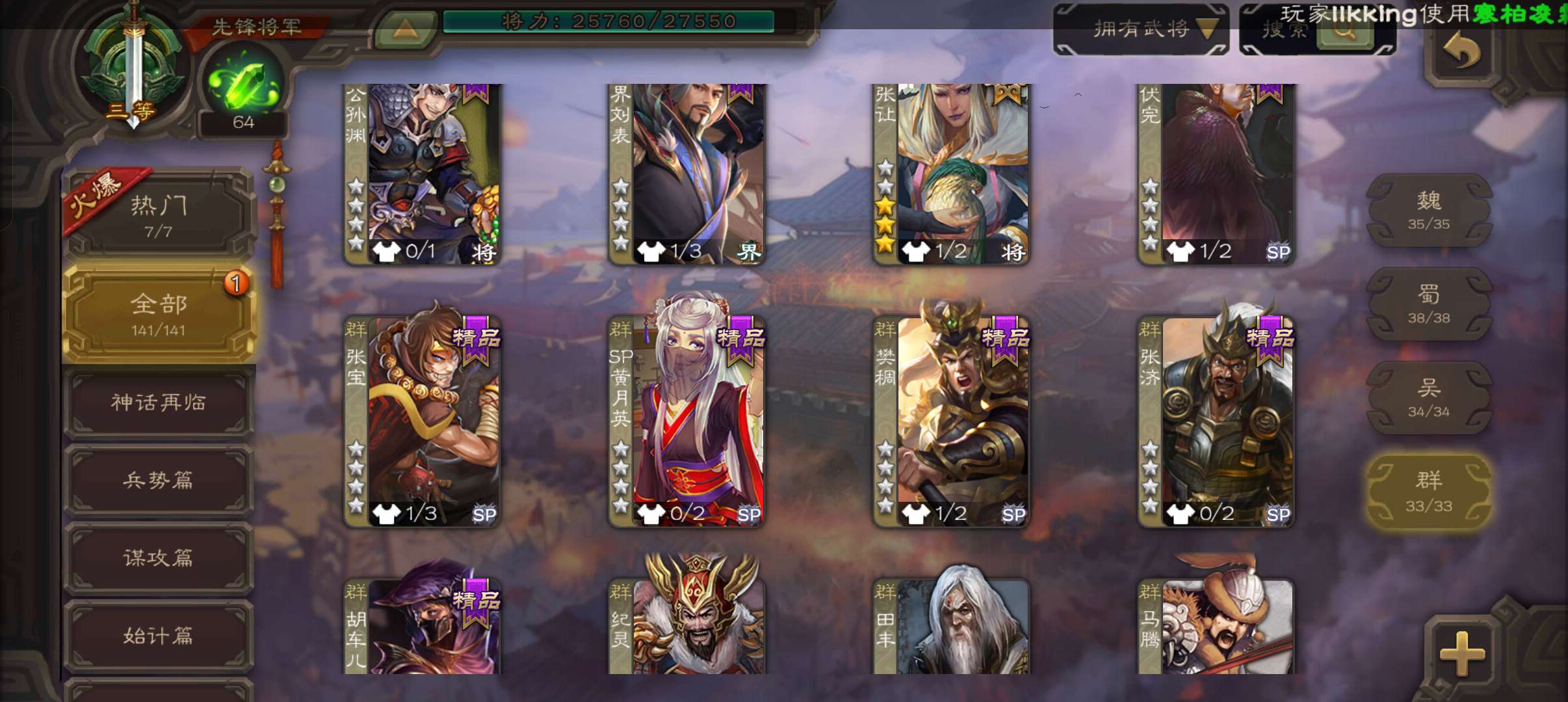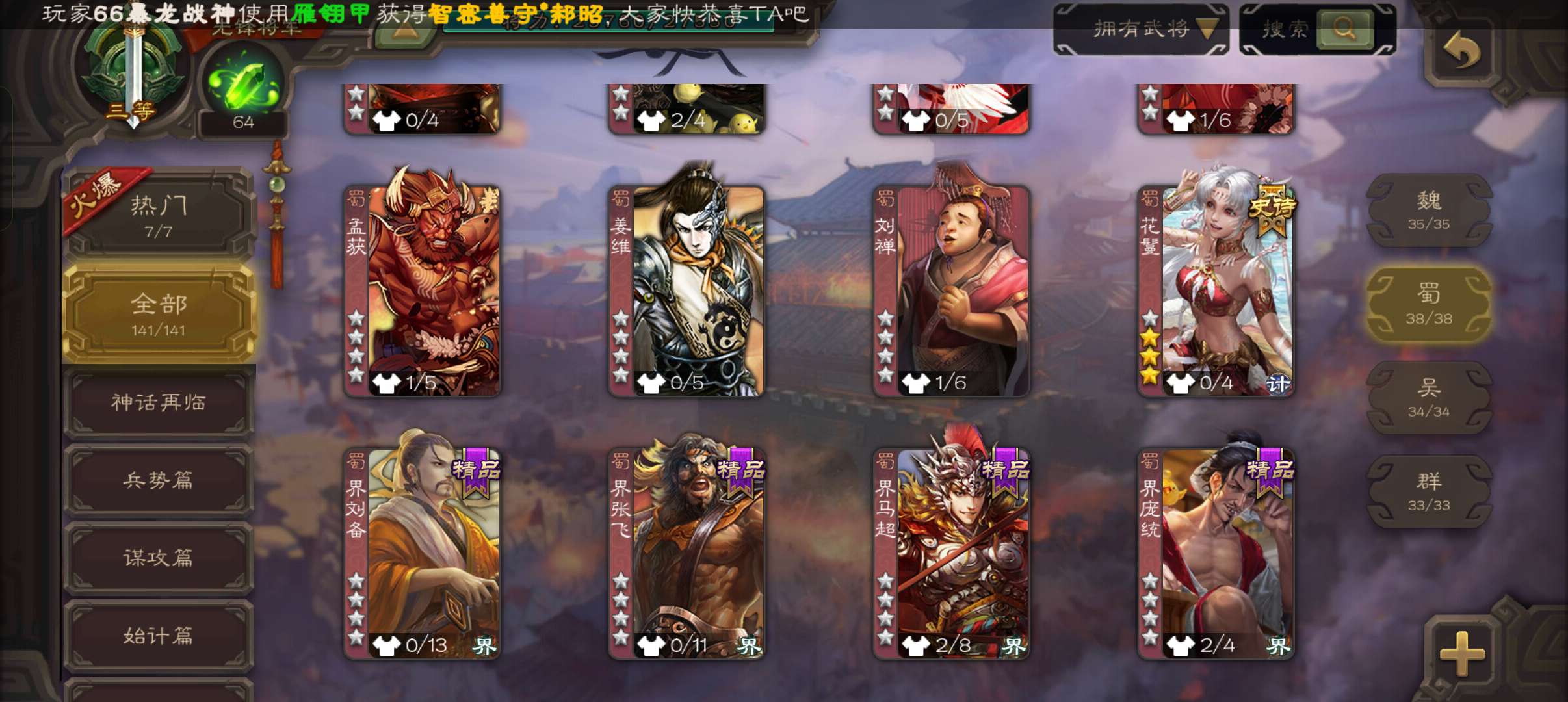 6史诗先锋,4.8万羽毛,金皮张让花鬘嵇康贺齐左慈杨修,神周瑜谋高顺谋韩当界吕布关银屏甘夫人141将
