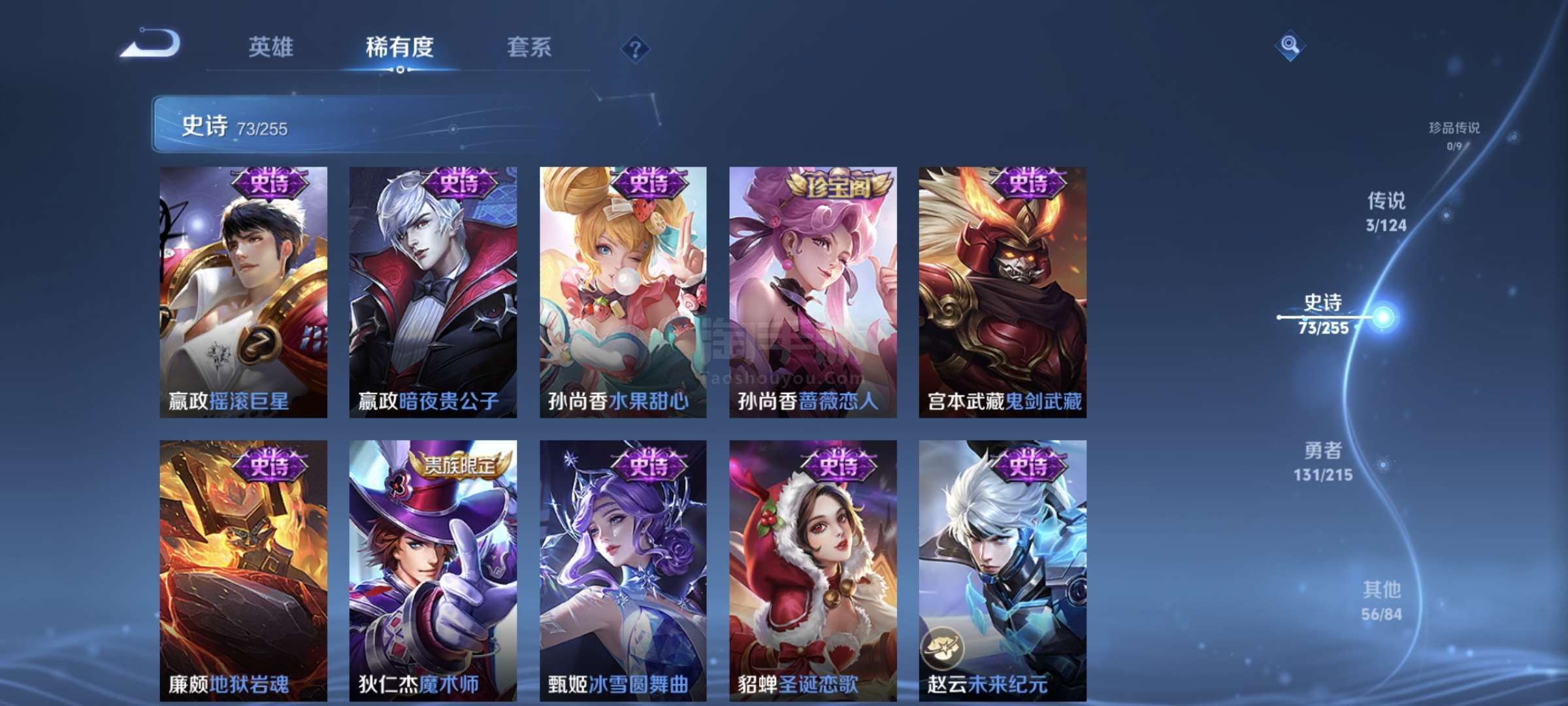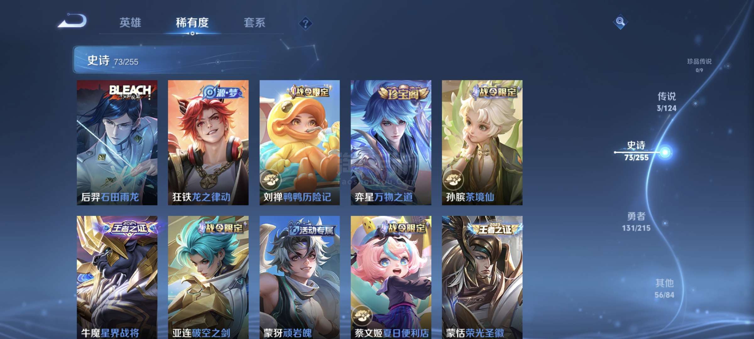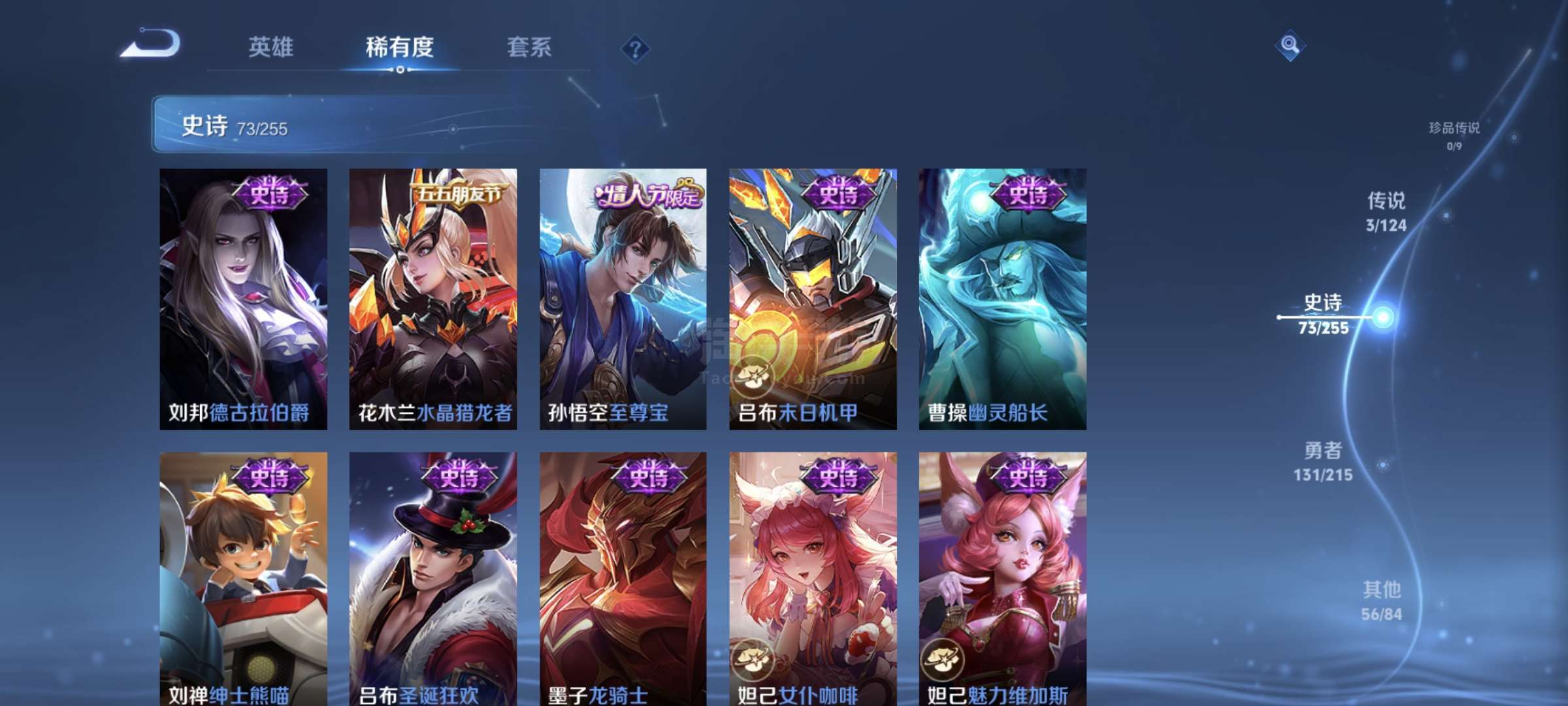 S3赛季老玩家,两个荣耀典藏皮肤,265个皮肤,四个省标,还有很多的市标,还有地狱火的星传说