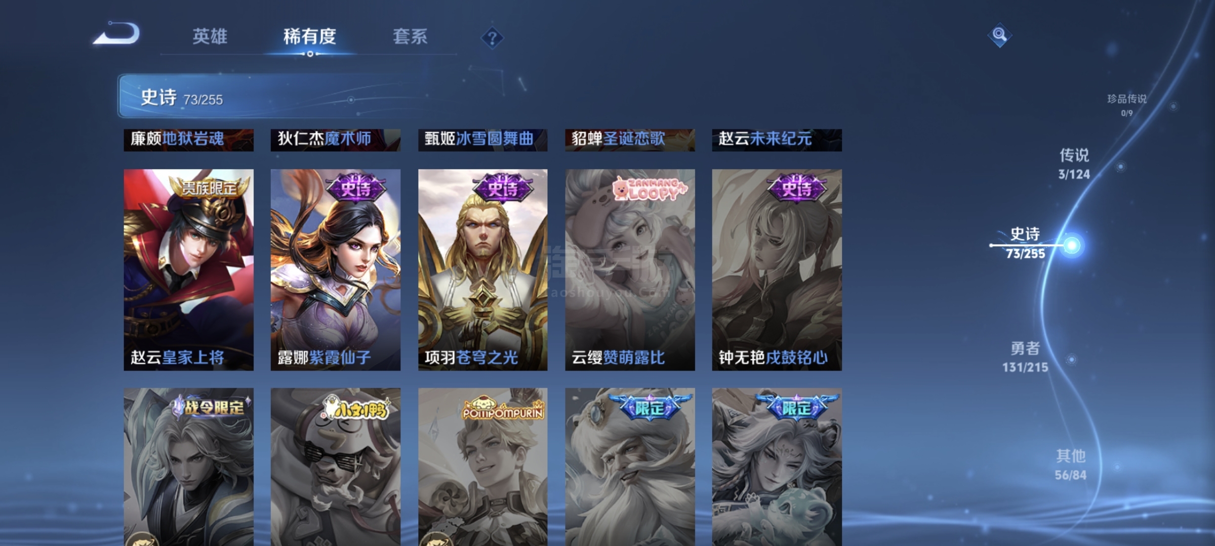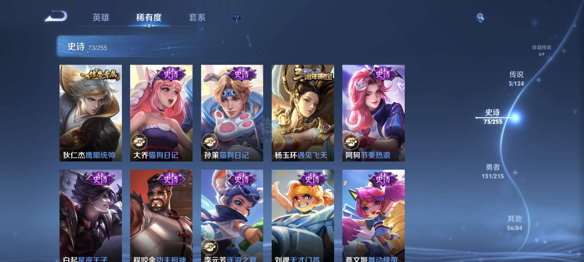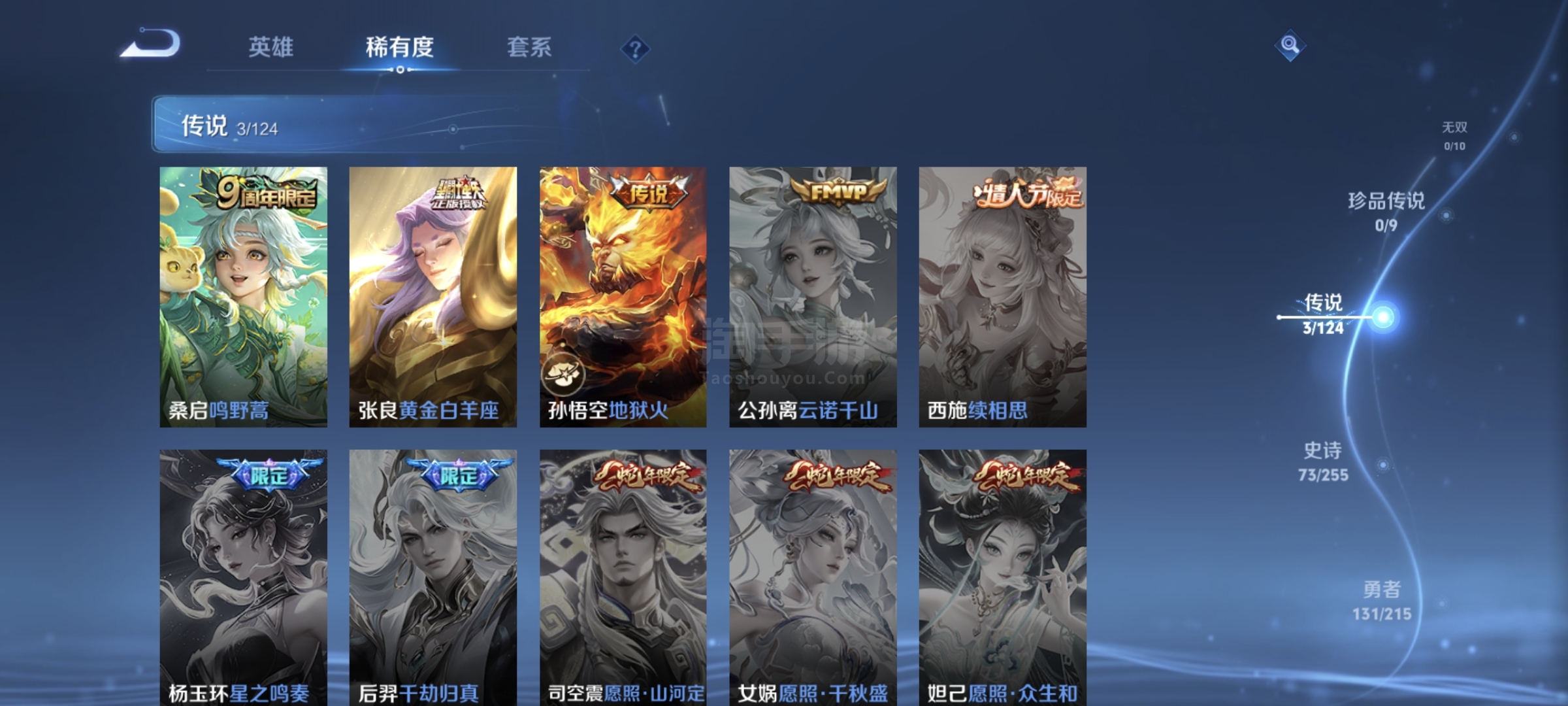 S3赛季老玩家,两个荣耀典藏皮肤,265个皮肤,四个省标,还有很多的市标,还有地狱火的星传说