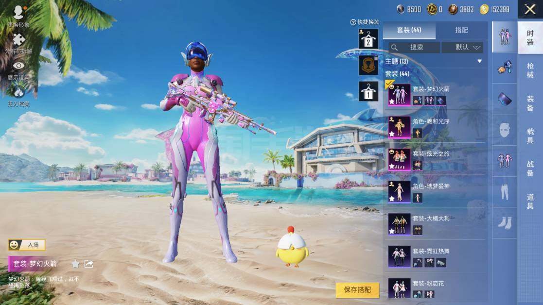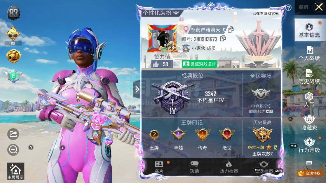安卓 微信 梦幻火箭 辉羽雀灵(四级Mk14-甜梦熊击)M762-鬼刀(五级)-3粉装-6特效枪 19697热力值-2印记-44套装-63枪皮