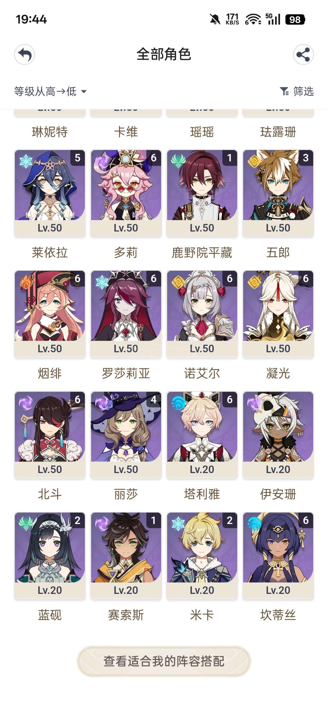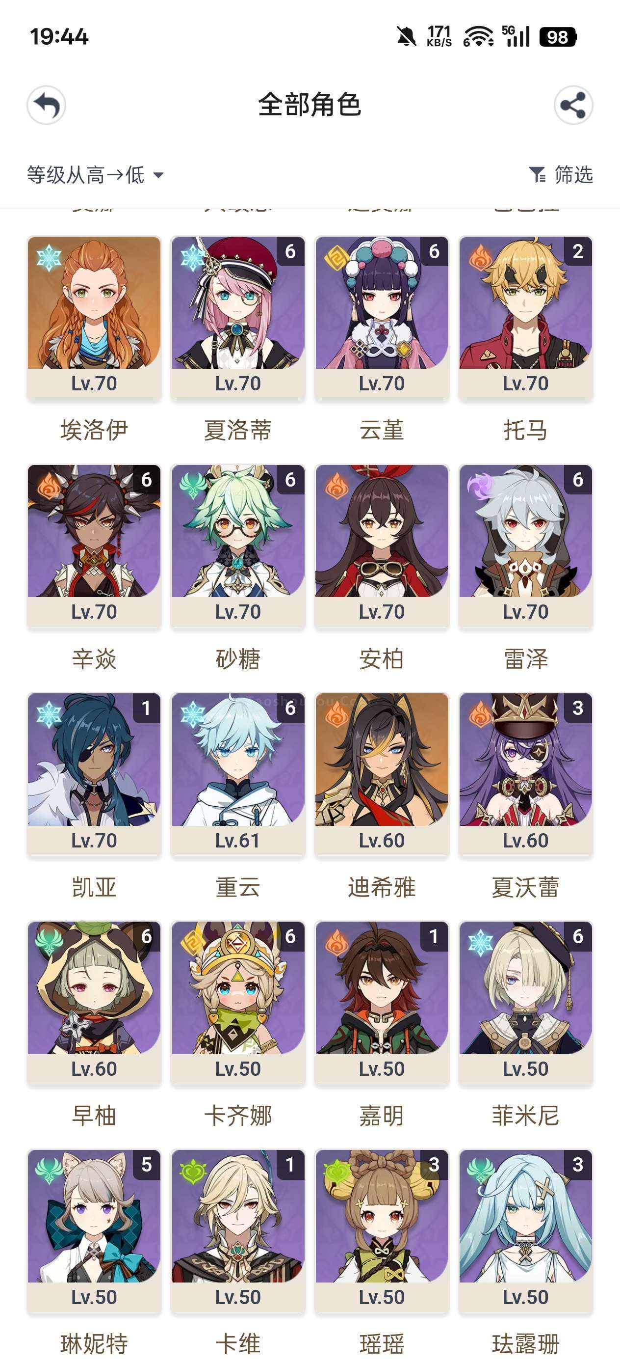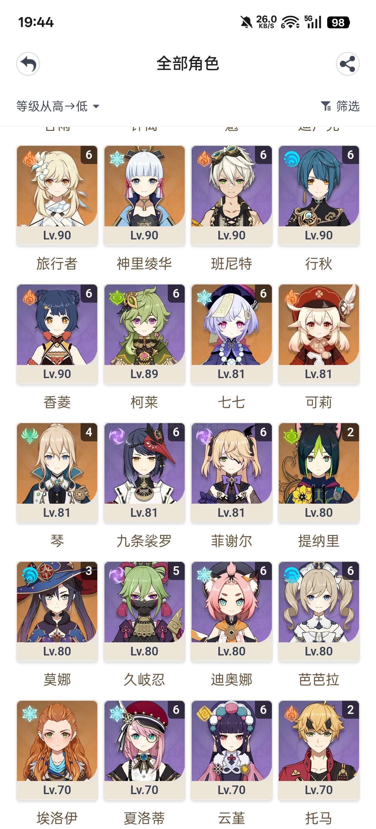 安卓官服 满命水神。20丝柯克21火神61水神31龙王21雷神21草神11夜阑01奶奶01希诺宁31魈