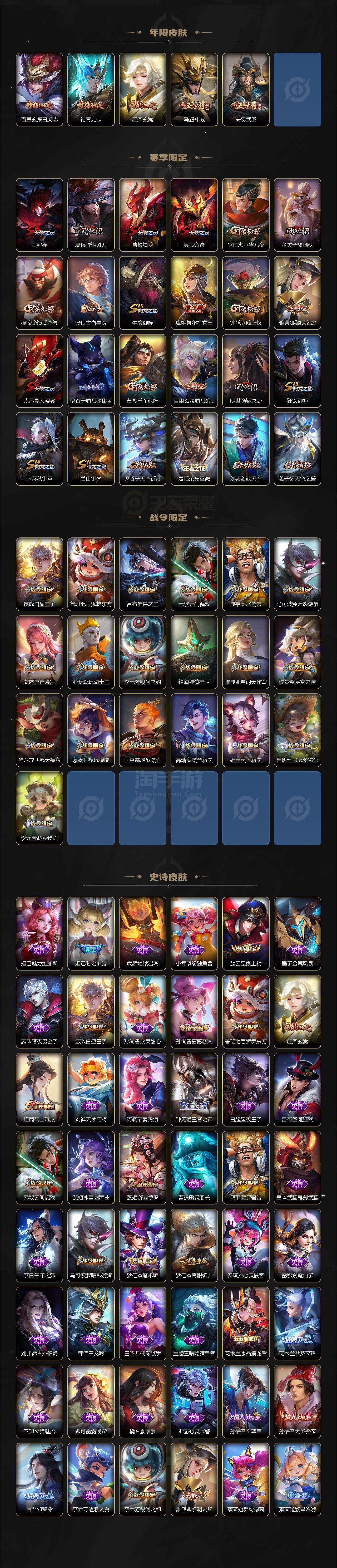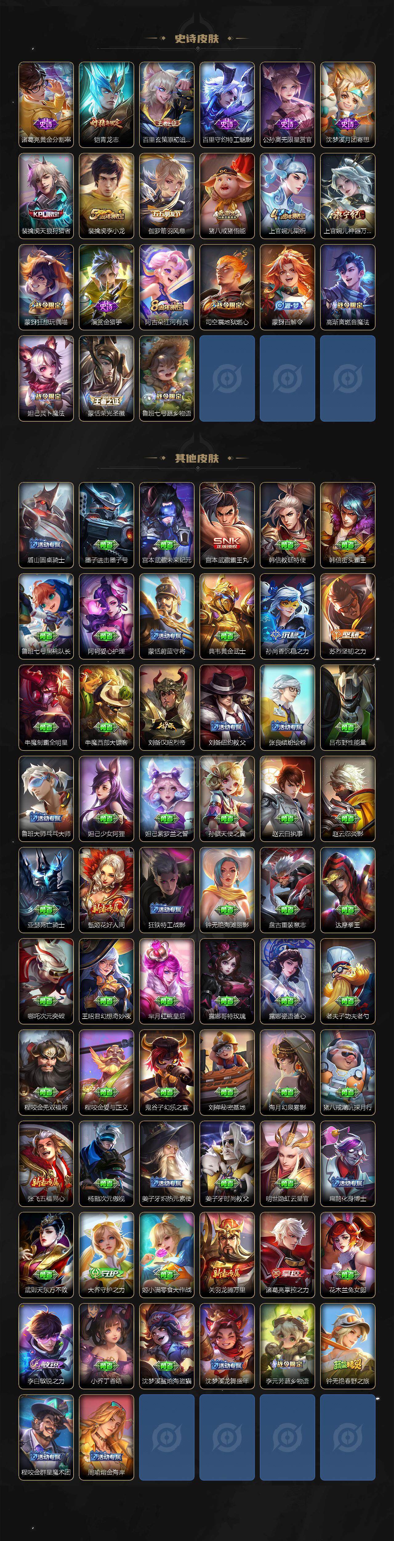 【传说皮肤】:武则天海洋之心,关羽武圣,孙悟空零号赤焰,干将莫邪久胜战神,百里玄策白虎志,镜炽阳神光,貂蝉曦玄引,桑启鸣野蒿,澜愿照九州拓