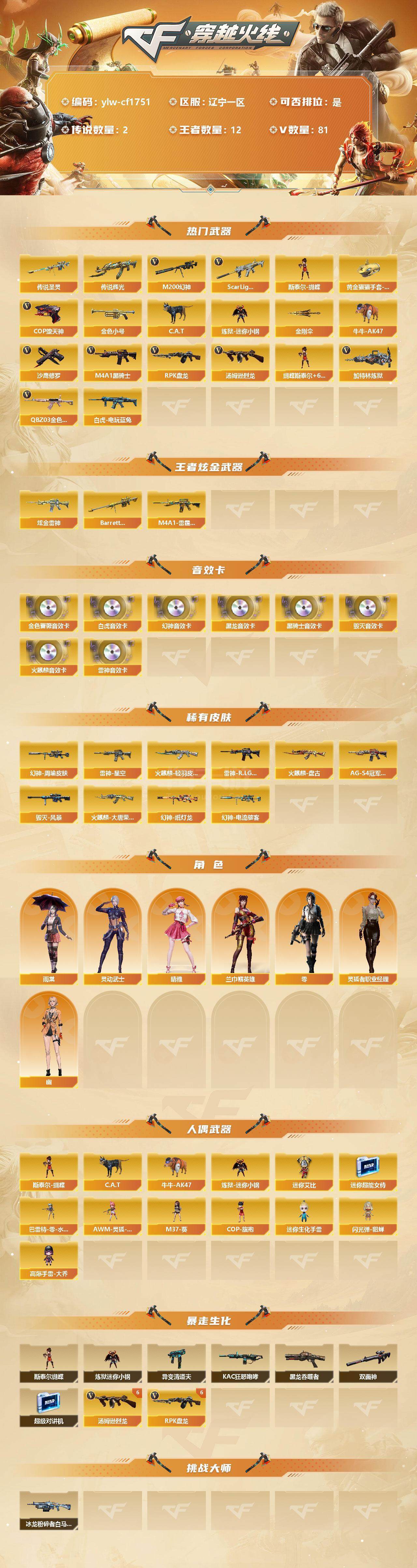 穿越火线(CF)【端游】【商品标题】:辽宁一区-81V-12王者-1炫金