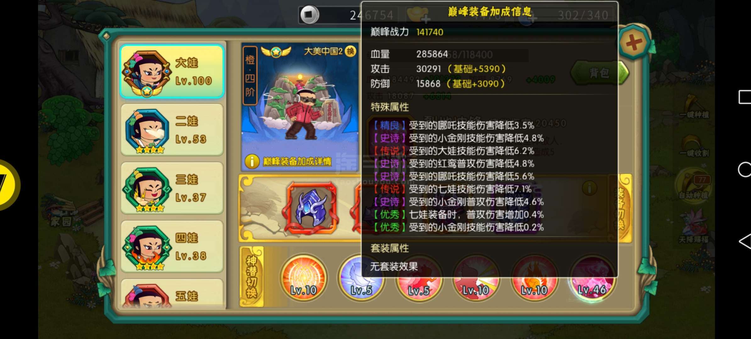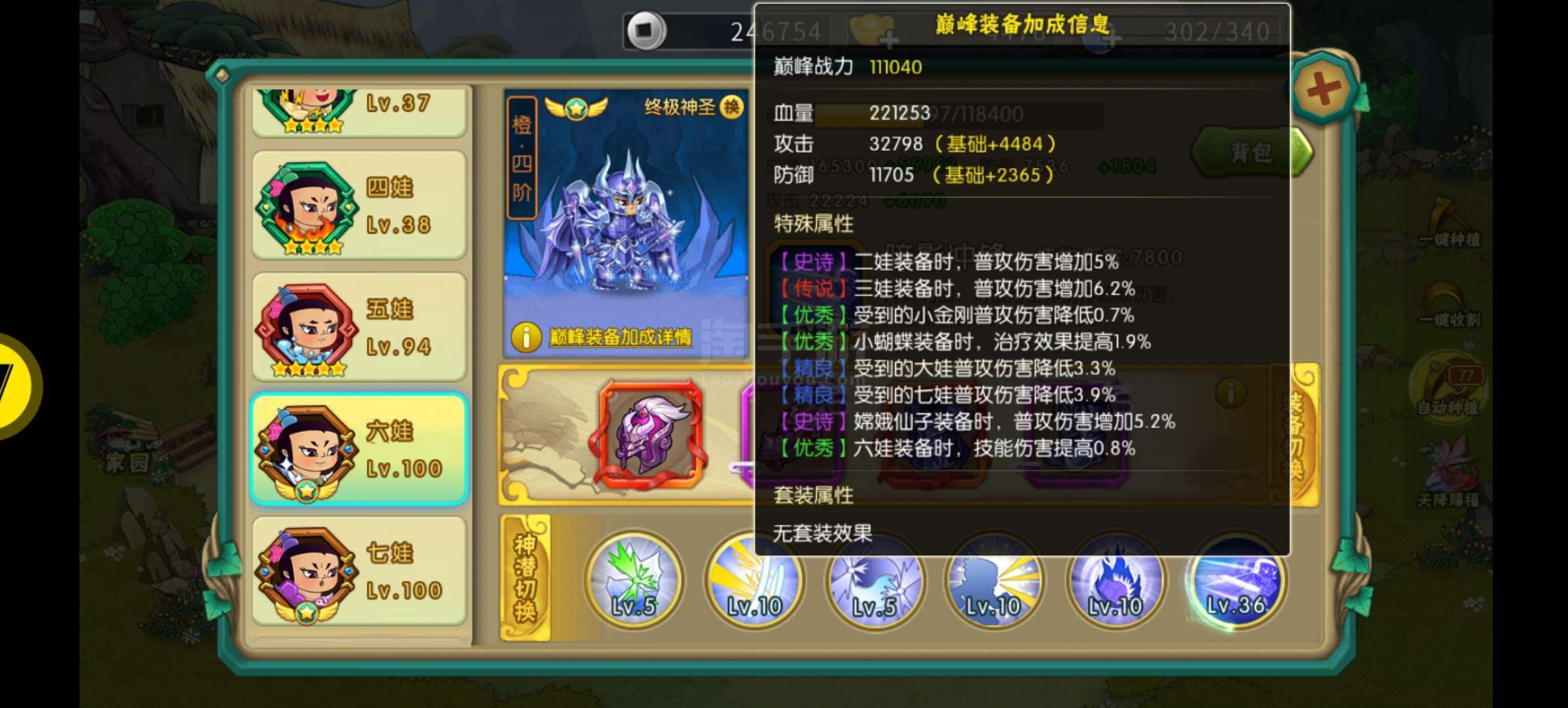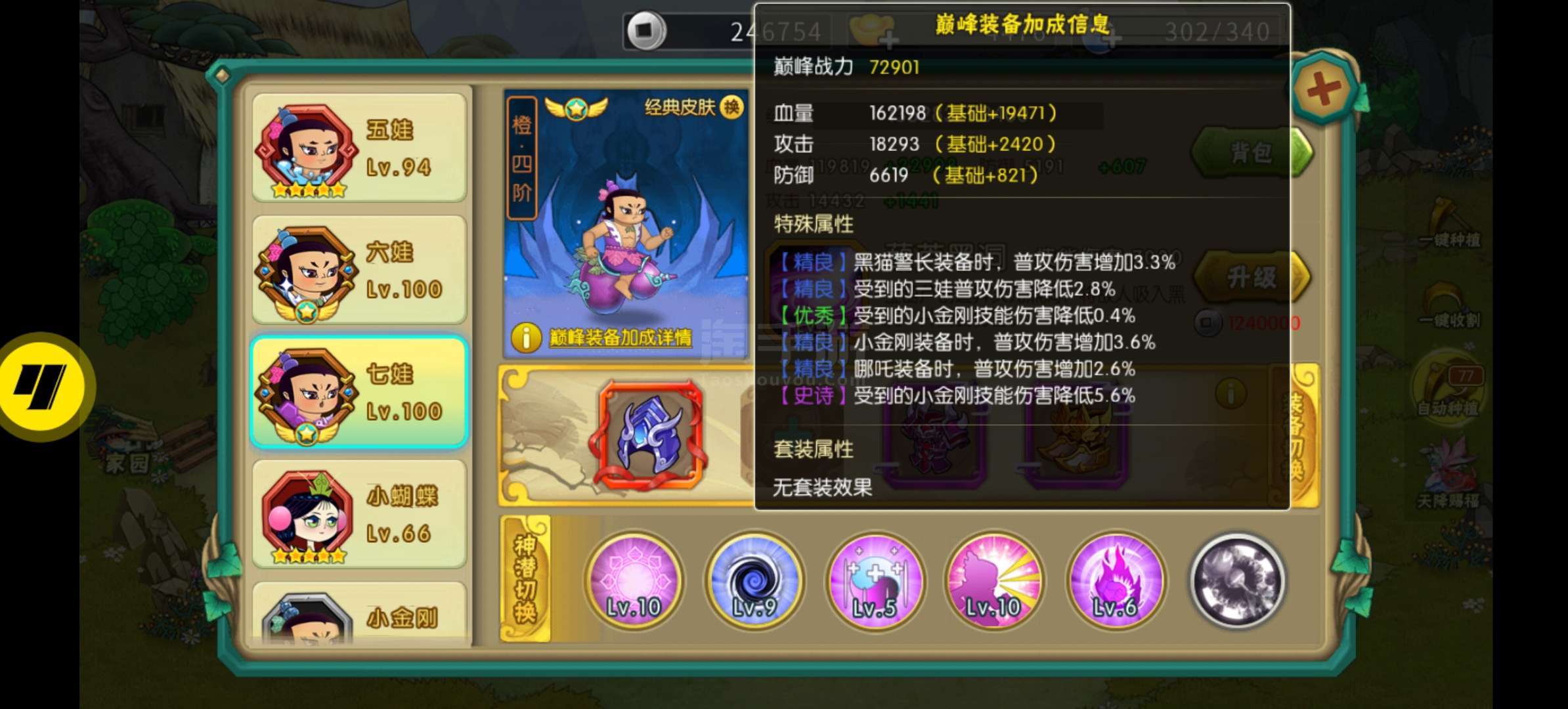 开区100多天,1-6-猴子橙4满装,7娃橙4,6娃神兽点亮4个小技能,猴子点亮4个5娃和大娃有神兽