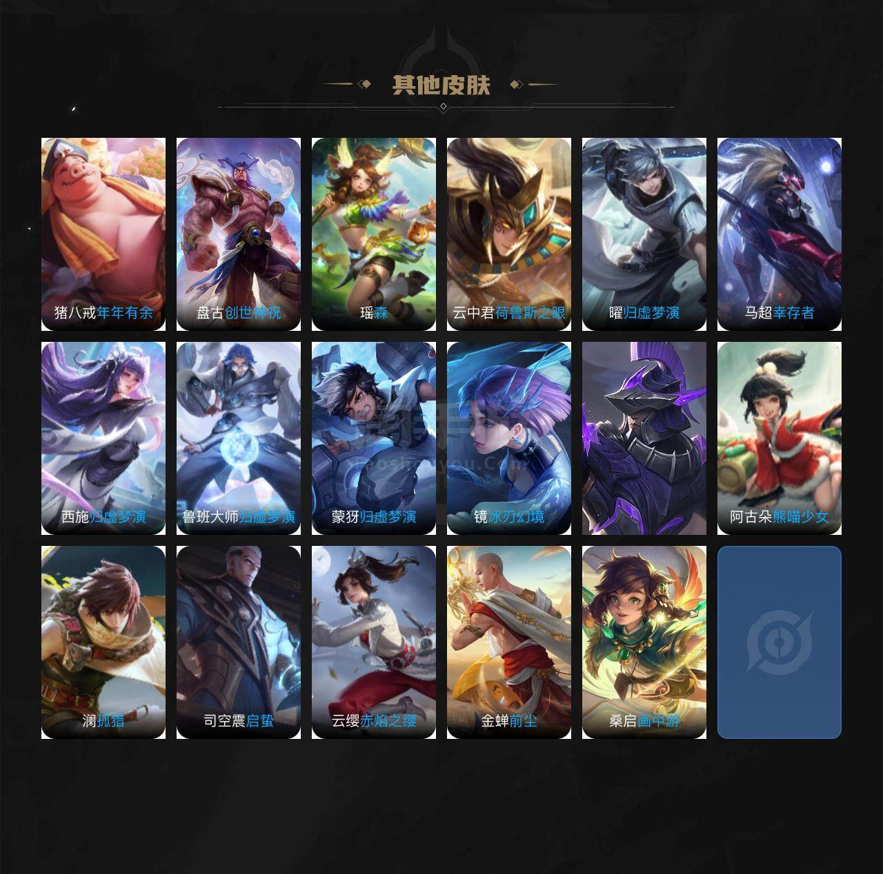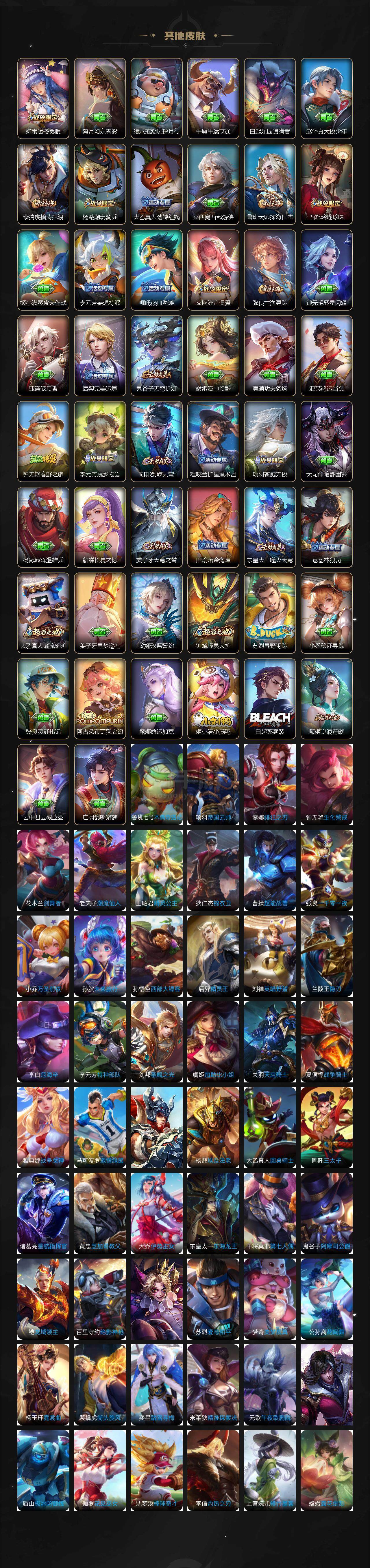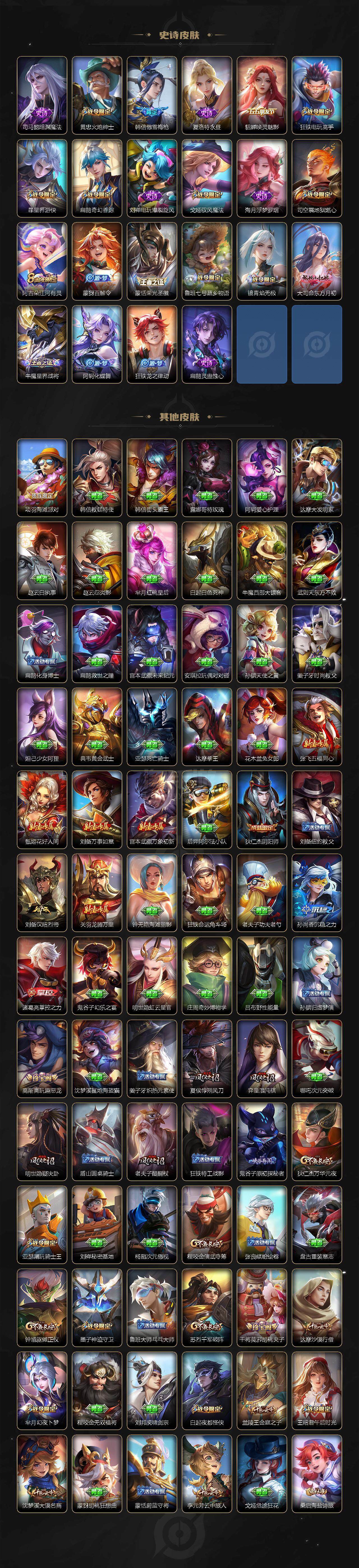 【传说皮肤】:孙悟空地狱火,干将莫邪久胜战神,貂蝉猫影幻舞,李信一念神魔,曜云鹰飞将,虞姬启明星使,王昭君乞巧织情,赵云淬星耀世,马超无双飞将,李白诗