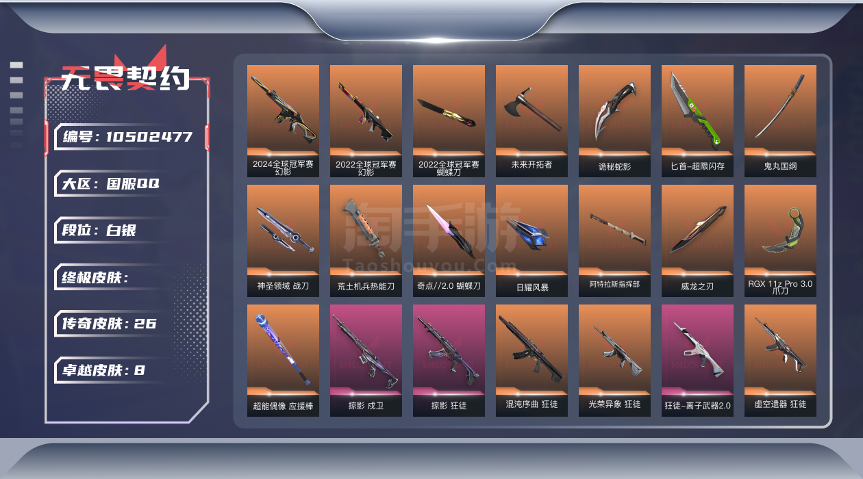 22套+24幻影 多款热门刀皮 KQY3498 亮点皮肤: 幻影-2024全球冠军赛,幻影-2022全球冠军赛,蝴蝶刀-2022全球冠军赛 近战武器皮肤: 威龙之刃,超能偶像 应援棒,爪刀-RGX 11z Pro 3.0,匕首-超限闪存,蝴蝶刀-奇点//2.0,荒土机兵热能刀,鬼丸国纲,神圣领域 战刀,未来开拓者,诡秘蛇影,日耀风暴,阿特拉斯指挥部 步枪皮肤: 狂徒-紫阙金琅,幻影-侦察力量,狂徒-塑水宗,狂徒-洪荒怒焰,狂徒-混沌序曲,狂徒-掠影,戍卫-掠影,幻影-异鳞魔蛇,幻影-西部未来,狂