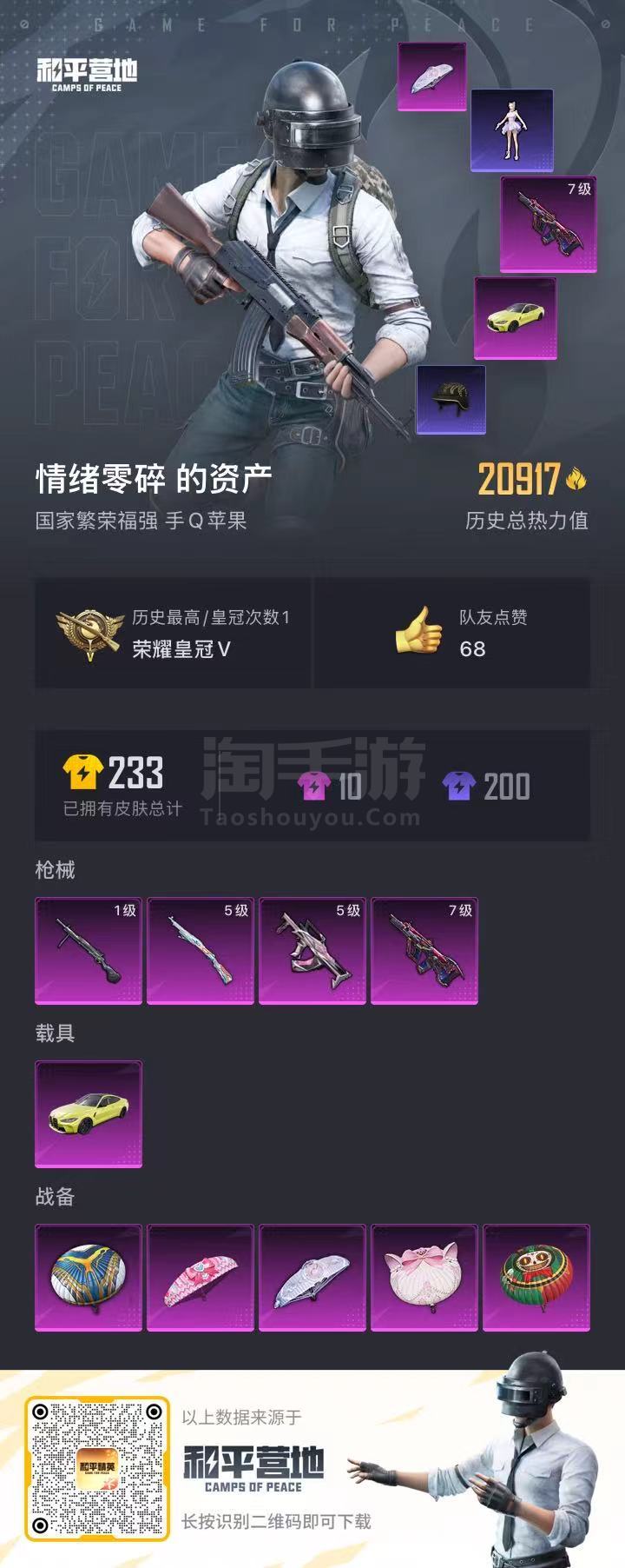 和平精英 苹果QQ 套装数量:41 枪皮数量:68 粉枪数量:4 连体号 还有王者号王者充了1800,63皮家里有事求,可砍价