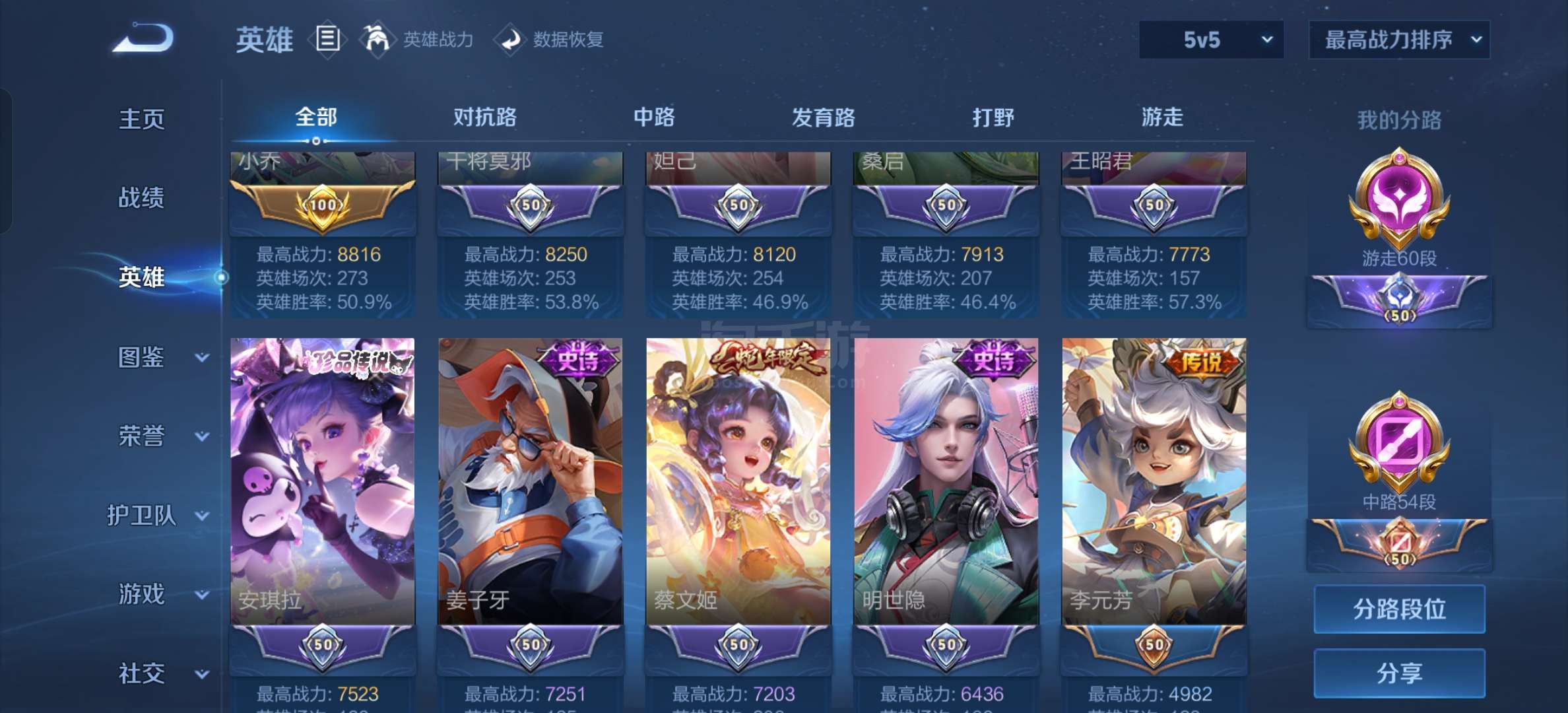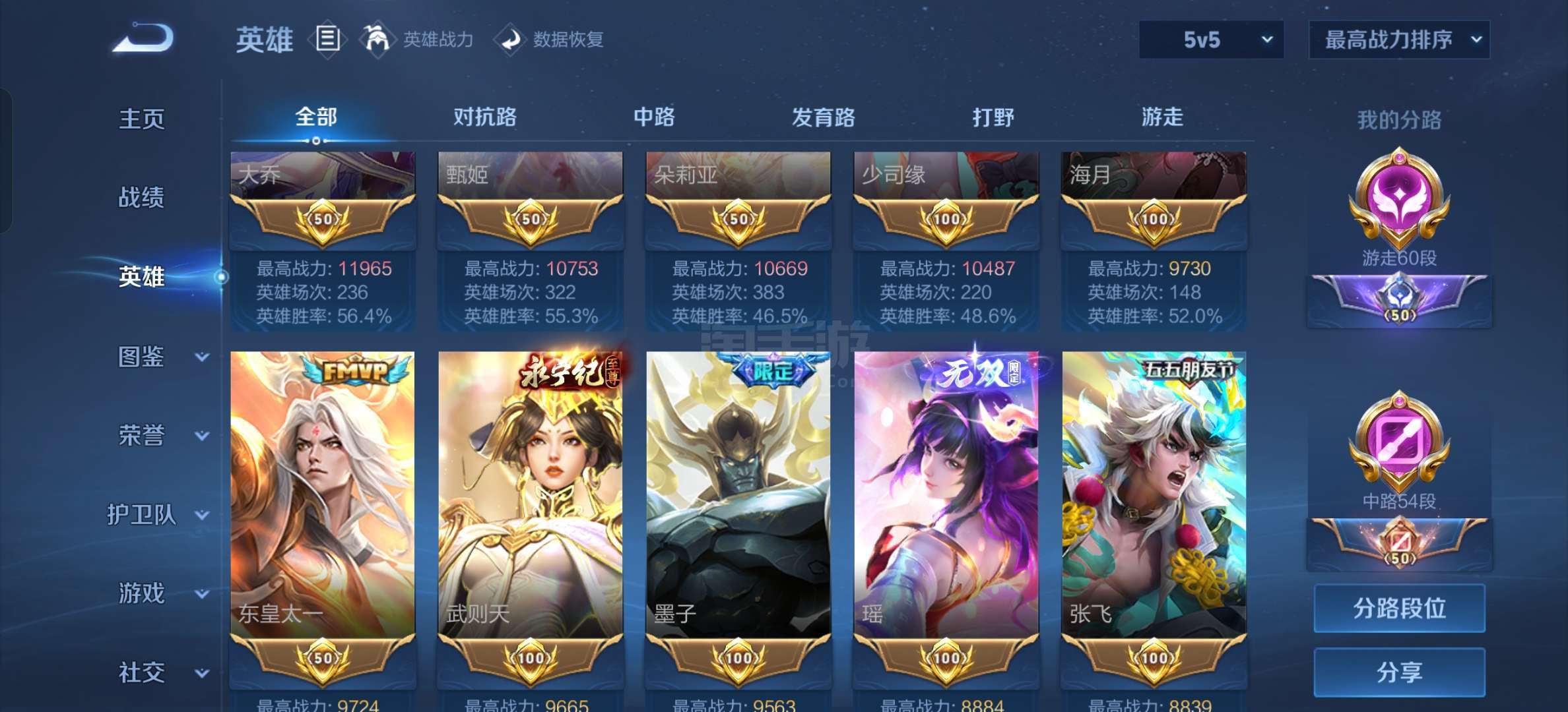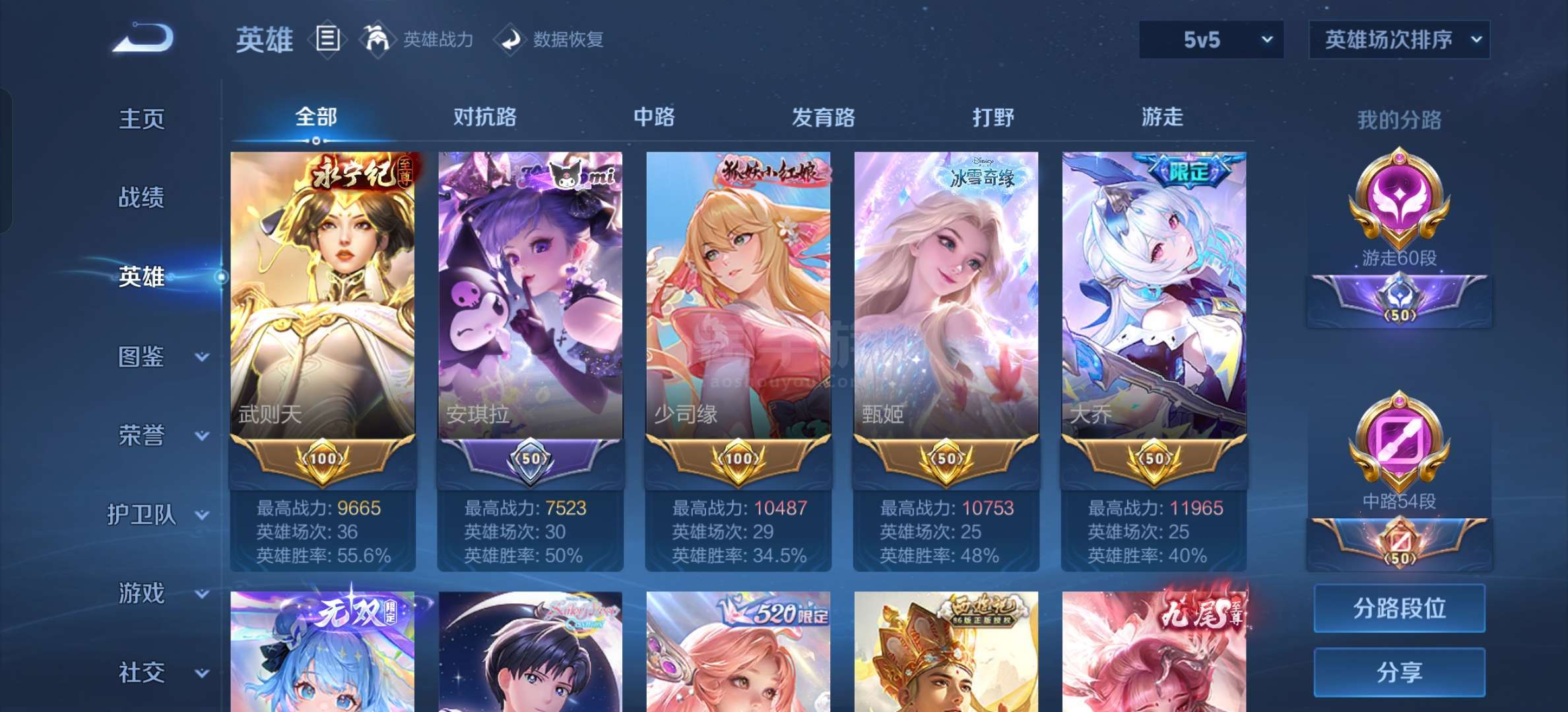 安卓微信 贵十女生号游走 60 段中路 54 段4典藏5无双1珍品93传说
