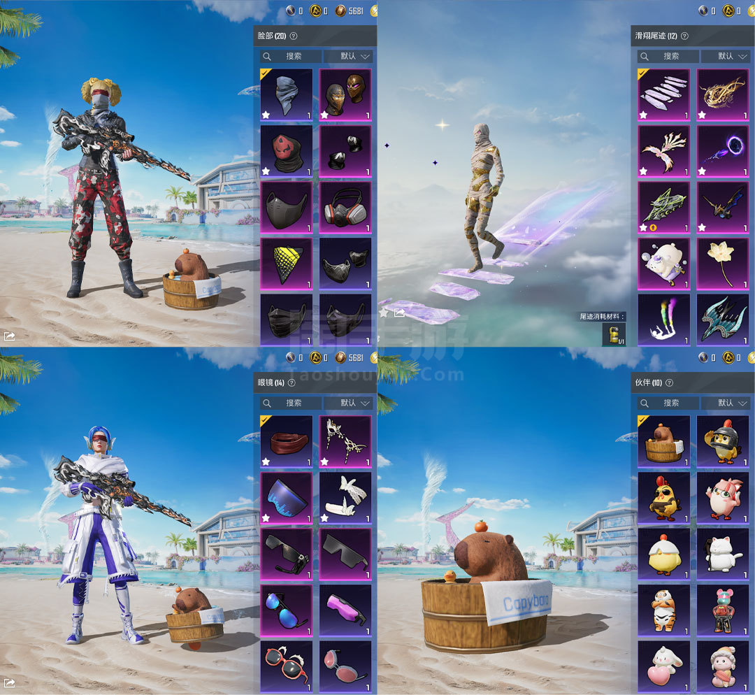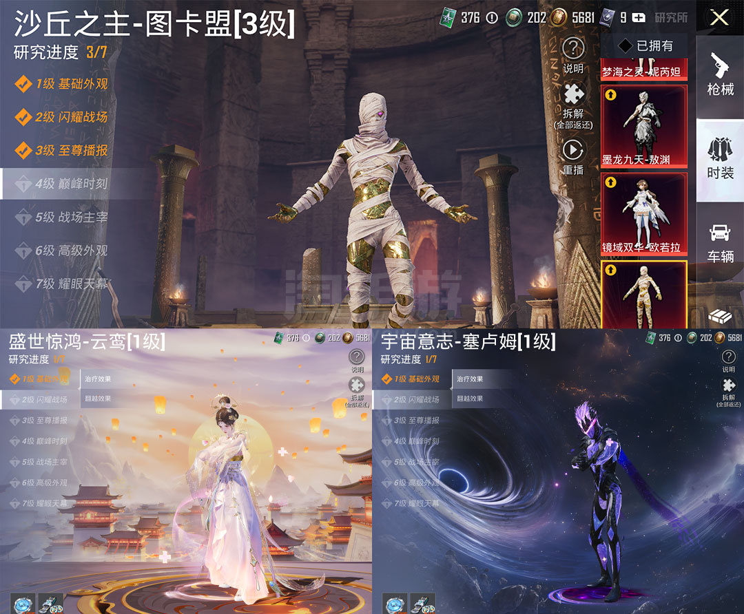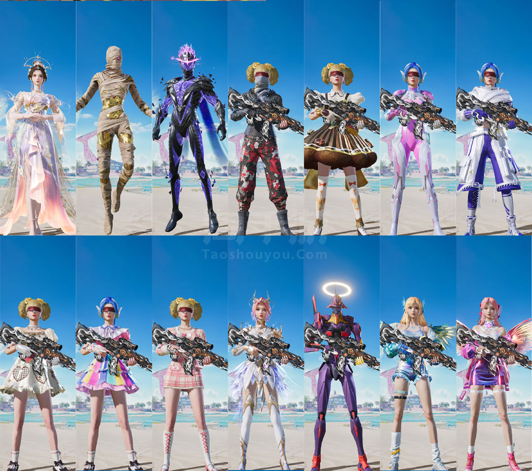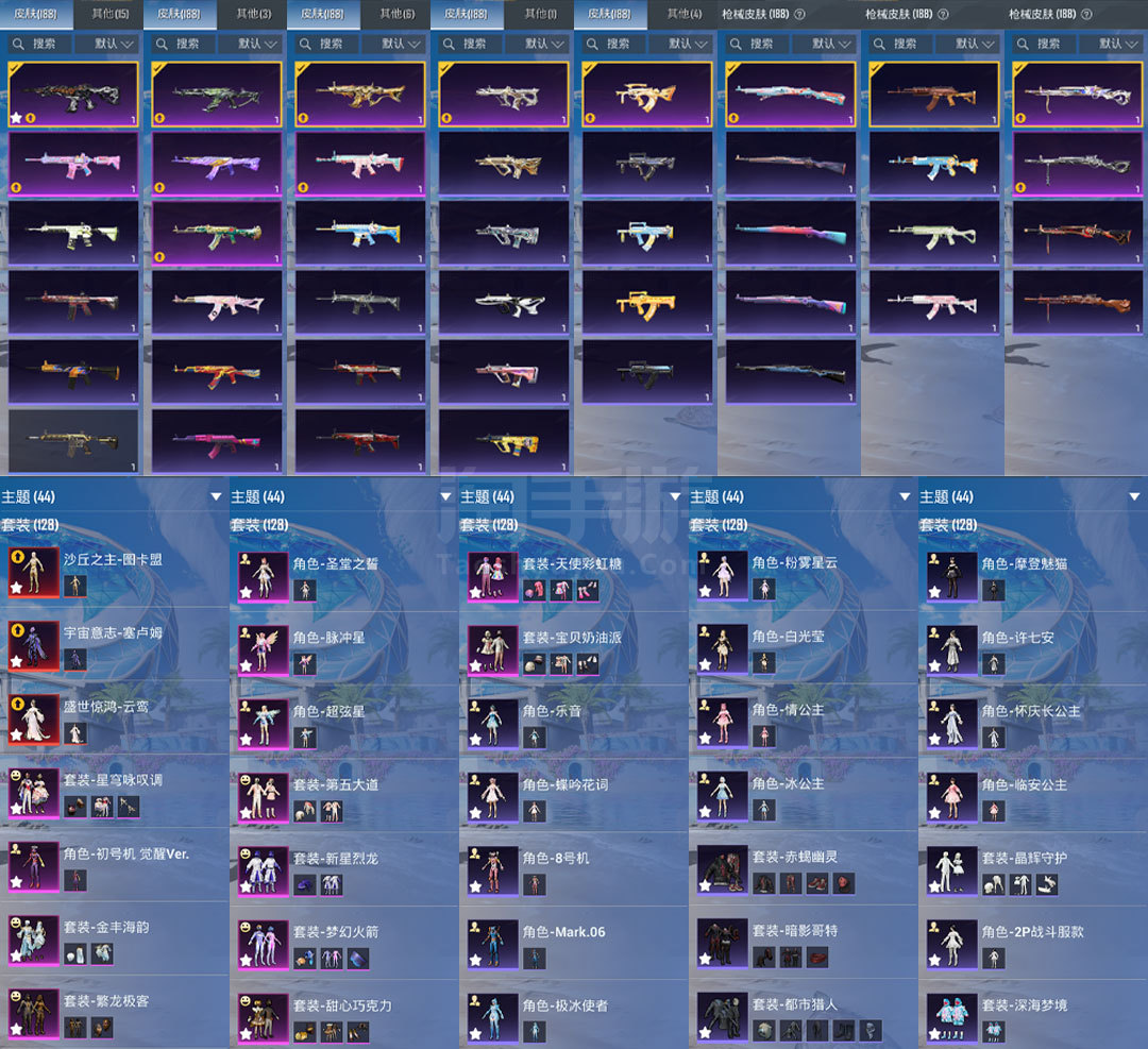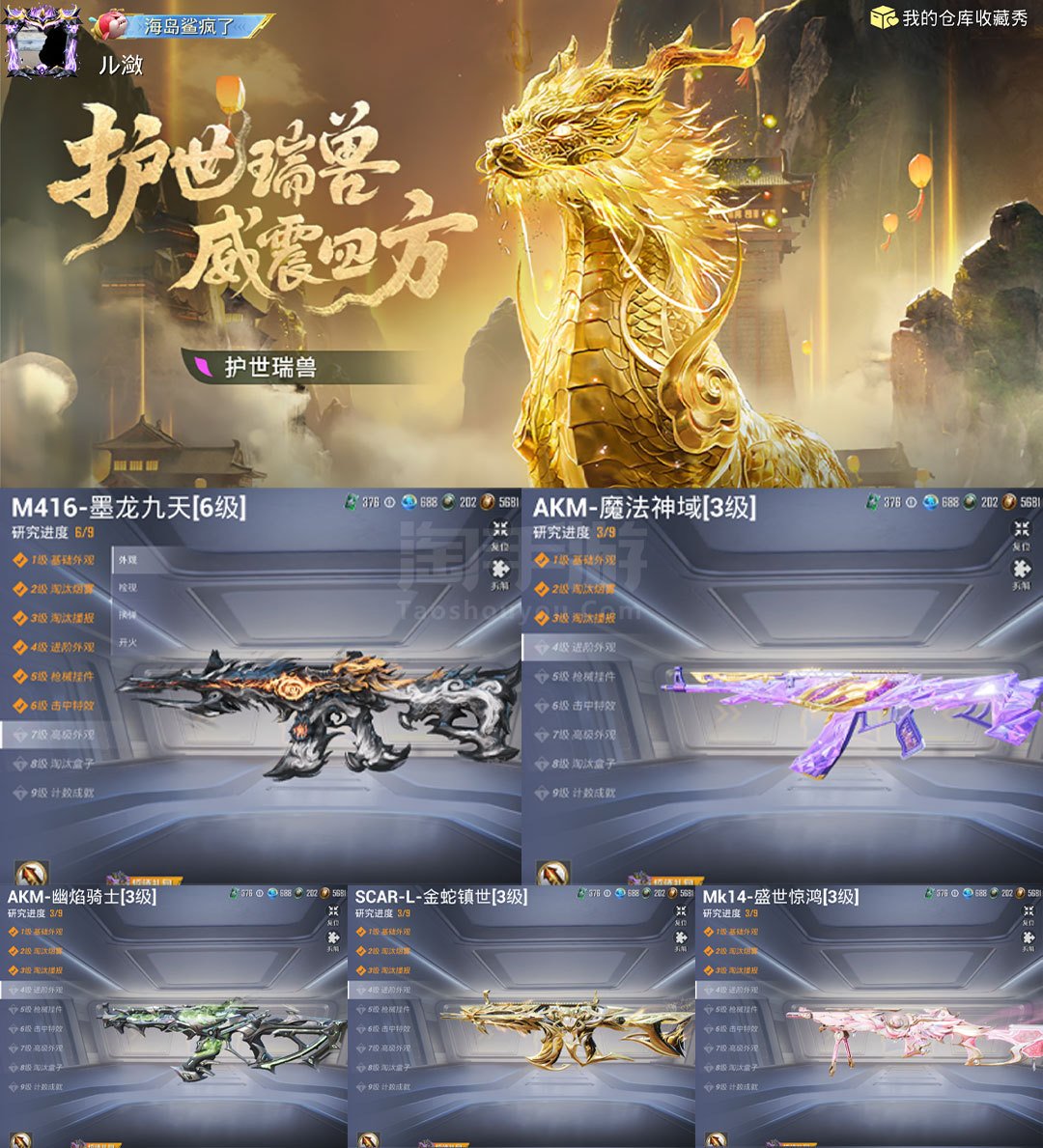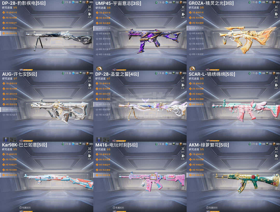 特效枪14:M416-墨龙九天-6级 ,AKM-魔法神域-3级 ,AKM-幽焰骑士-3级, SCAR-L-金蛇镇世-3级 , GROZA-精灵之光-3级, AMk14-盛世惊鸿-3级