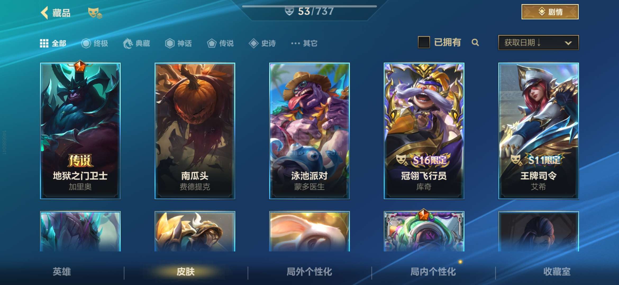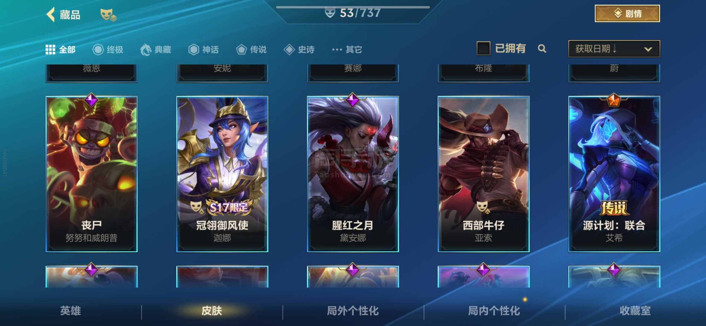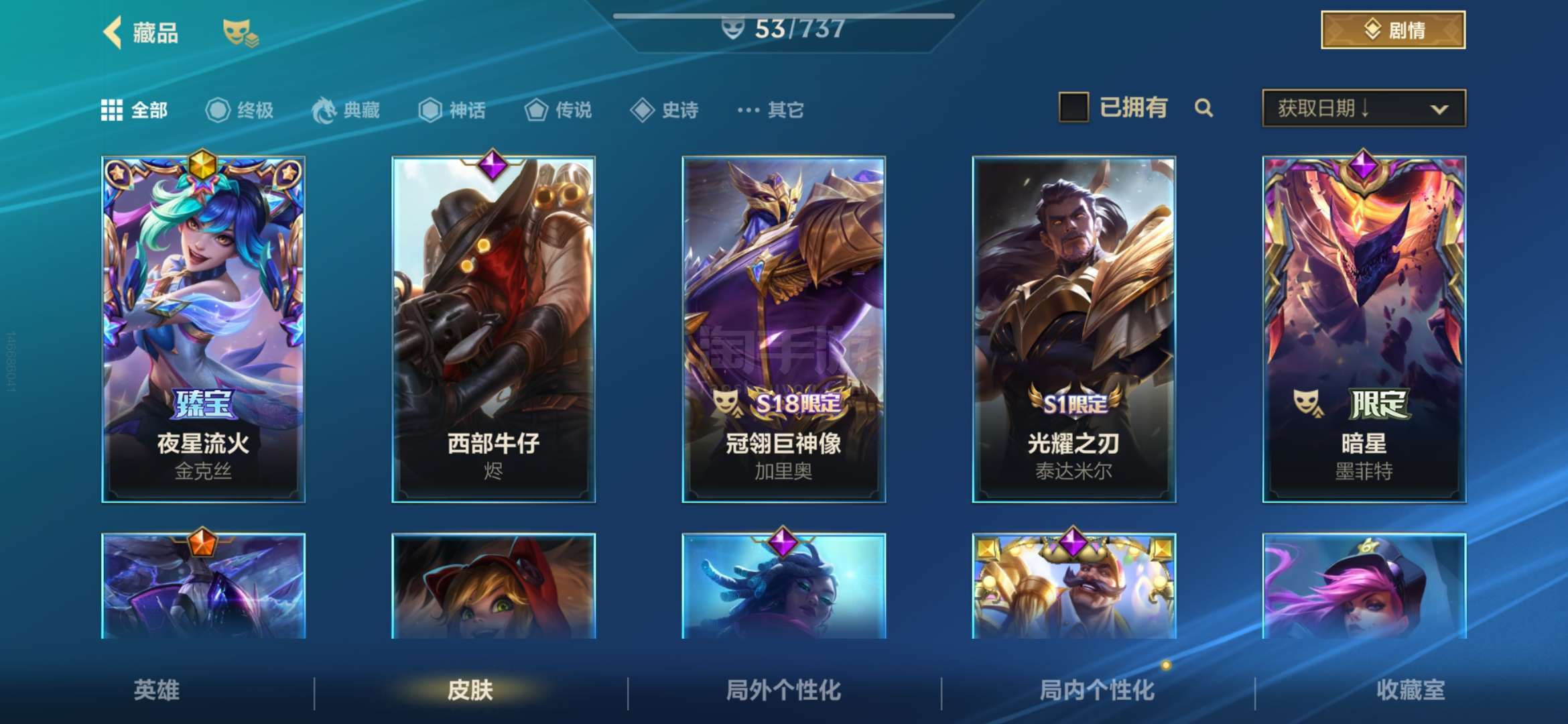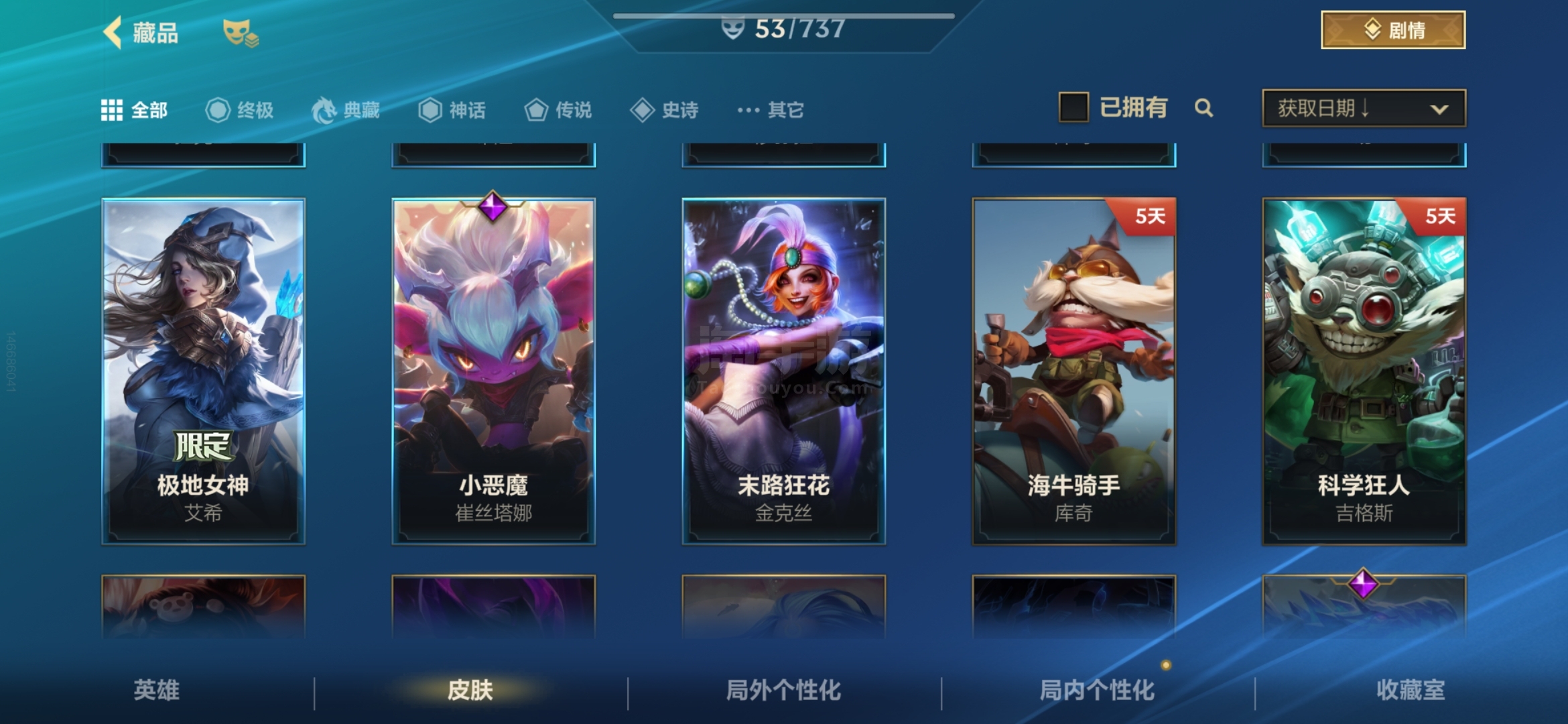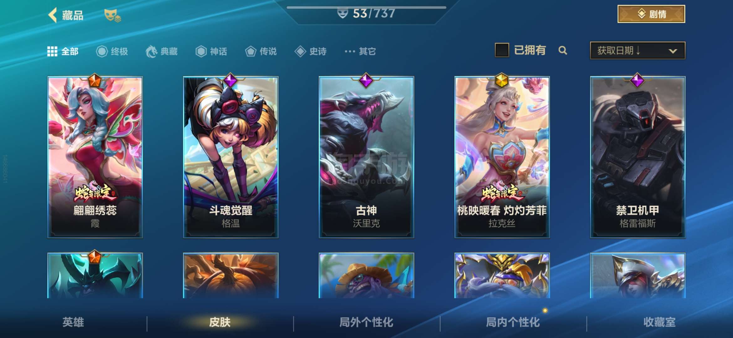 安卓QQ 传说皮肤数量:6 神话皮肤数量:2 皮肤数量:53 英雄数量:60 多传说 限定 高质量史诗