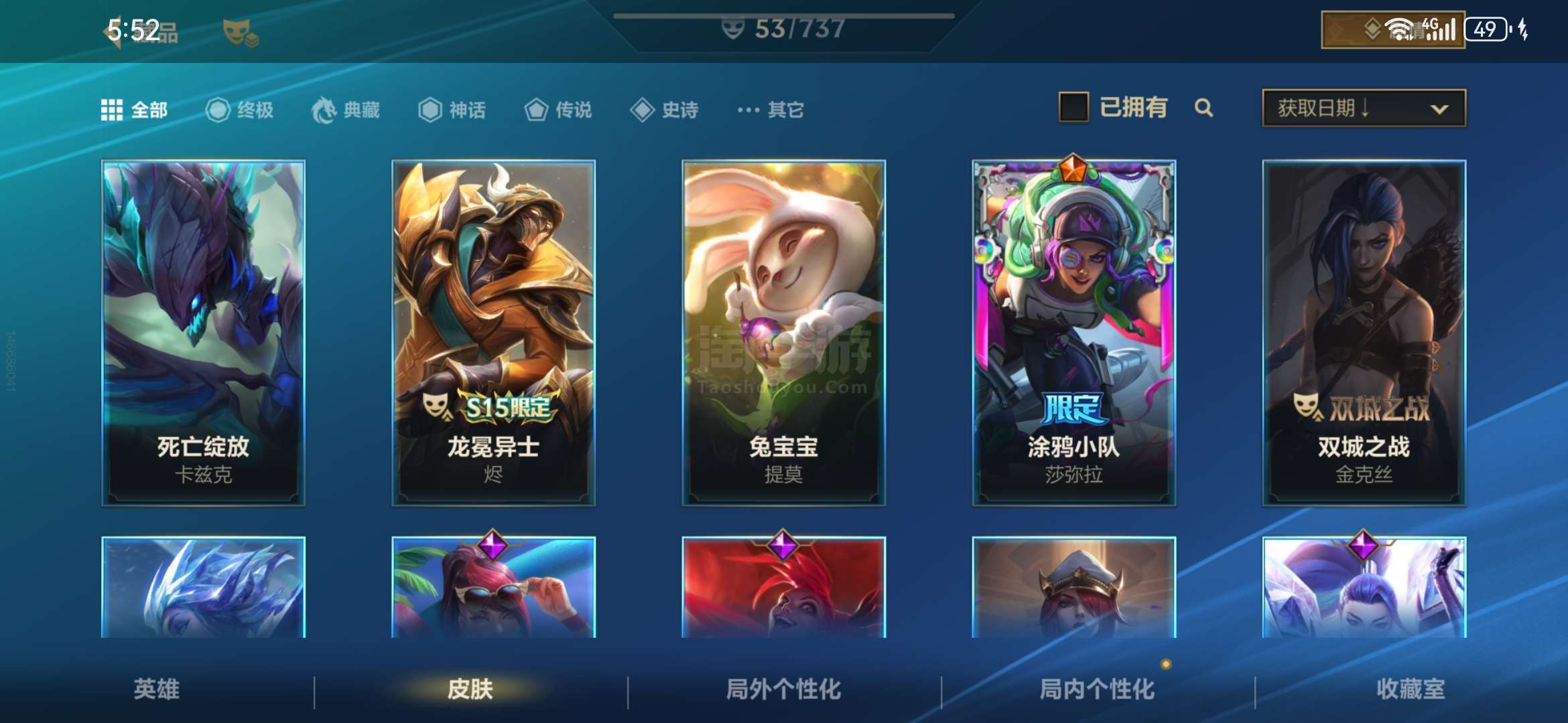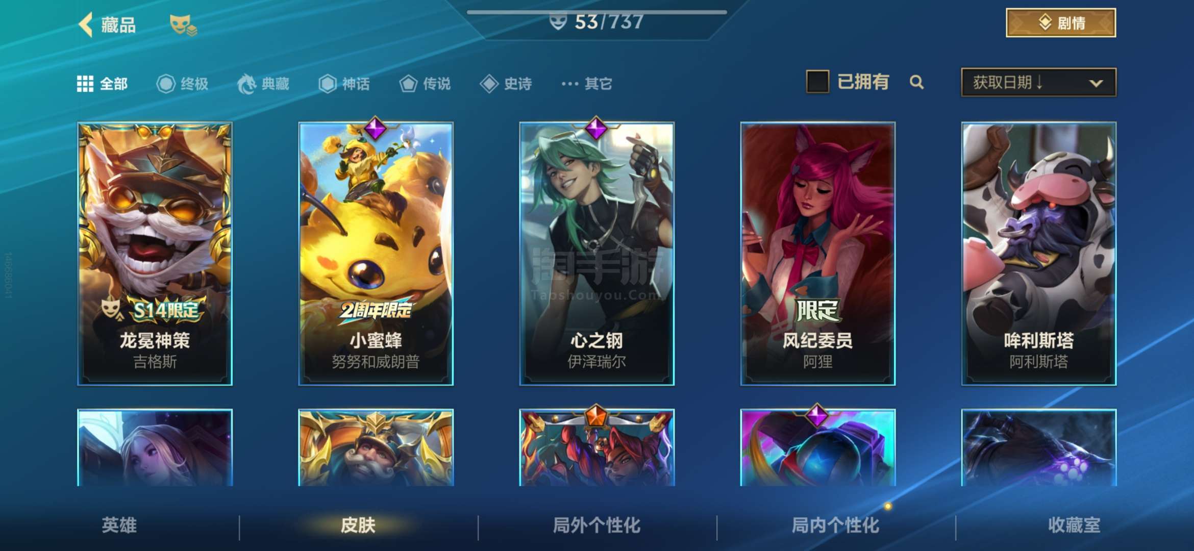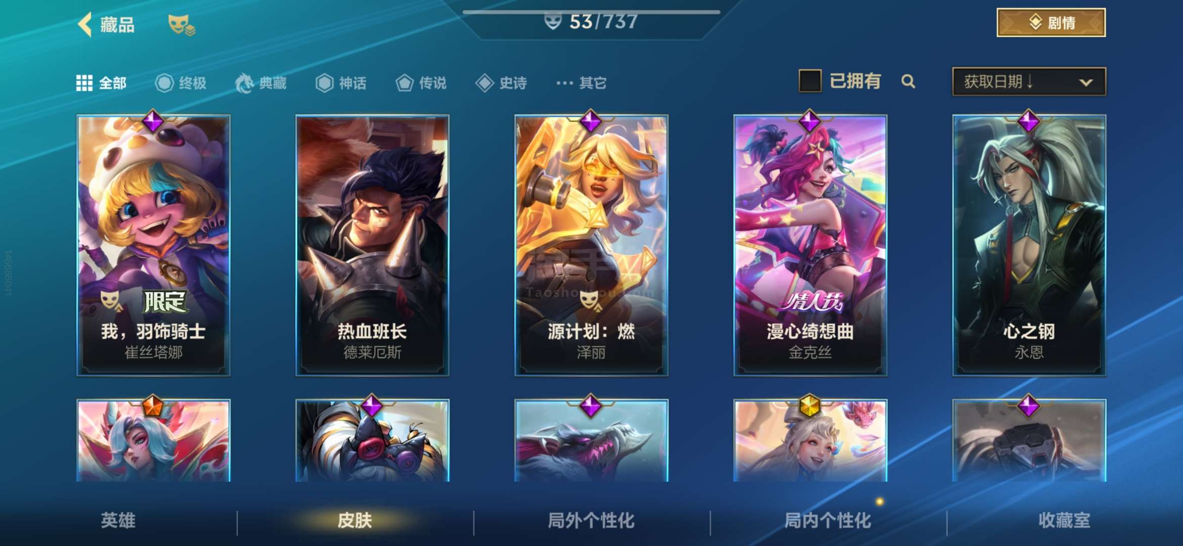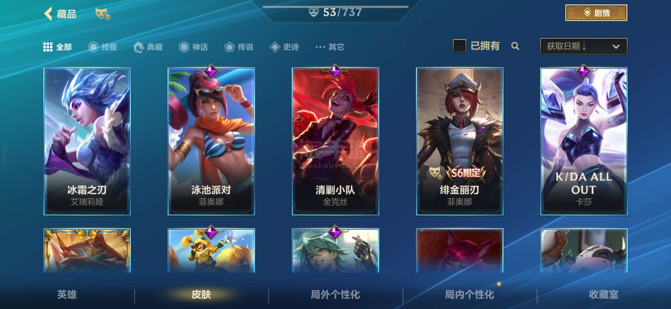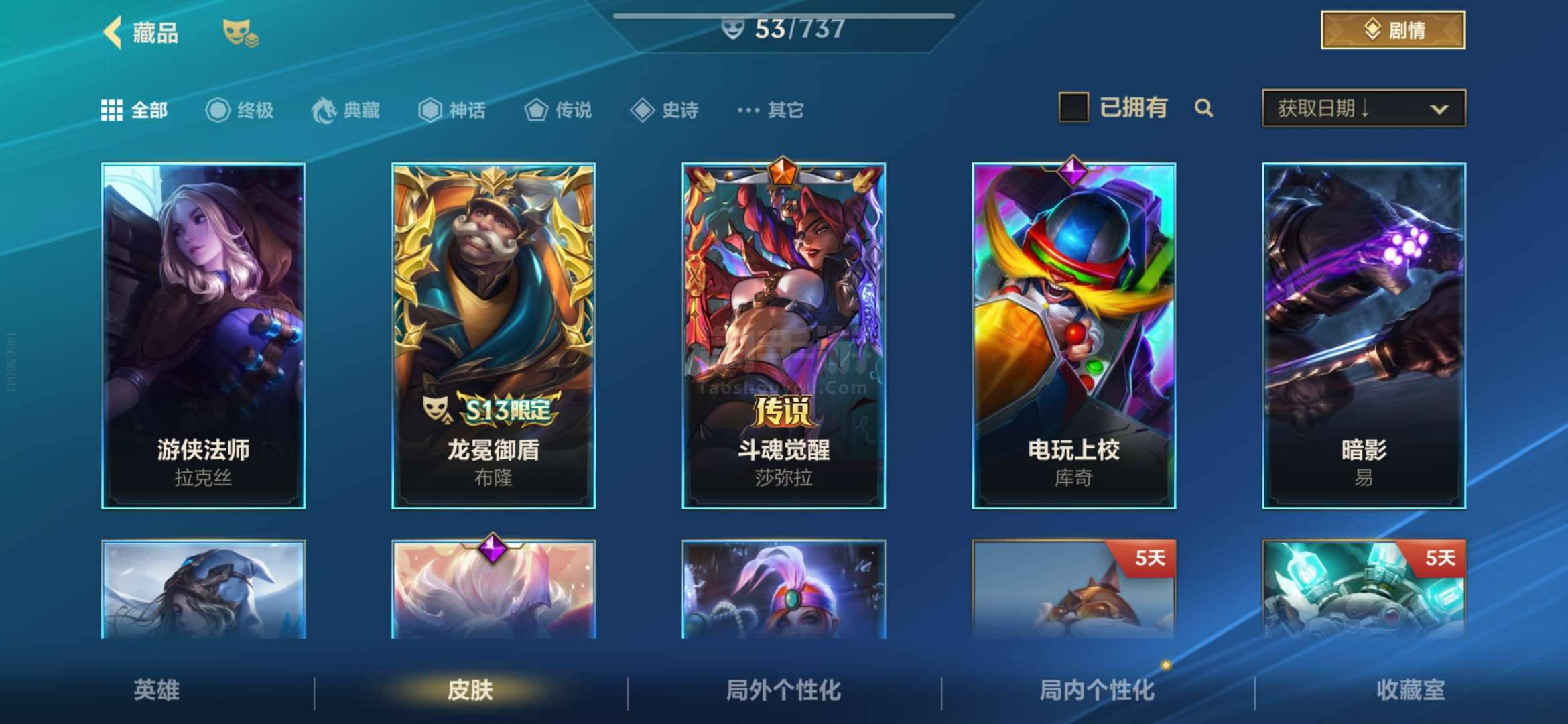 安卓QQ 传说皮肤数量:6 神话皮肤数量:2 皮肤数量:53 英雄数量:60 多传说 限定 高质量史诗
