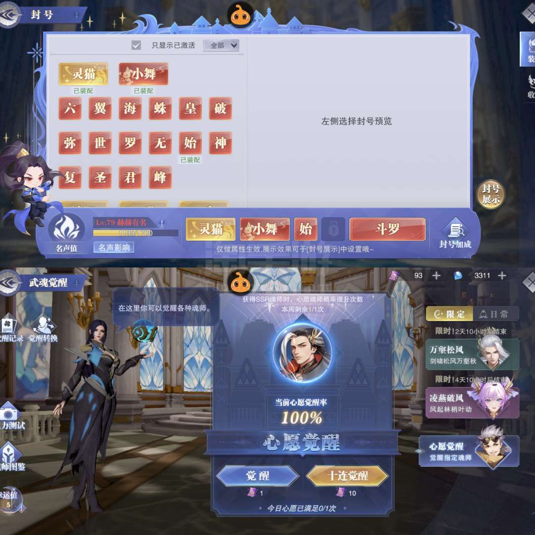 140亿战力,魂圣79级。93抽3千钻石。2翅膀双神唐三19sp。1魂铠核心。黑丝大雪皮。4专千