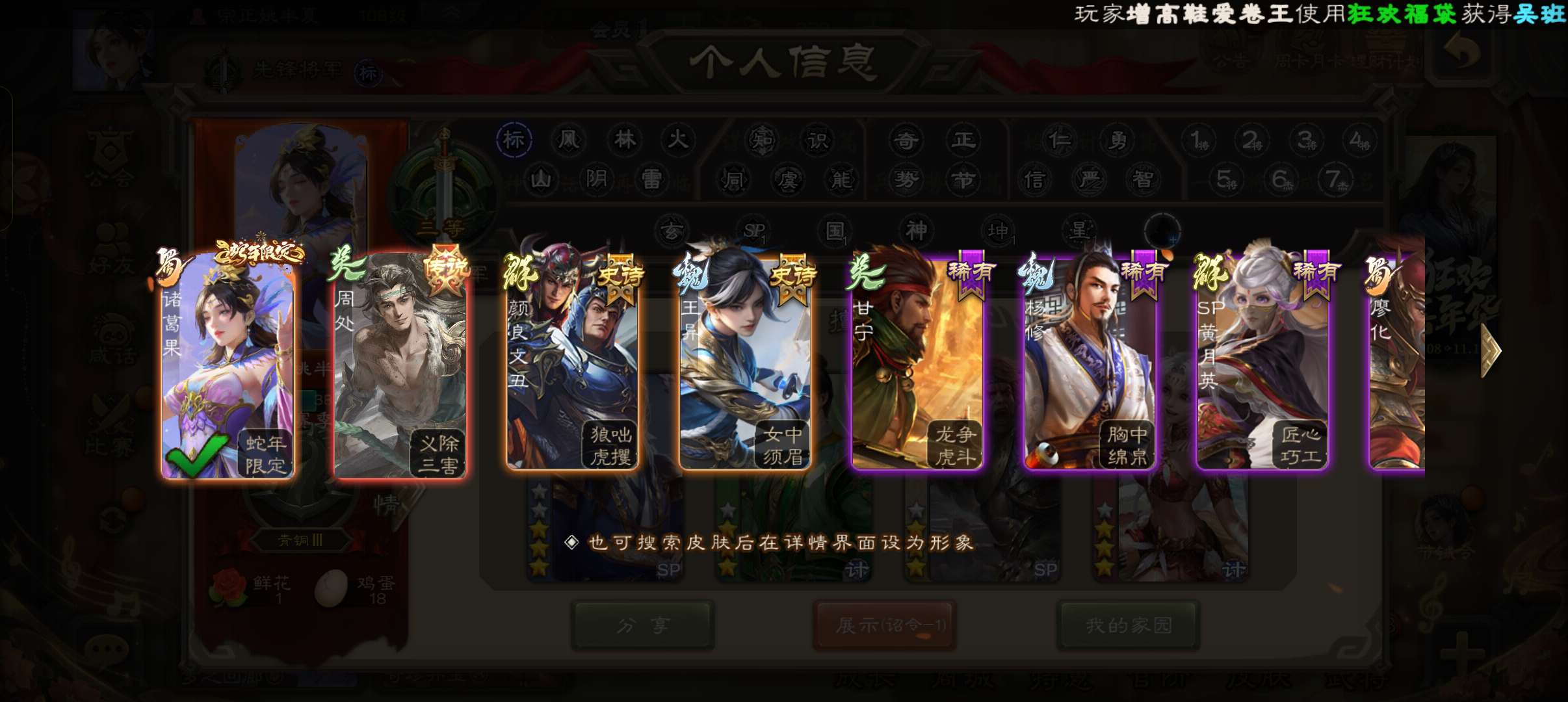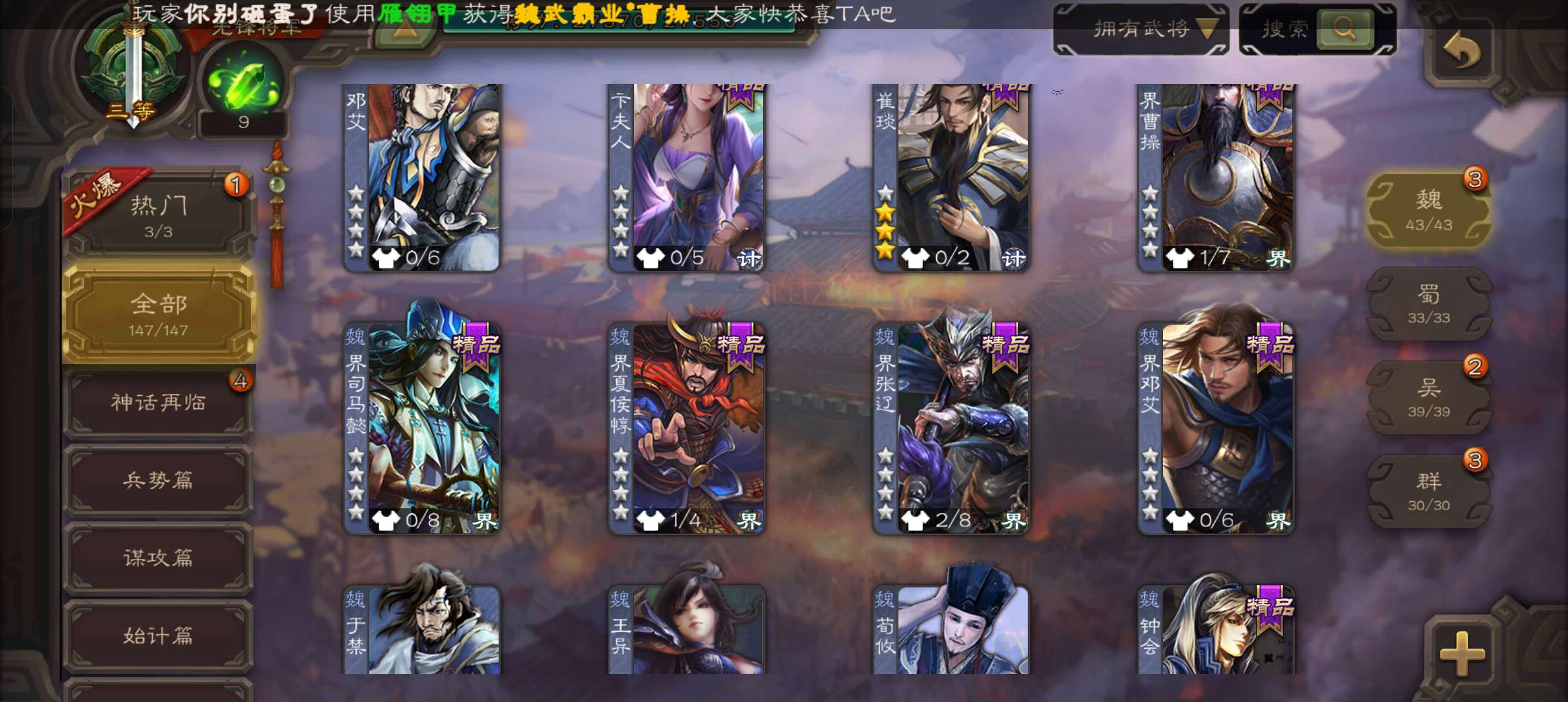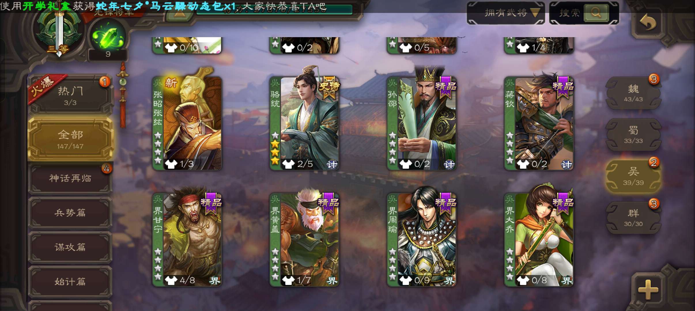 8万3羽毛6万4豆,带皮骆统带皮戏志才白马花鬘谯周杨修6史诗先锋,神吕蒙神周瑜界满宠谋高顺147将