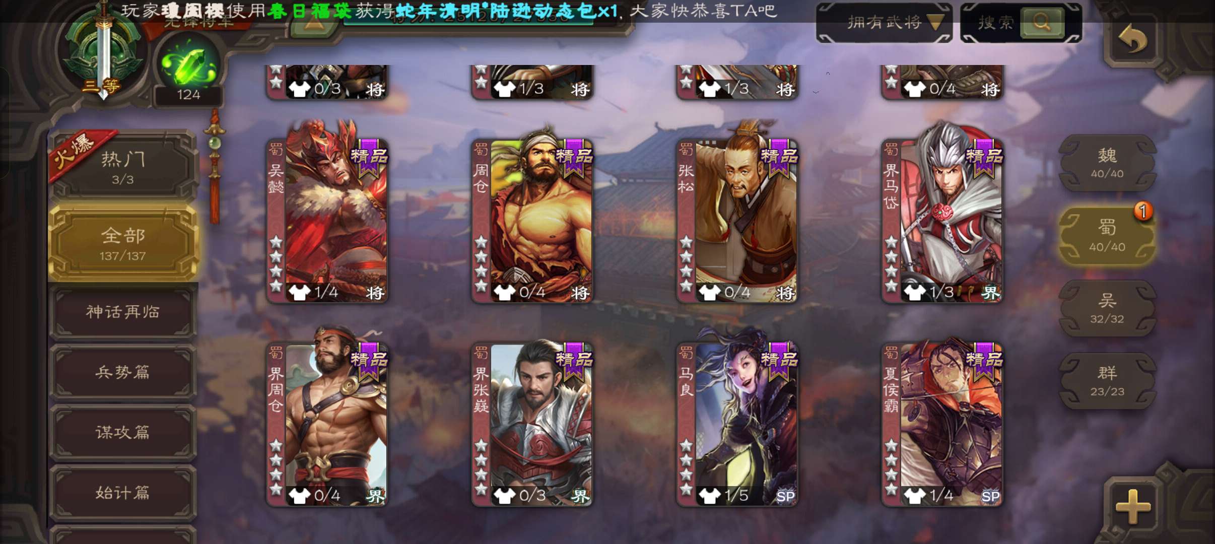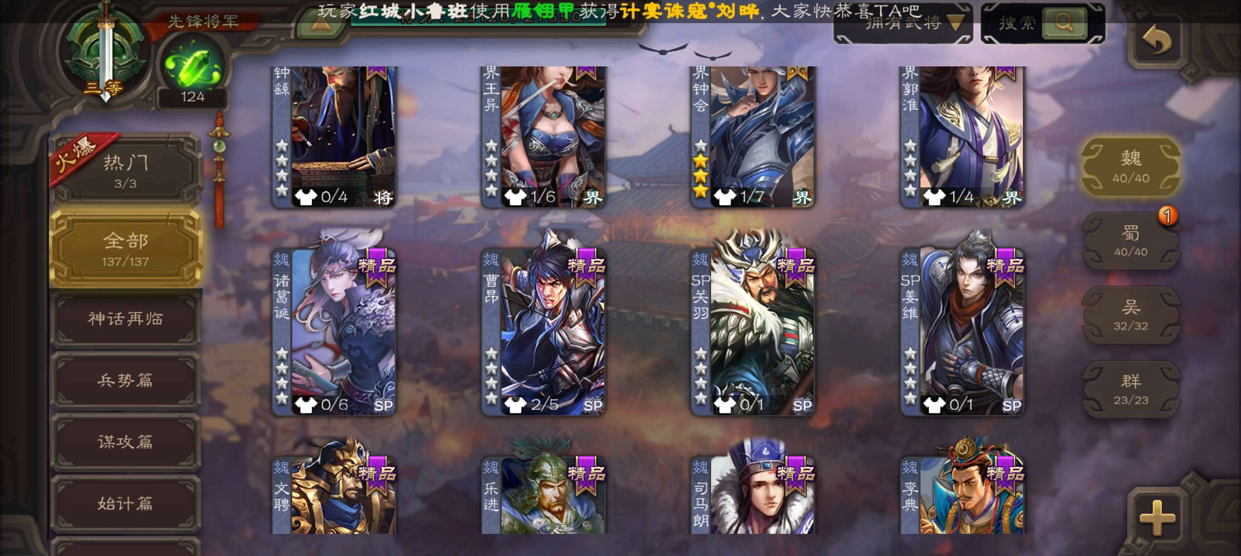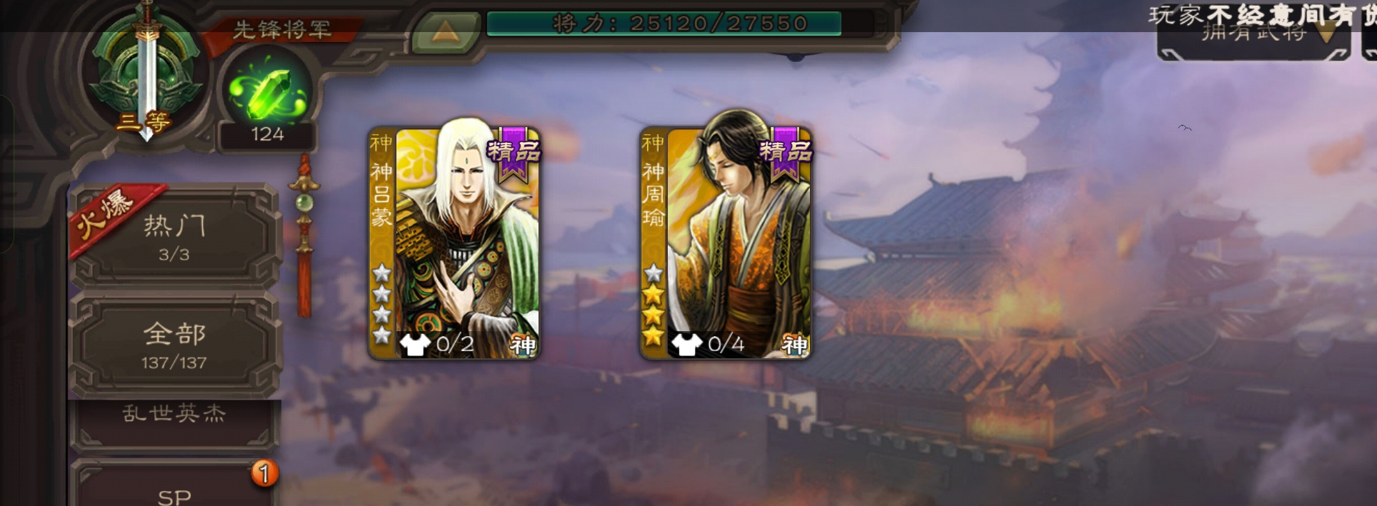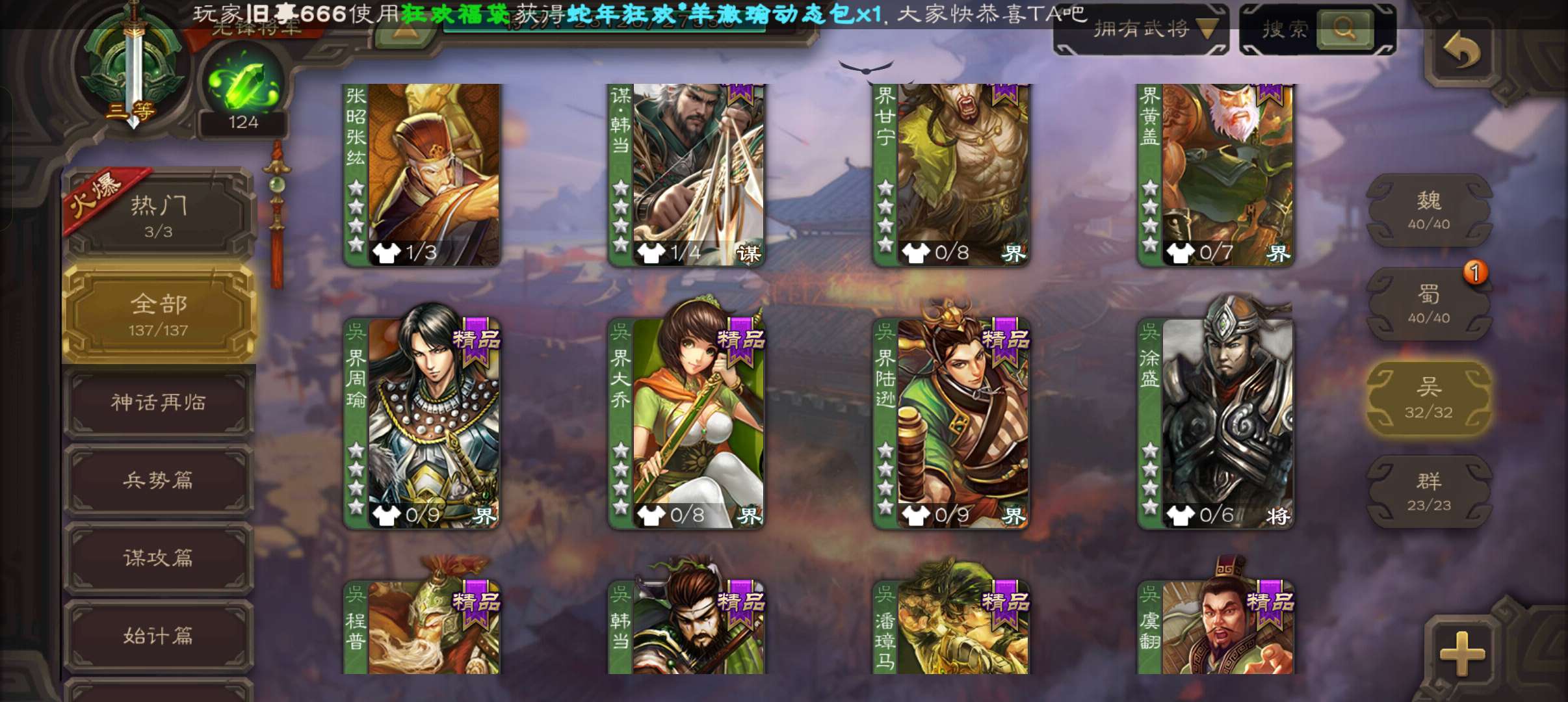 3史诗双神先锋,乌鸦动态界钟会白马谯周,神周瑜神吕蒙谋韩当崔琰彭恙137将