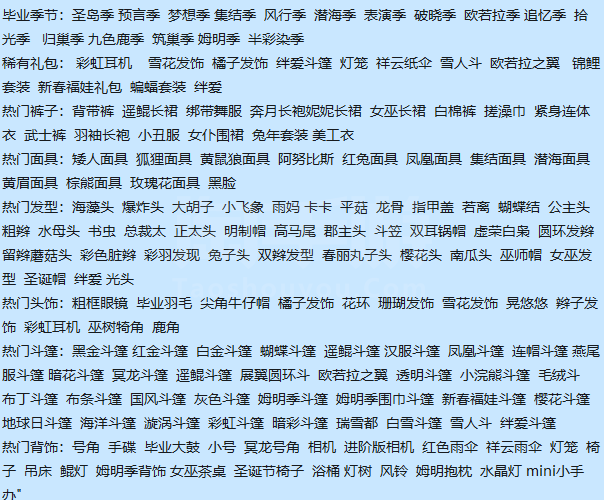 毕业季节:圣岛季 预言季 梦想季 集结季 风行季 潜海季 表演季 破晓季 欧若拉季 追忆季 拾光季 归巢季 九色鹿季 筑巢季 姆明季 半彩染季
