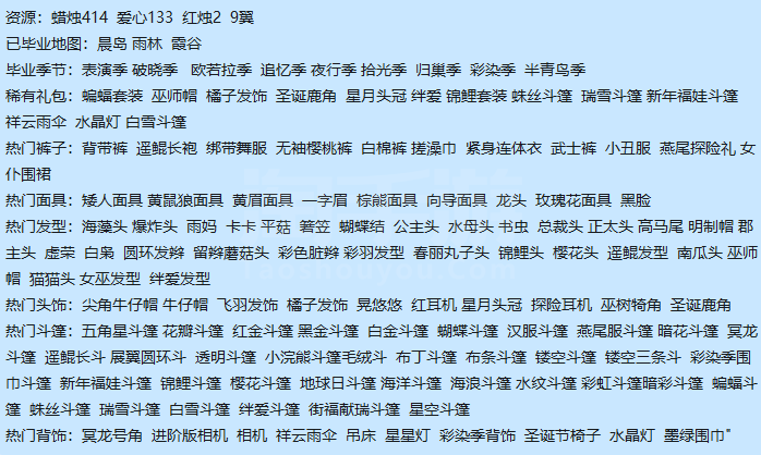稀有礼包:蝙蝠套装 巫师帽 橘子发饰 圣诞鹿角 星月头冠 绊爱 锦鲤套装 蛛丝斗篷 瑞雪斗