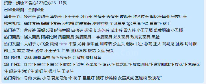 稀有礼包:福娃套装 蝙蝠斗套装 巫师帽 绊爱套装 巫树枯枝 圣诞鹿角 tgc黑底斗篷 白雪斗