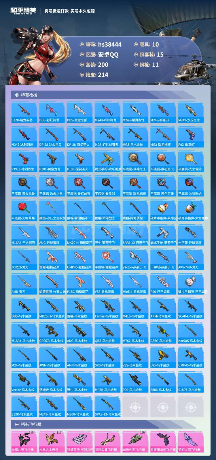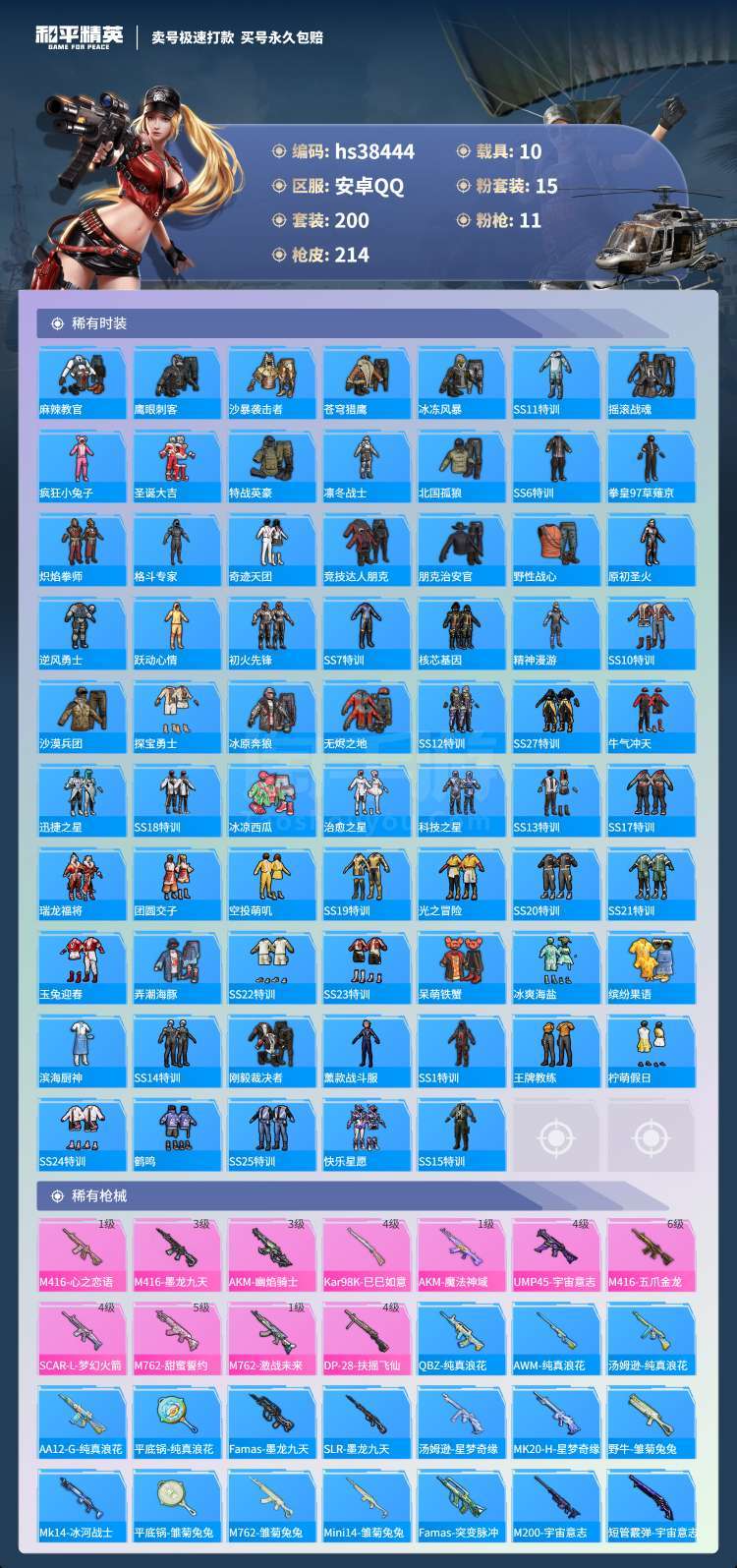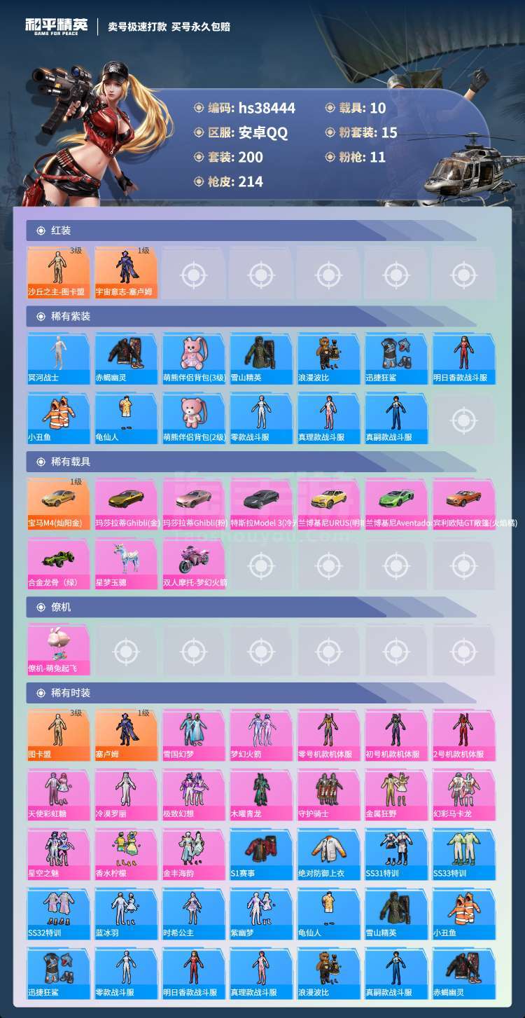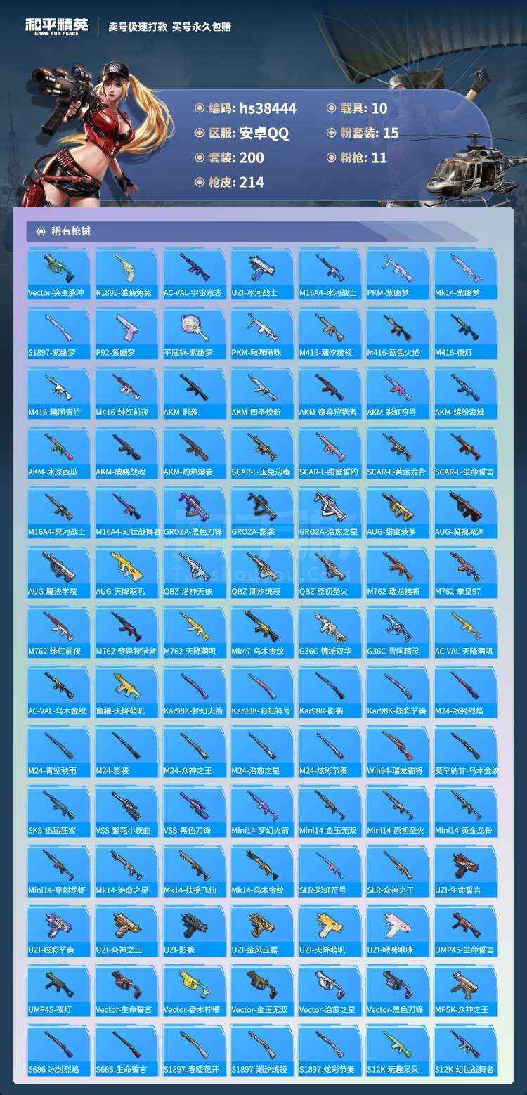 和平精英【安卓QQ】hs38444 安卓手Q-22王牌印记-有战神框-15粉装-11特效枪-10载具-106668热力值
