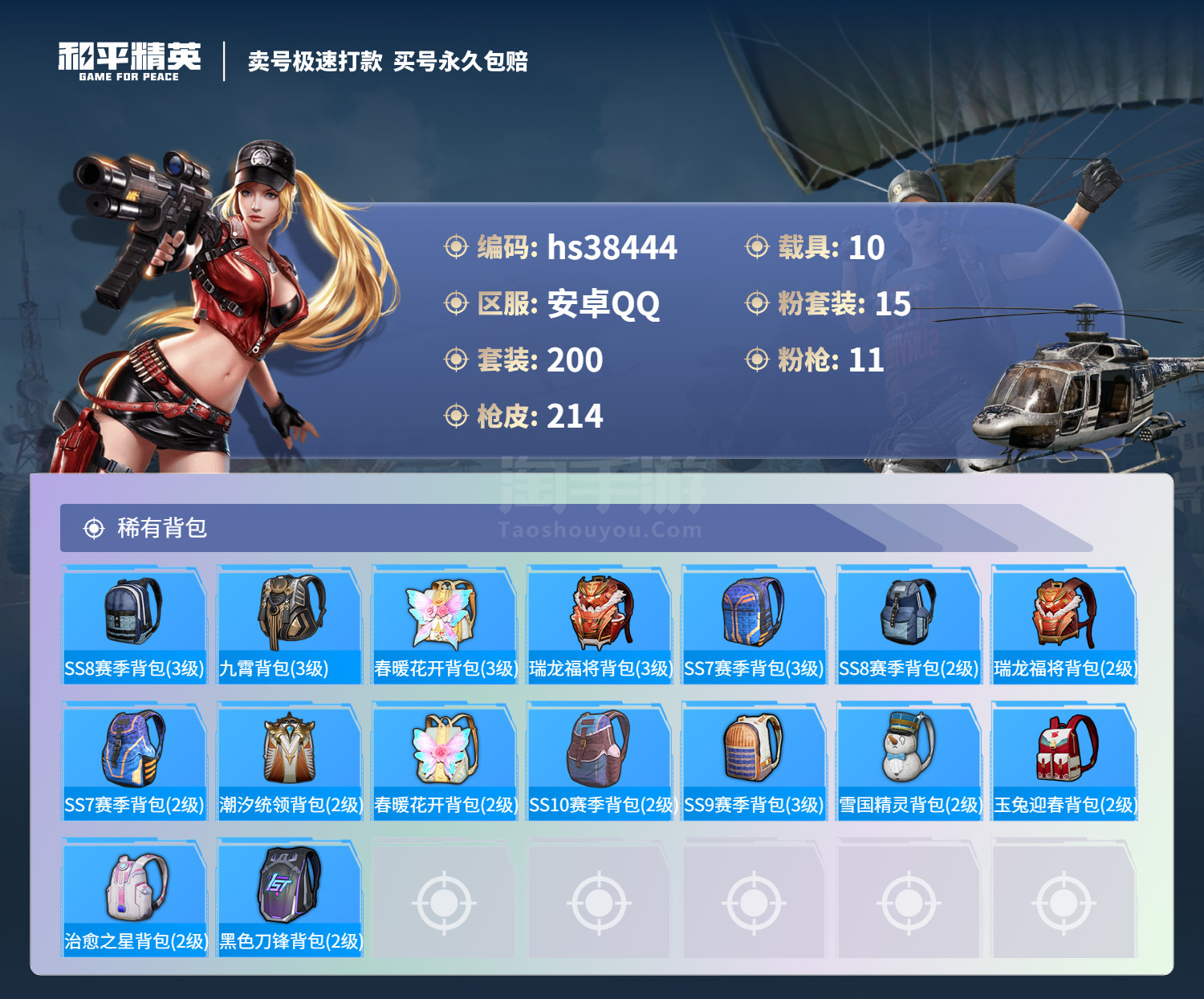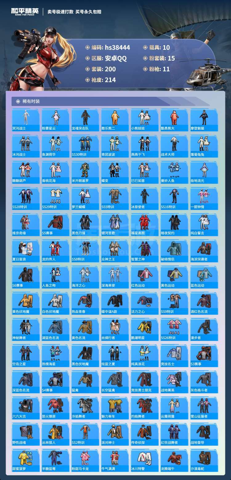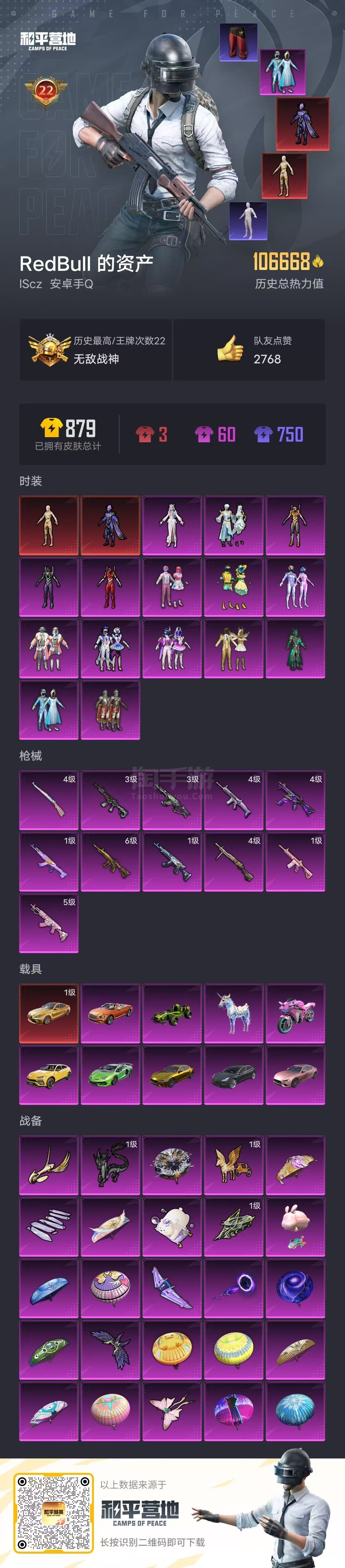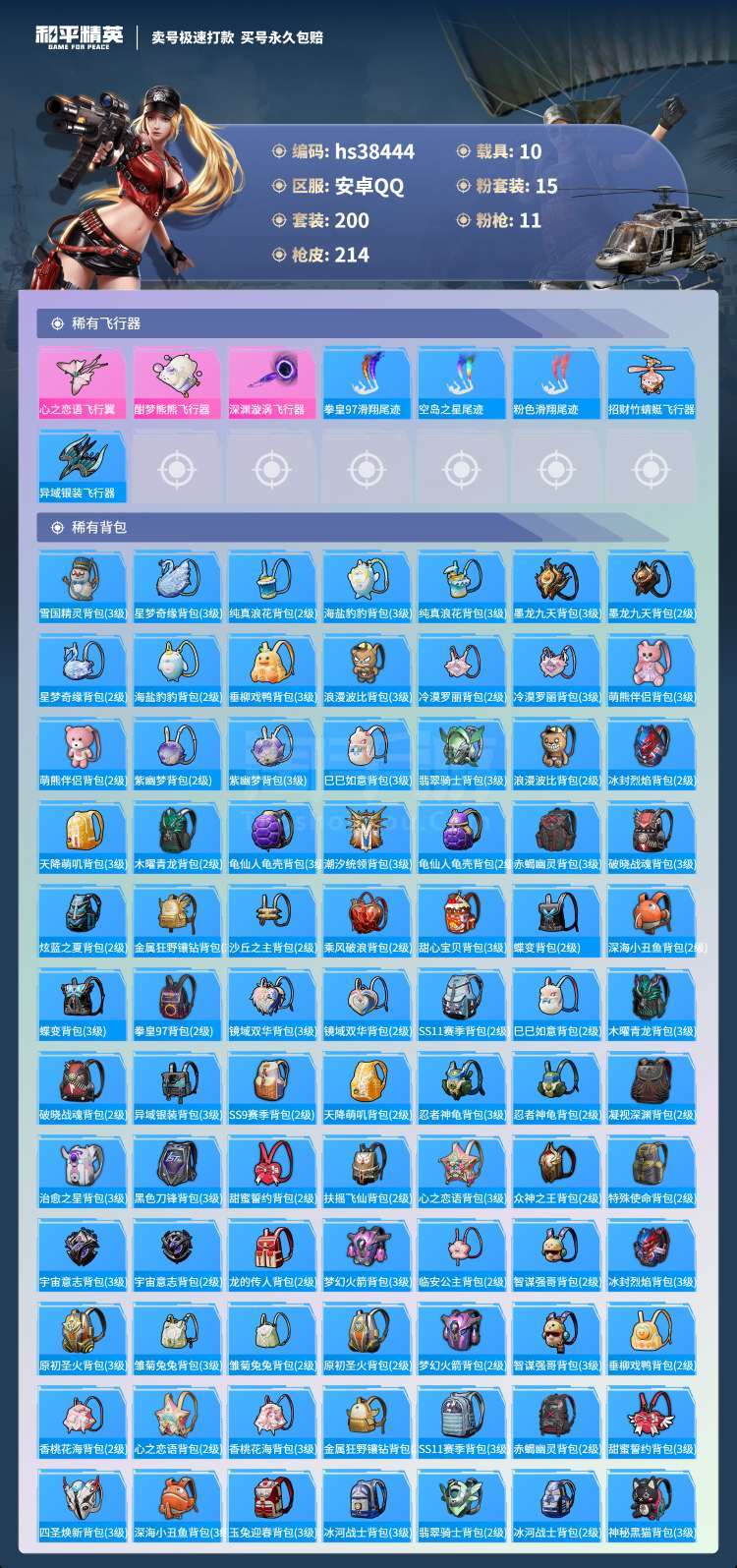 和平精英【安卓QQ】hs38444 安卓手Q-22王牌印记-有战神框-15粉装-11特效枪-10载具-106668热力值
