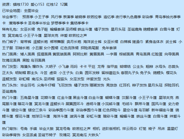毕业季节: 预言季 小王子季 风行季 表演季 破晓季 欧若拉季 追忆季 夜行季九色鹿季 彩染季 青鸟季拾光季季卡 潜海季季卡 圣岛季半毕业 梦想季季卡 集结季季卡